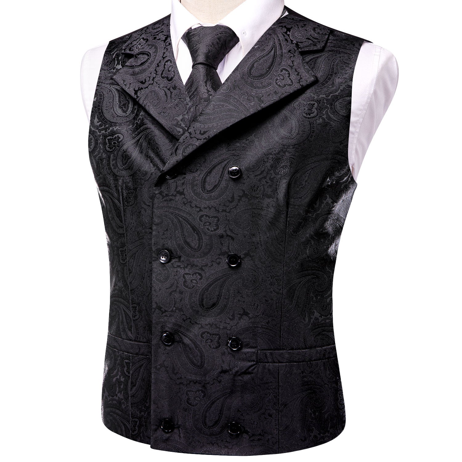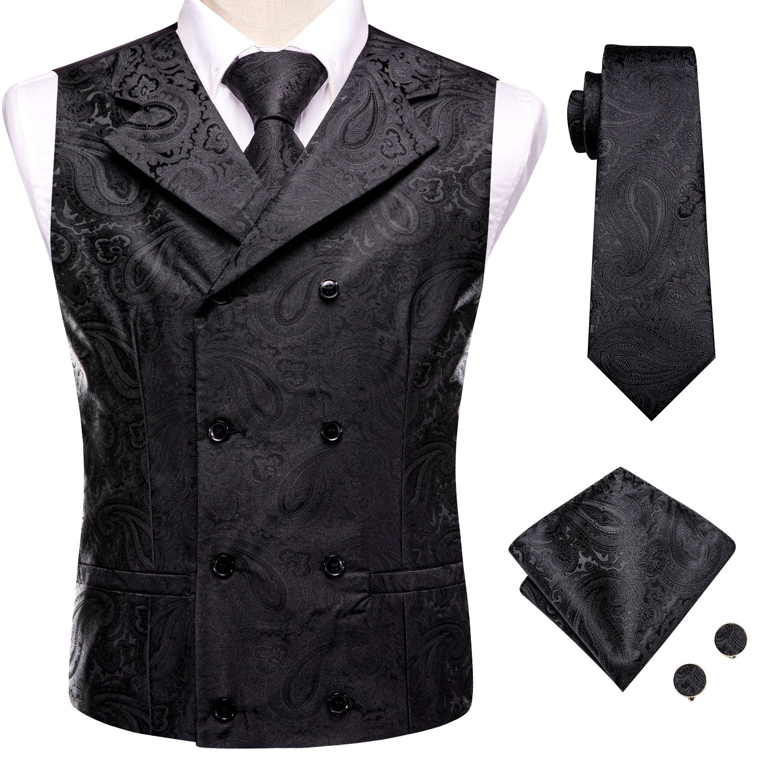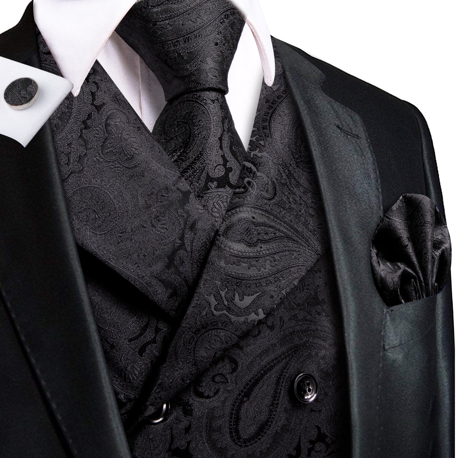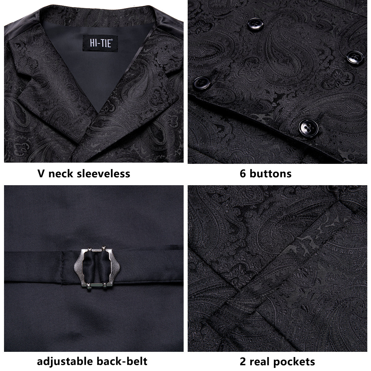 Hi-Tie Black Paisley Jacquard Mens Collar Vest Hanky Cufflinks Tie Set