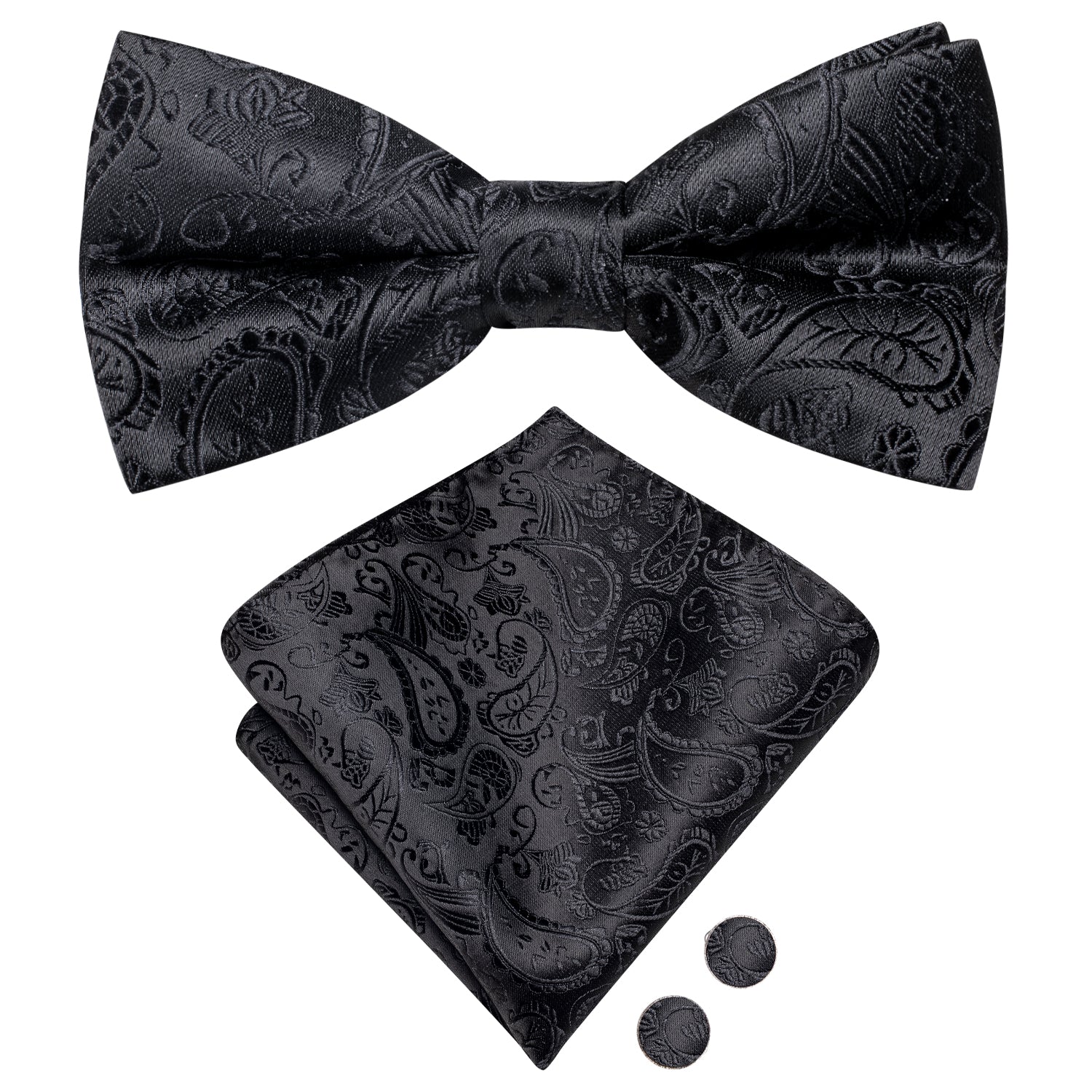 Hi-Tie Black Paisley Silk Pre-tied Mens Bow Tie Hanky Cufflinks Set