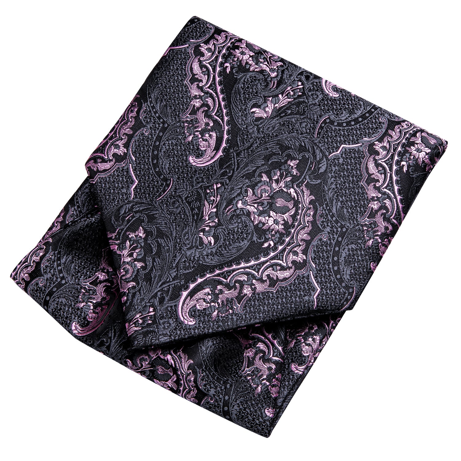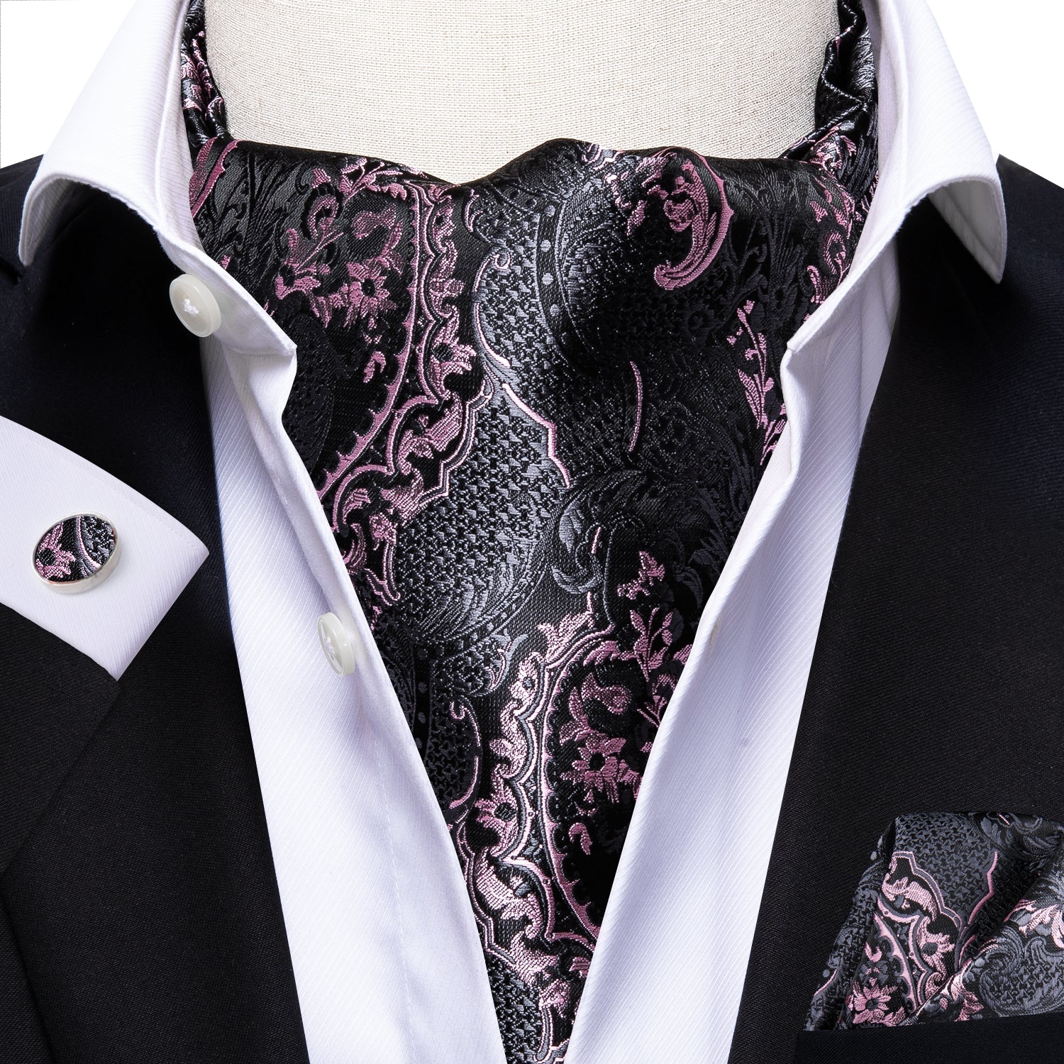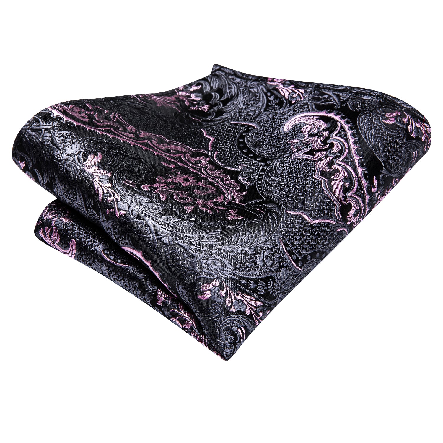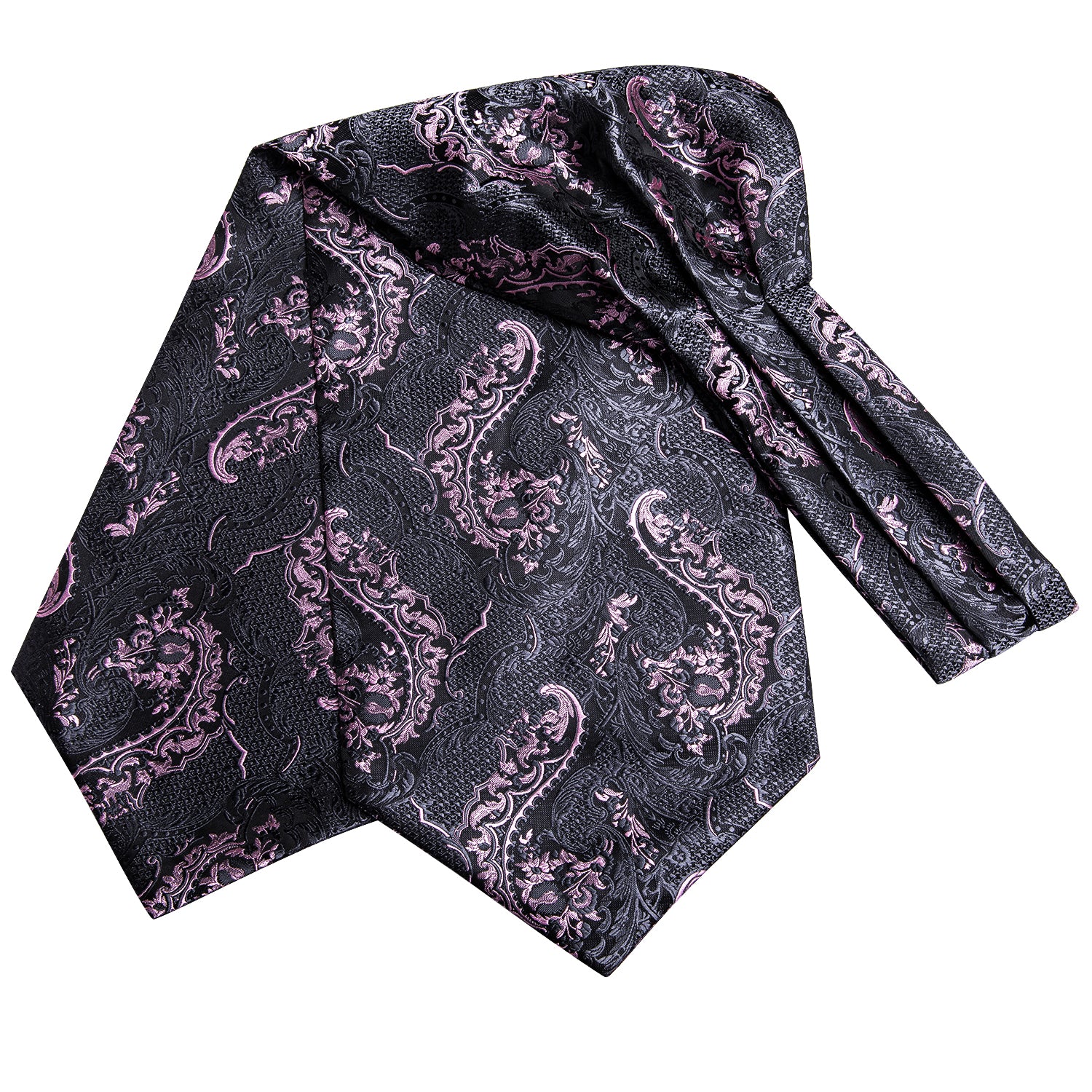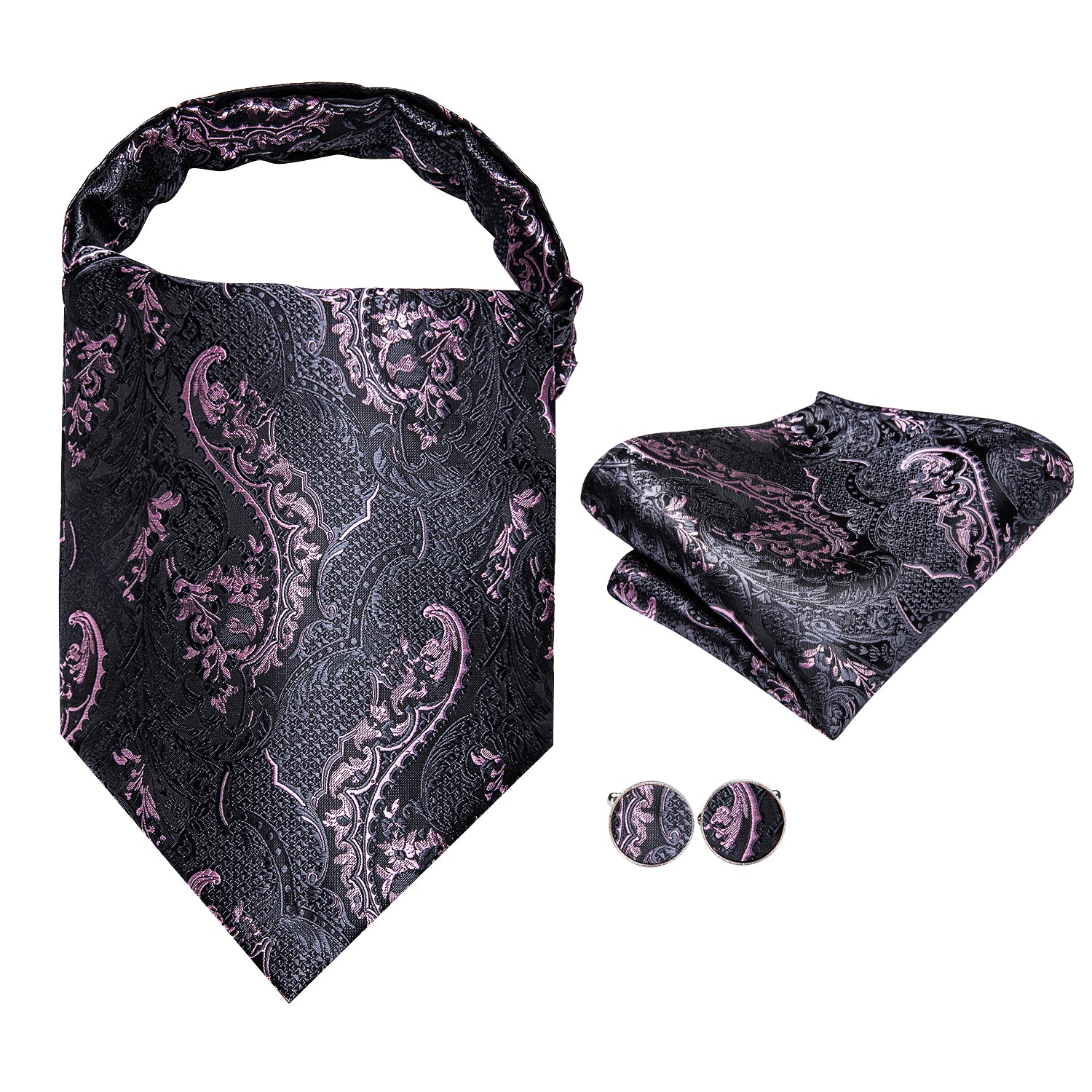 Hi-Tie Black Pink Paisley Ascot Pocket Square Cufflinks Set