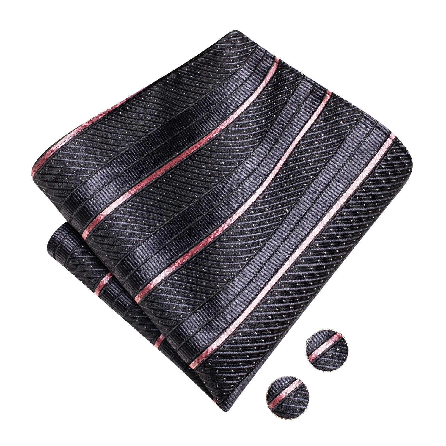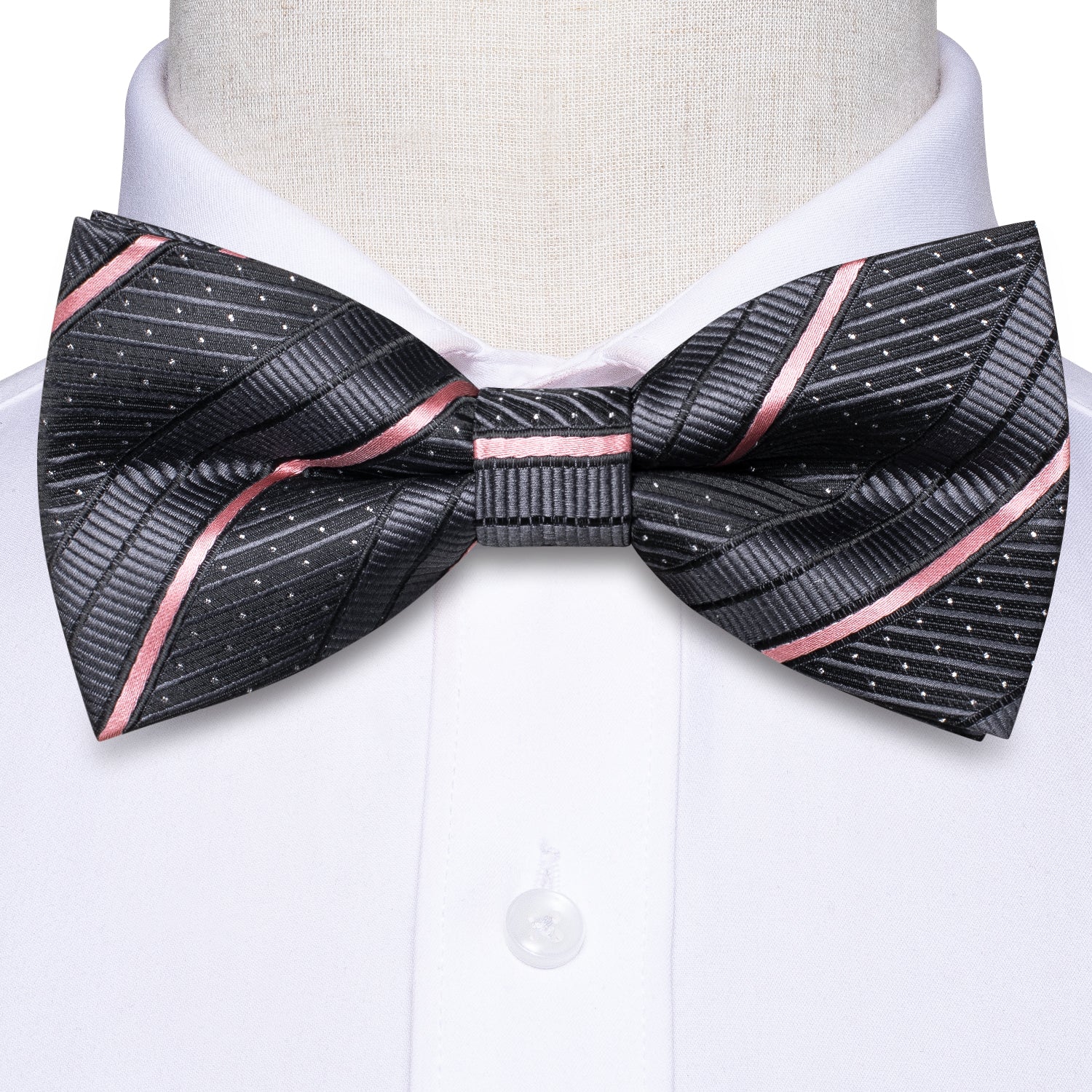 Hi-Tie Black Pink Striped Silk Pre-tied Bow Tie Hanky Cufflinks Set