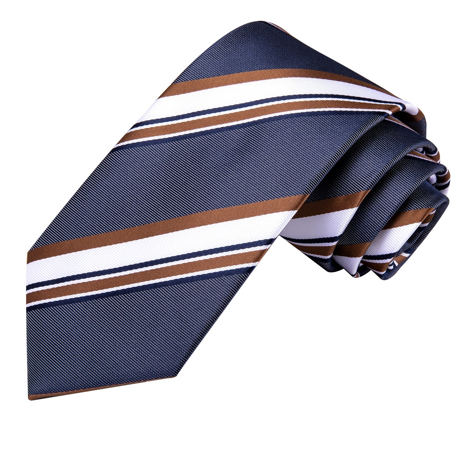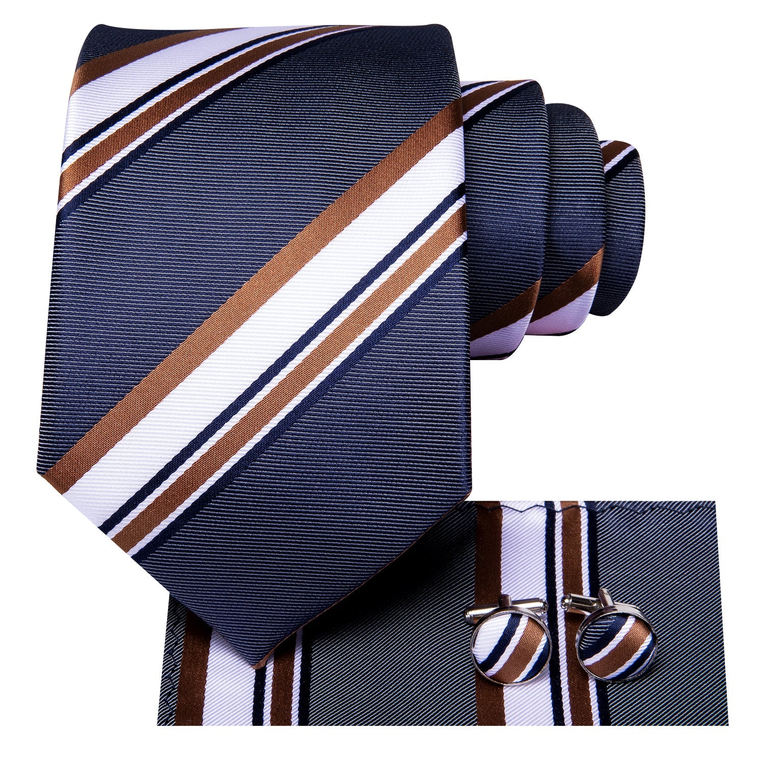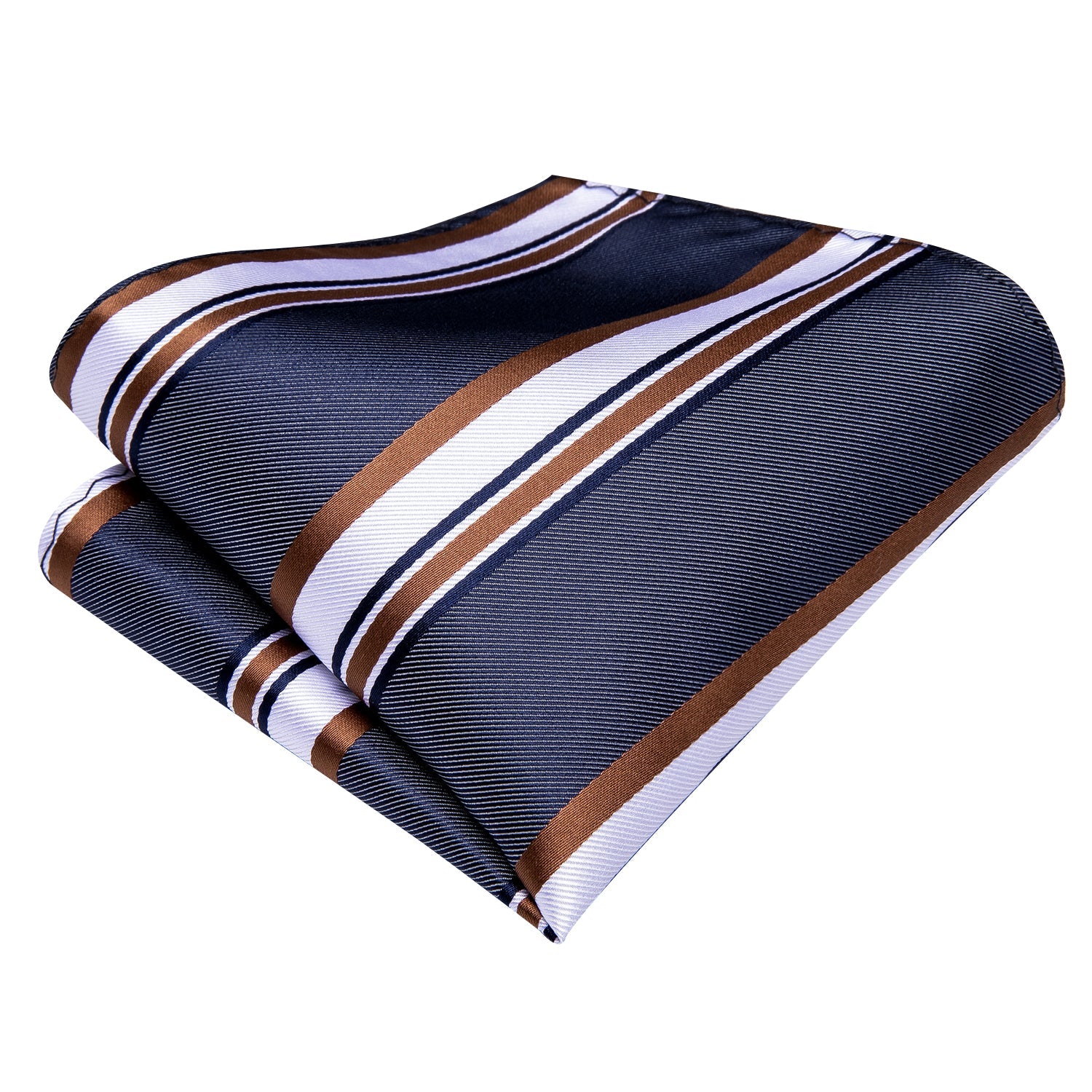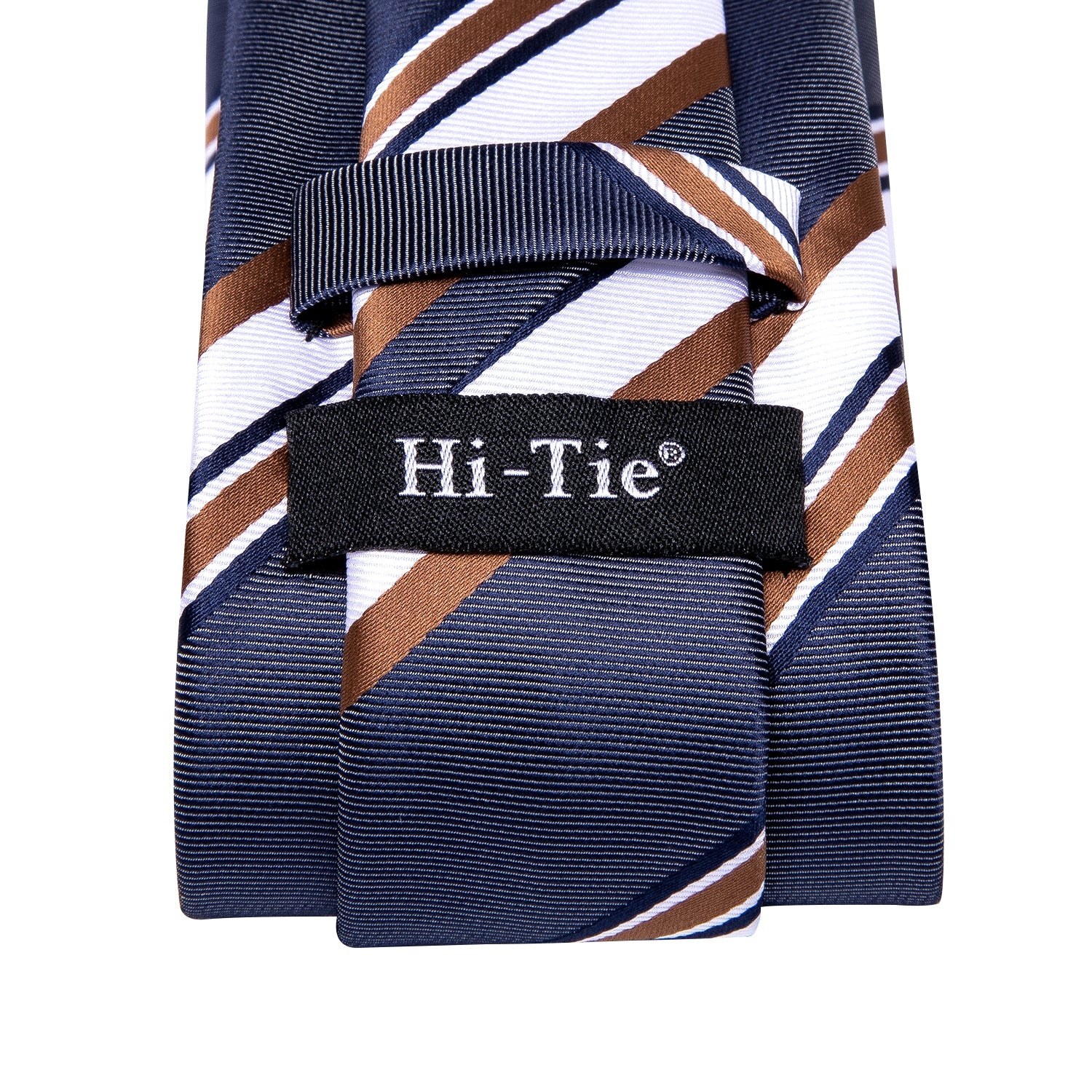 Hi-Tie Blue Brown White Striped Tie Handkerchief Cufflinks Set with Wedding Brooch