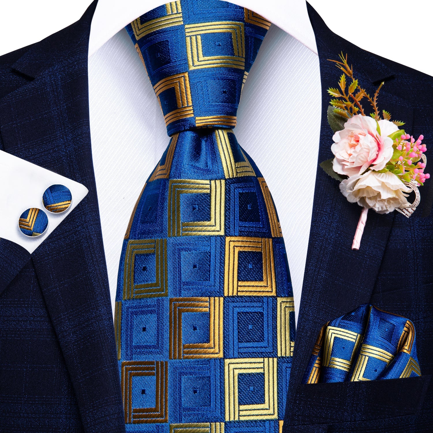 Hi-Tie Blue Tie Gold Plaid Wedding Necktie Pocket Square Cufflinks Set