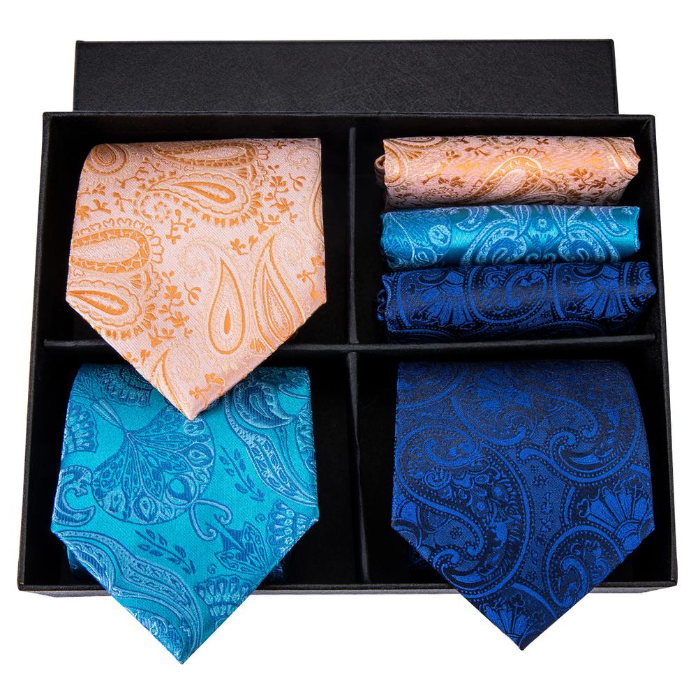 Hi-Tie Blue Orange Paisley Tie Pocket Square Cufflinks Gift Box Set