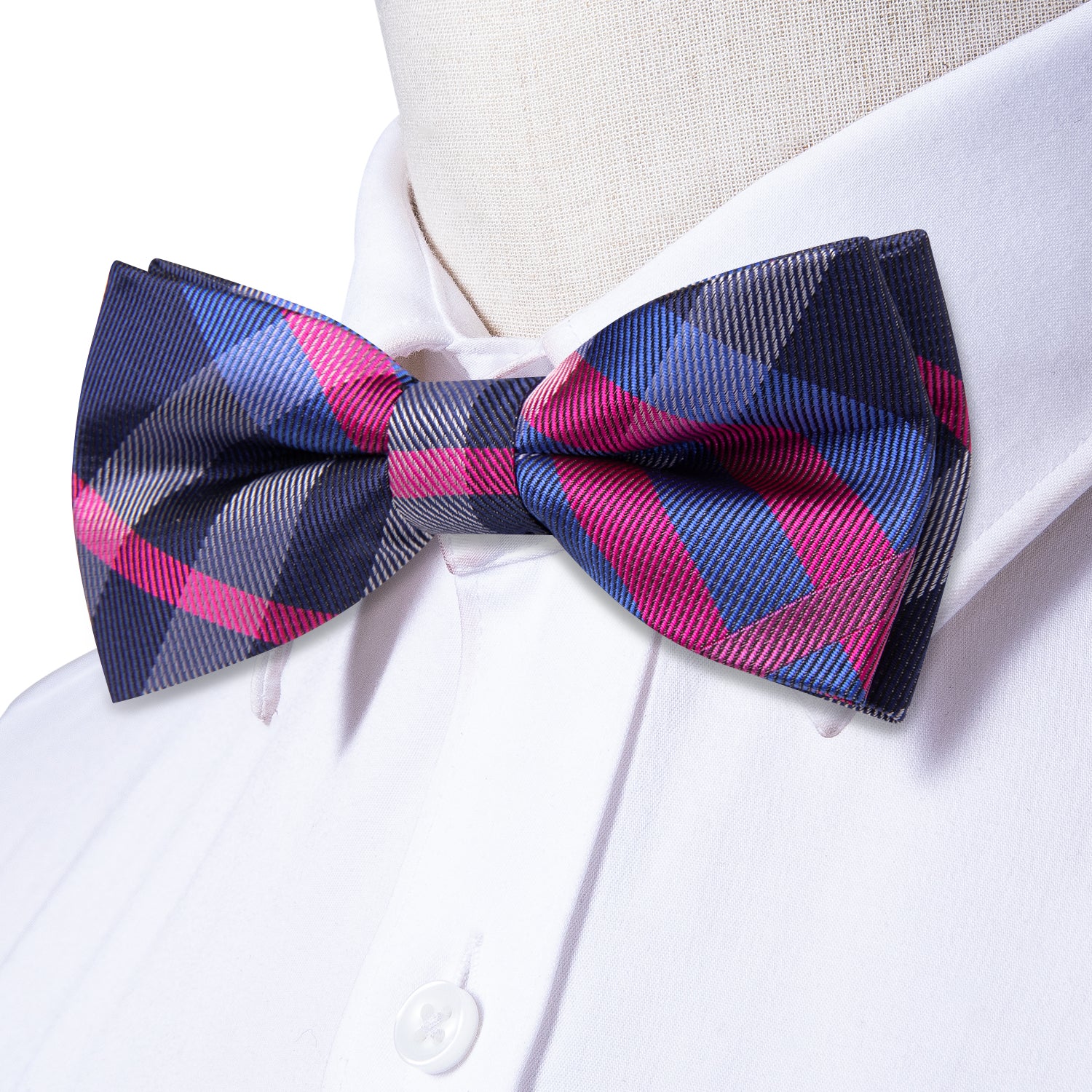 Hi-Tie Blue Pink Plaid Children's Kids Bow Tie Hanky Cufflinks Set