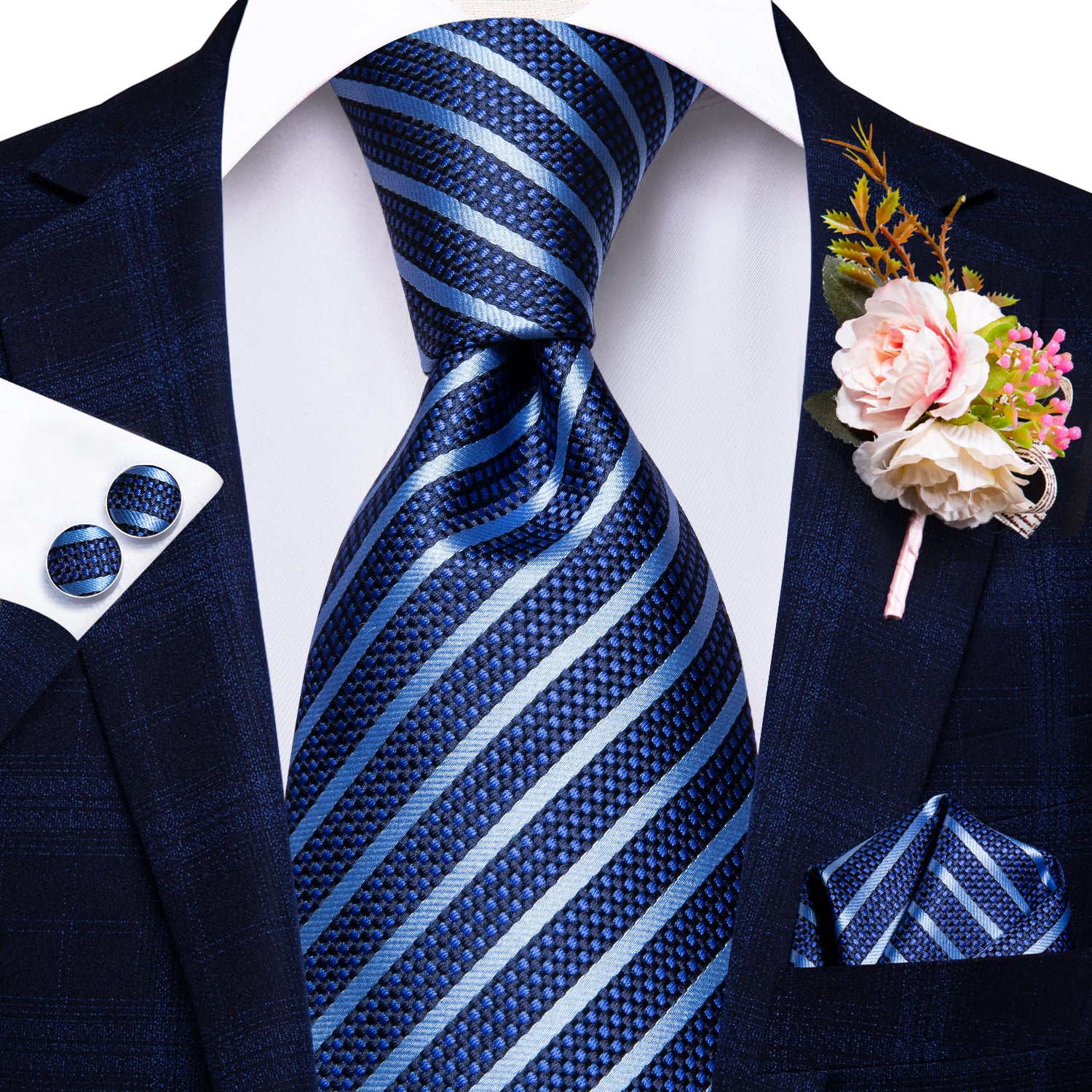 Hi-Tie Blue Striped Tie Handkerchief Cufflinks Set with Wedding Brooch