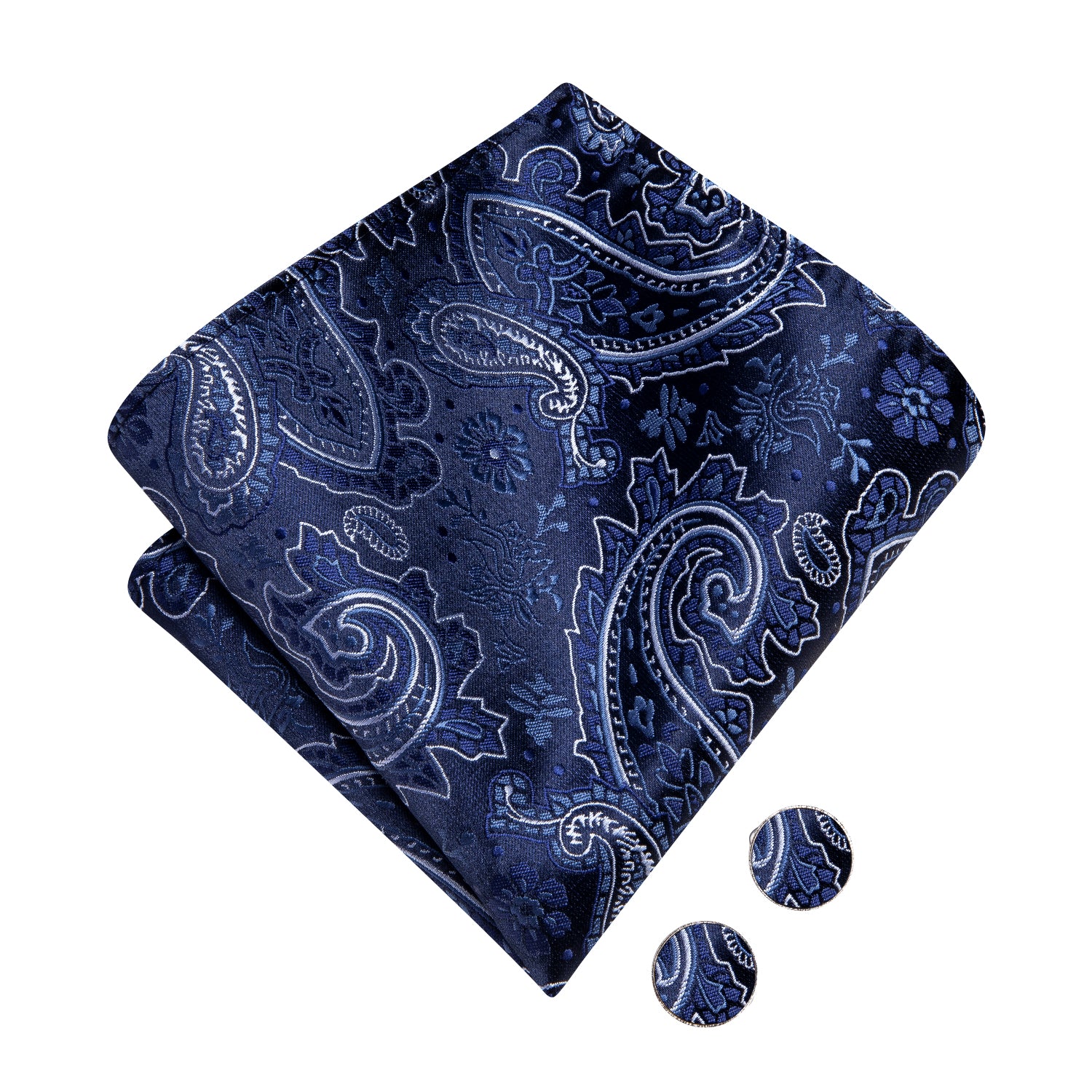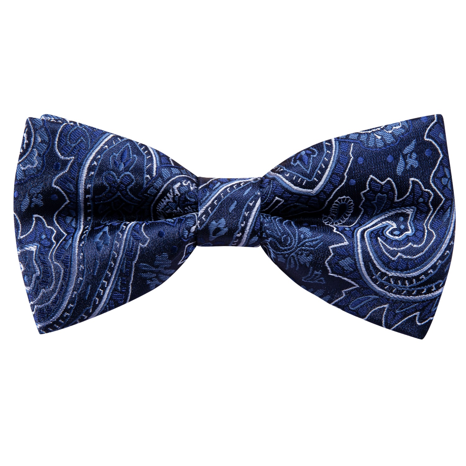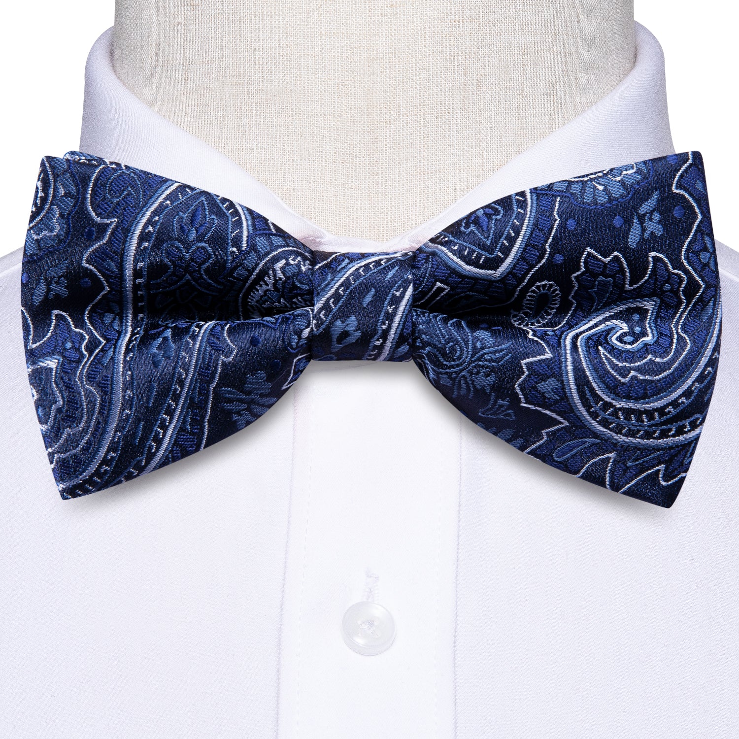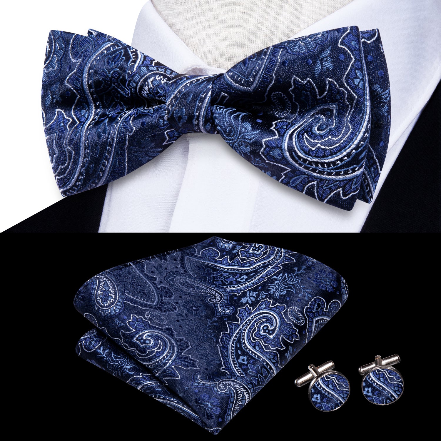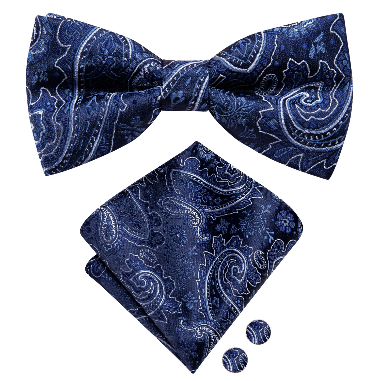 Hi-Tie Blue White Paisley Silk Pre-tied Bow Tie Hanky Cufflinks Set