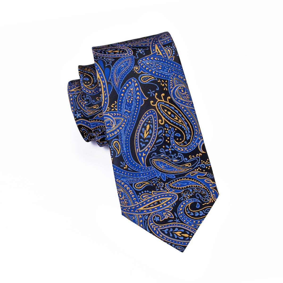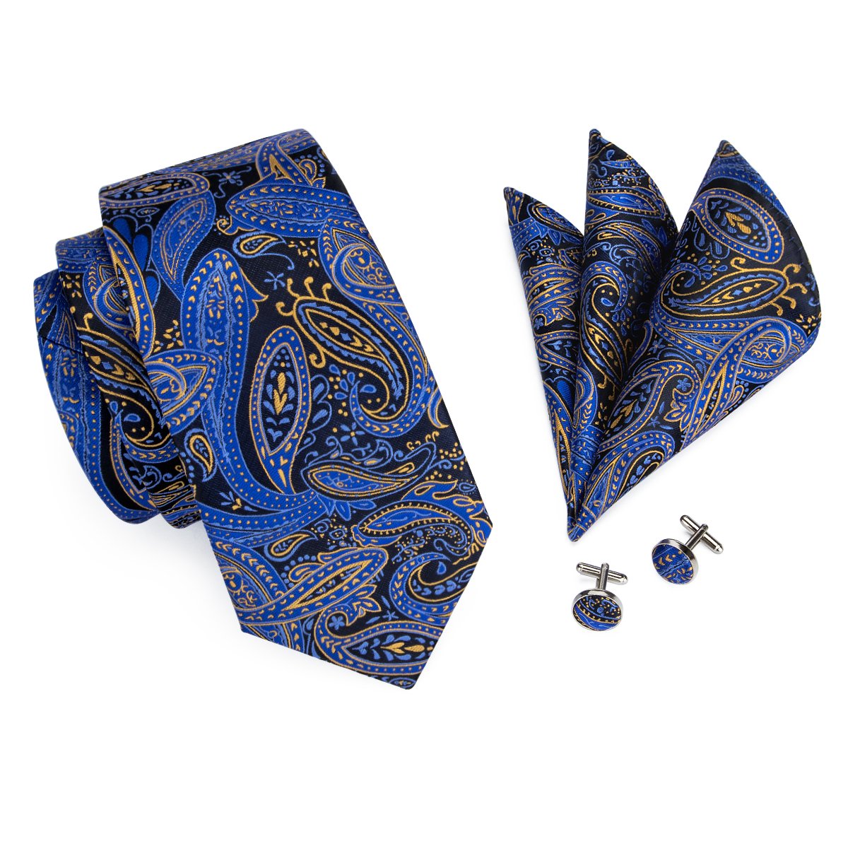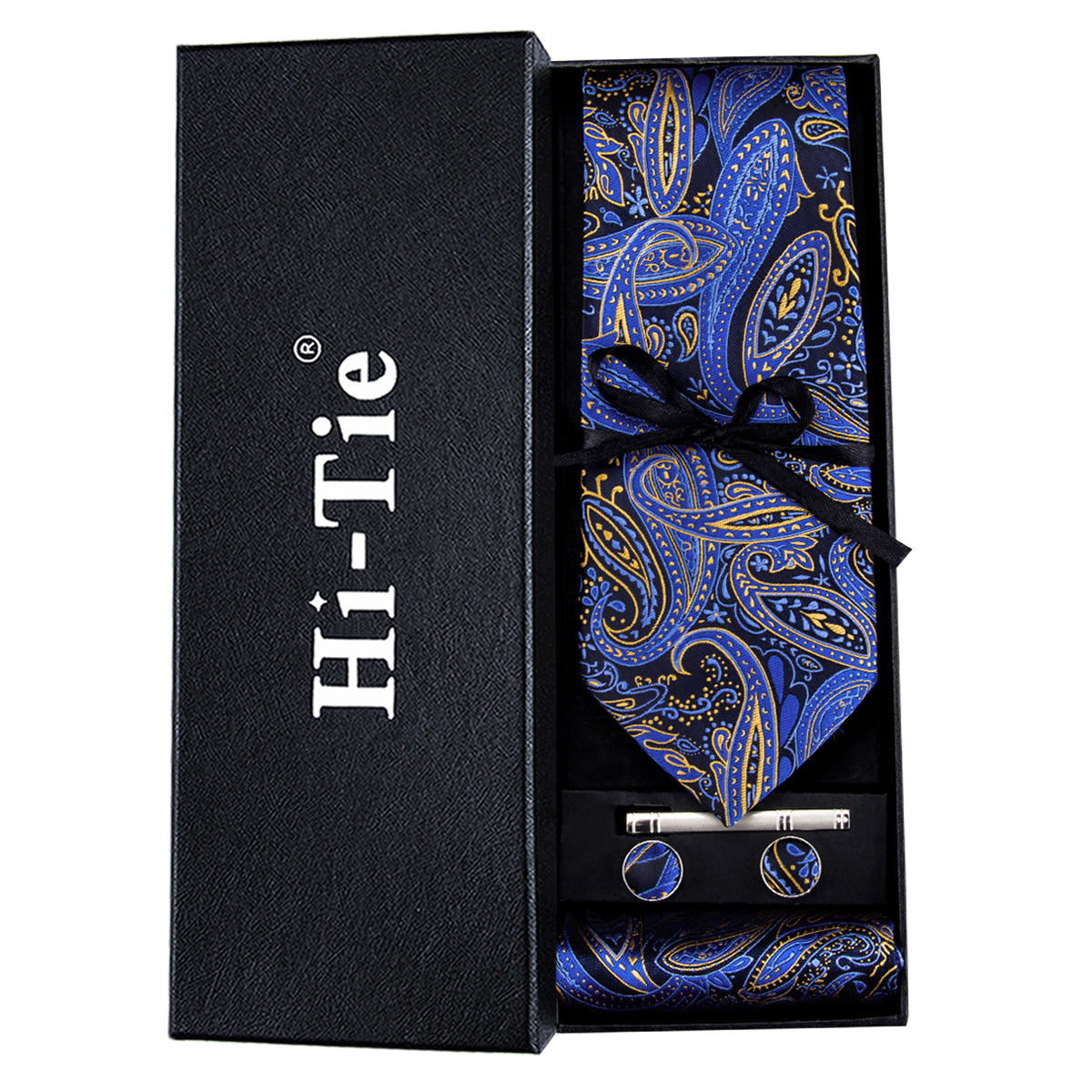 Hi-Tie Blue Yellow Paisley Tie Pocket Square Cufflinks Set Gift Box Set
