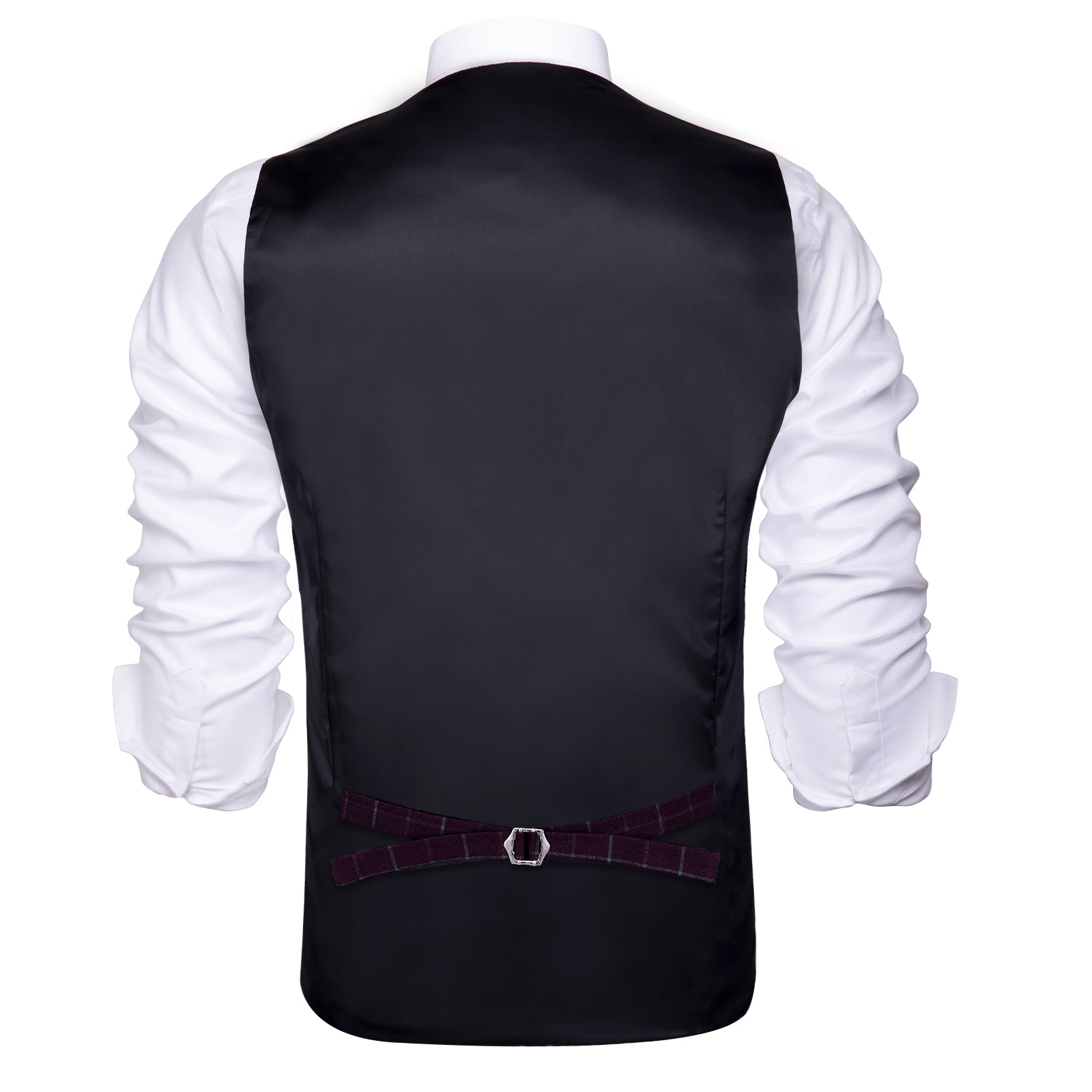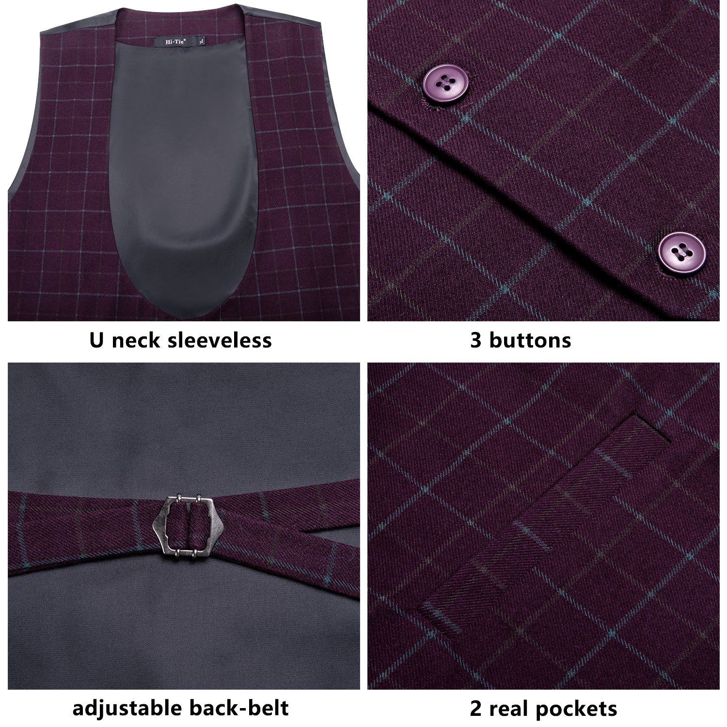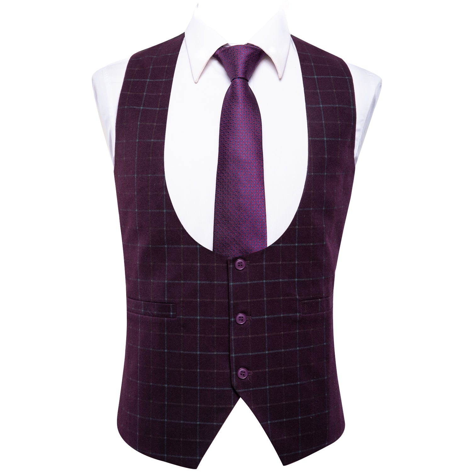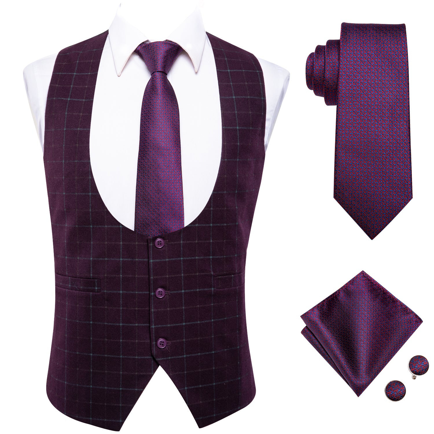 Burgundy Plaid Men's Vest Hanky Cufflinks Tie Set Waistcoat Suit Set