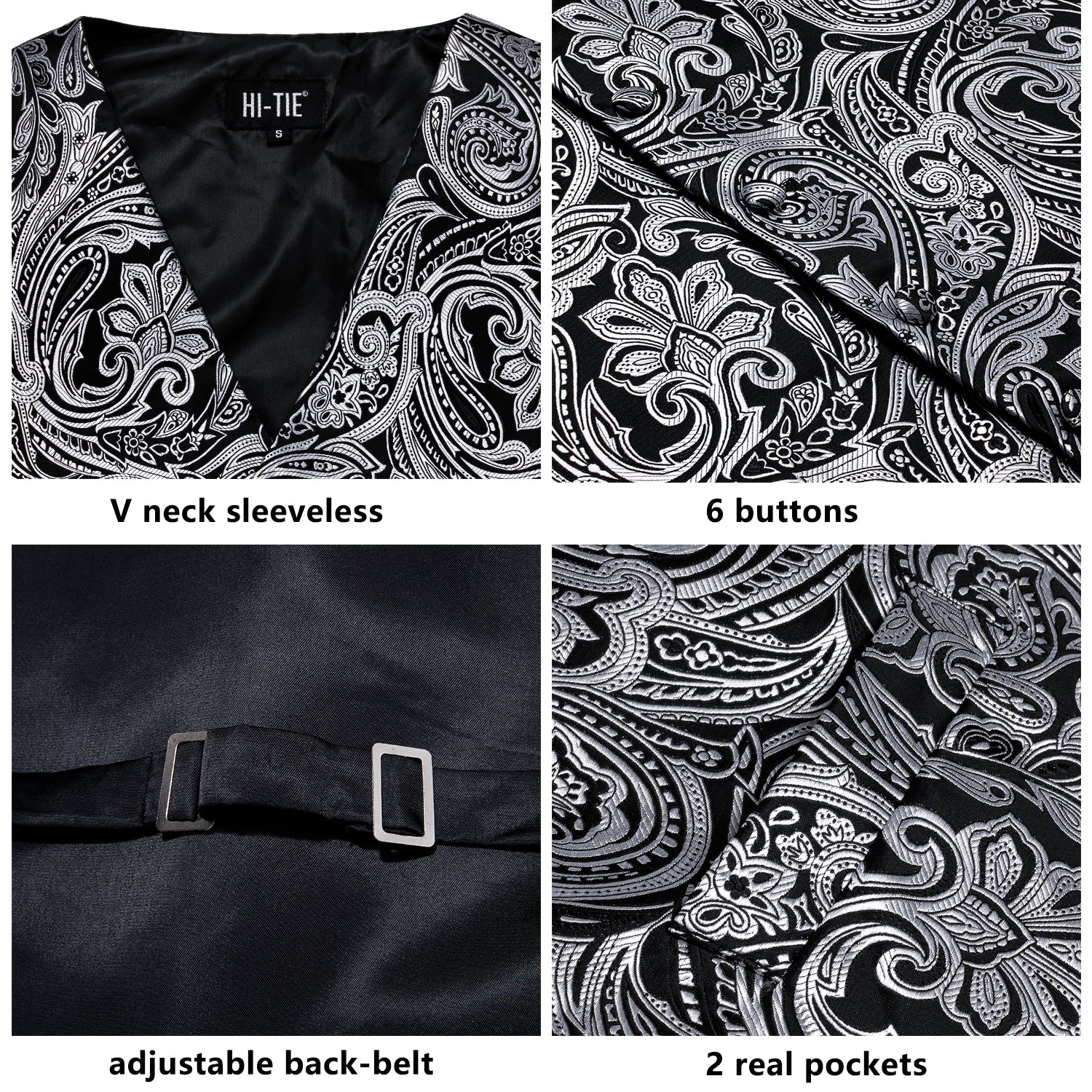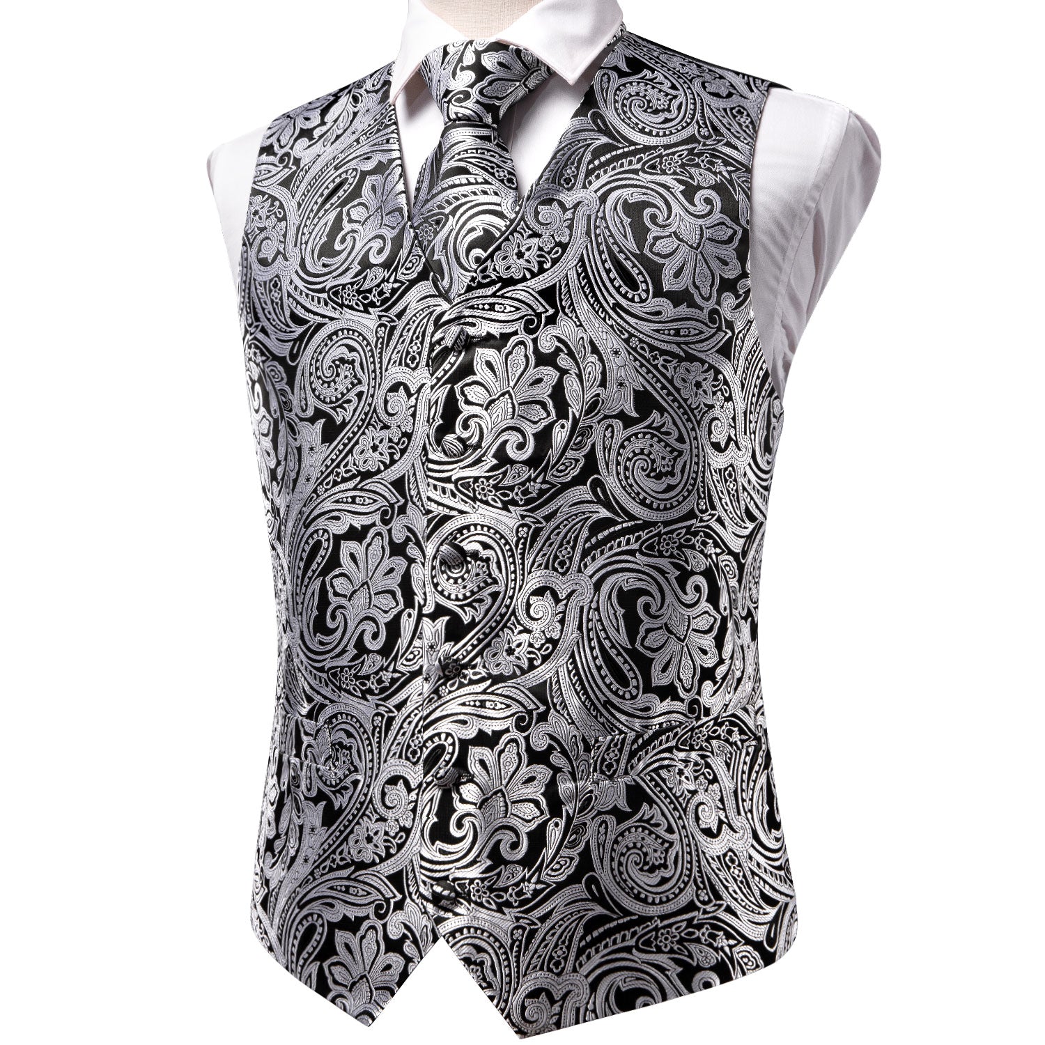 Classic Black Grey Paisley Silk Men's Vest Hanky Cufflinks Tie Set Waistcoat Suit Set