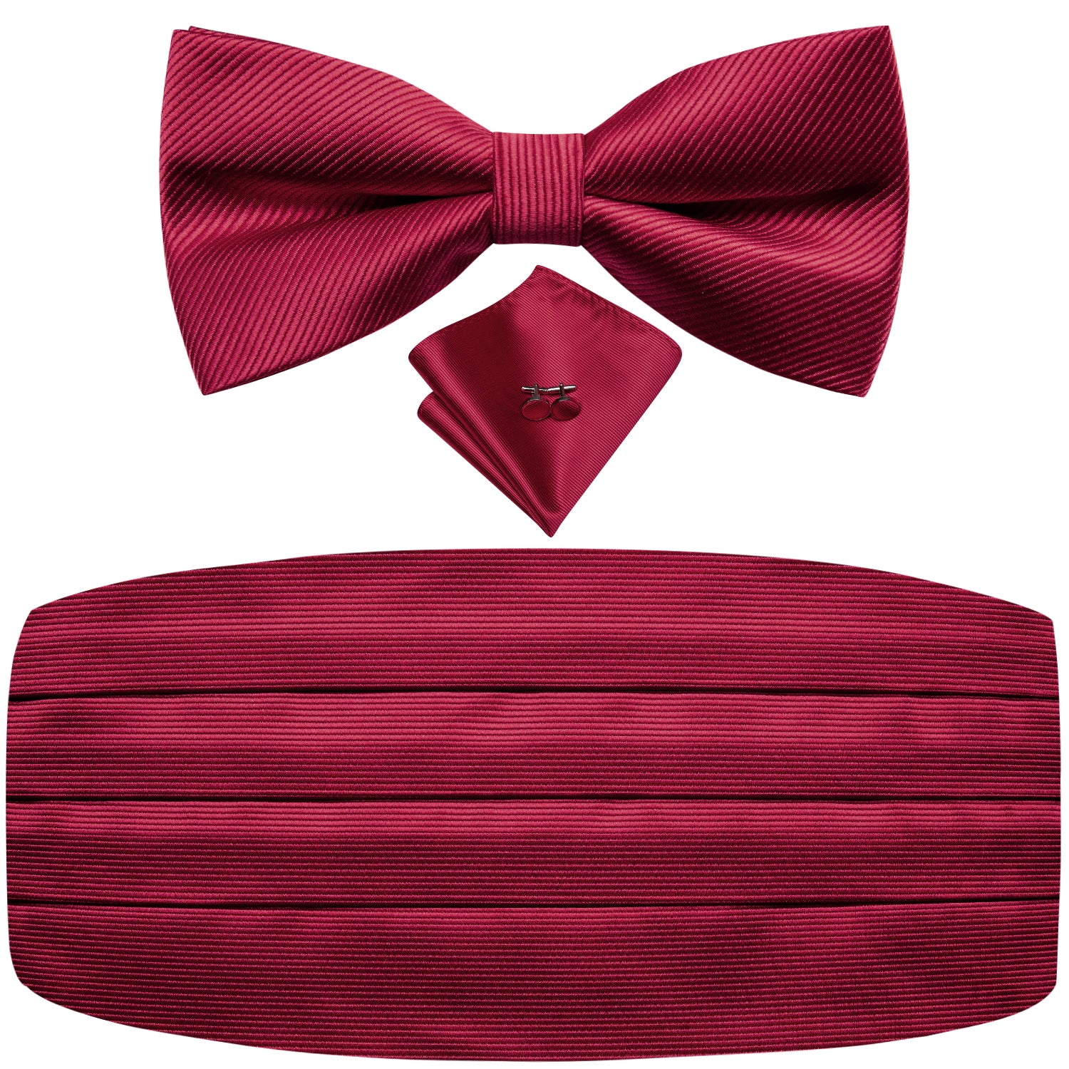 Hi-Tie Classic Red Solid Men's Cummerbund Bow Tie Hanky Cufflinks Set