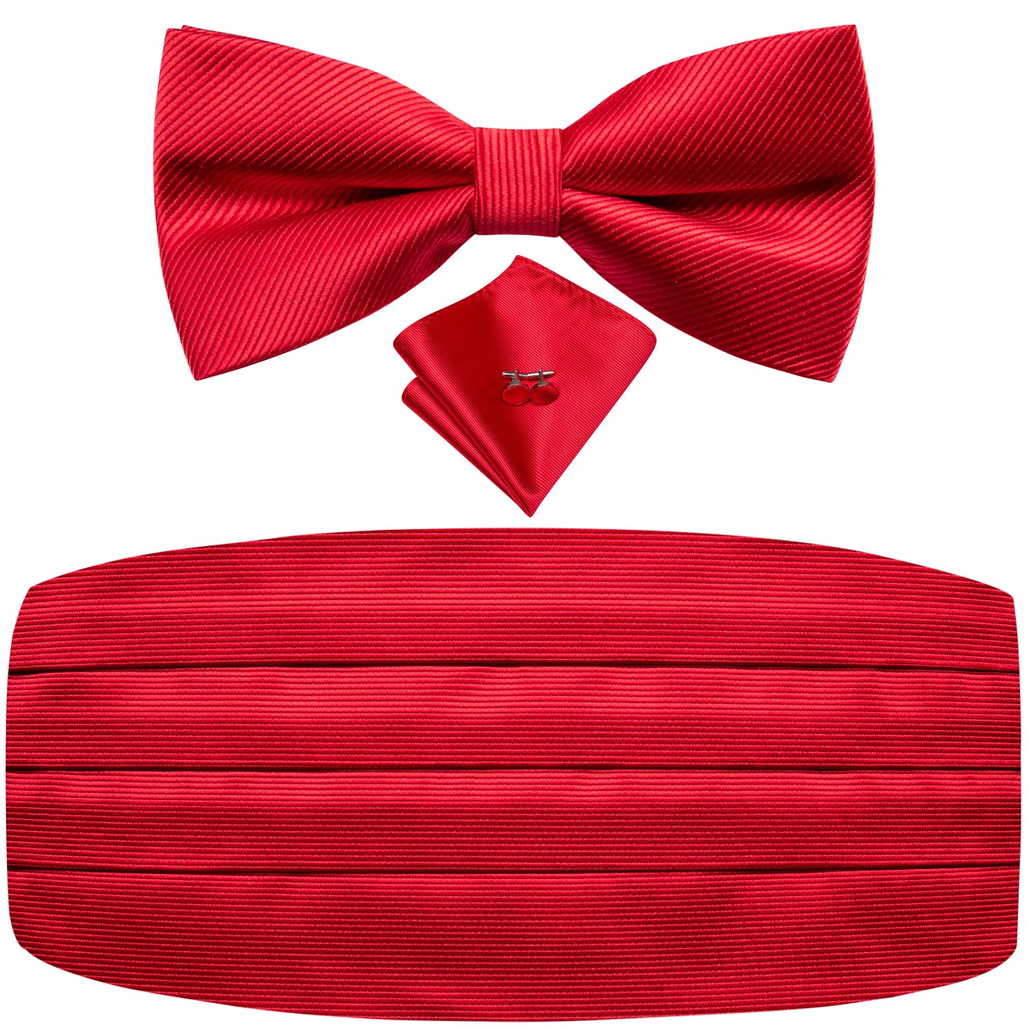 Hi-Tie Men's Classic Red Solid Cummerbund Bow Tie Hanky Cufflinks Set