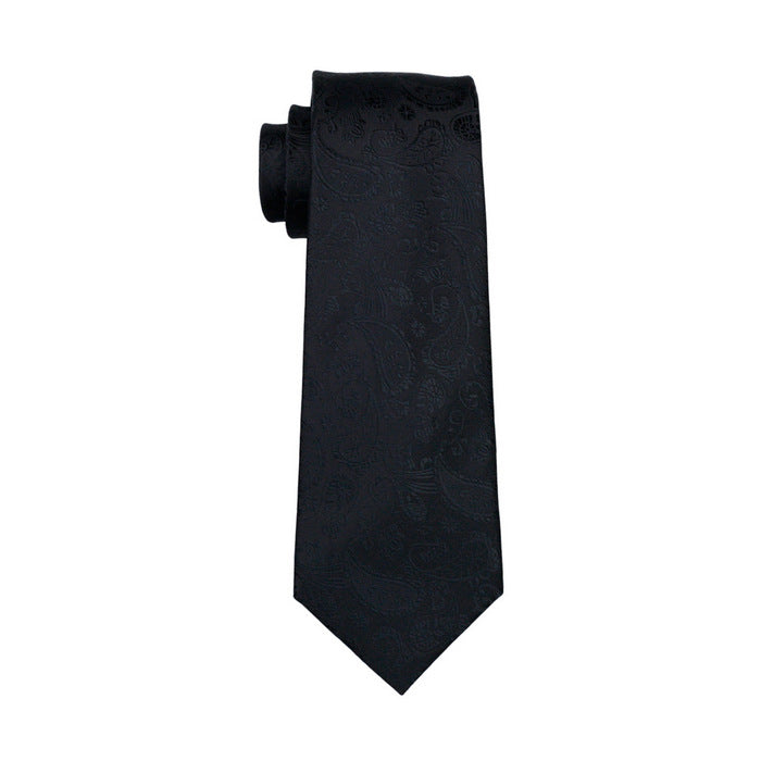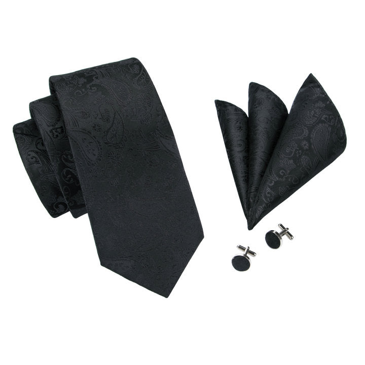 Hi-Tie Dark Black Paisley Silk Men's Tie Pocket Square Cufflinks Set