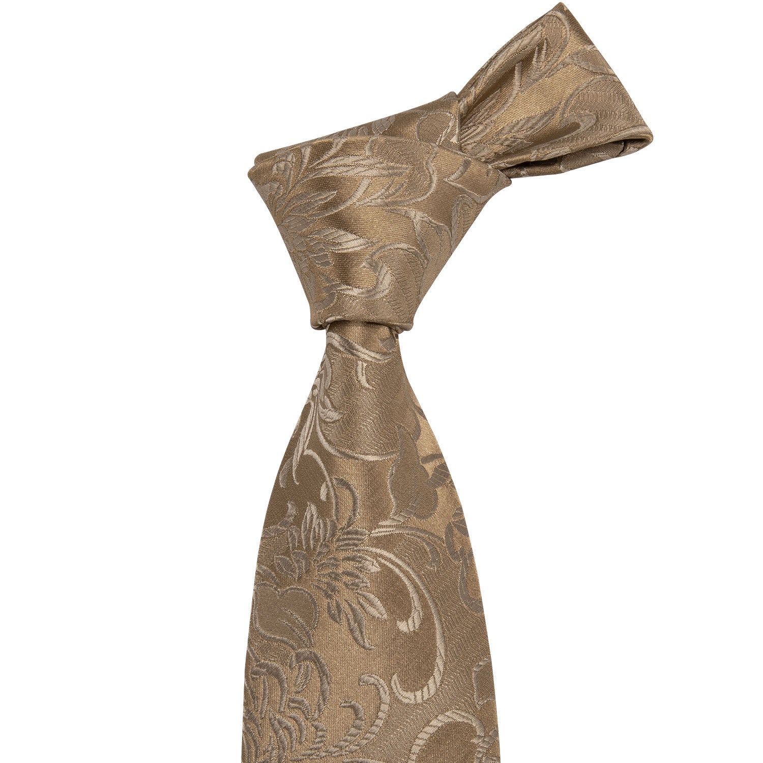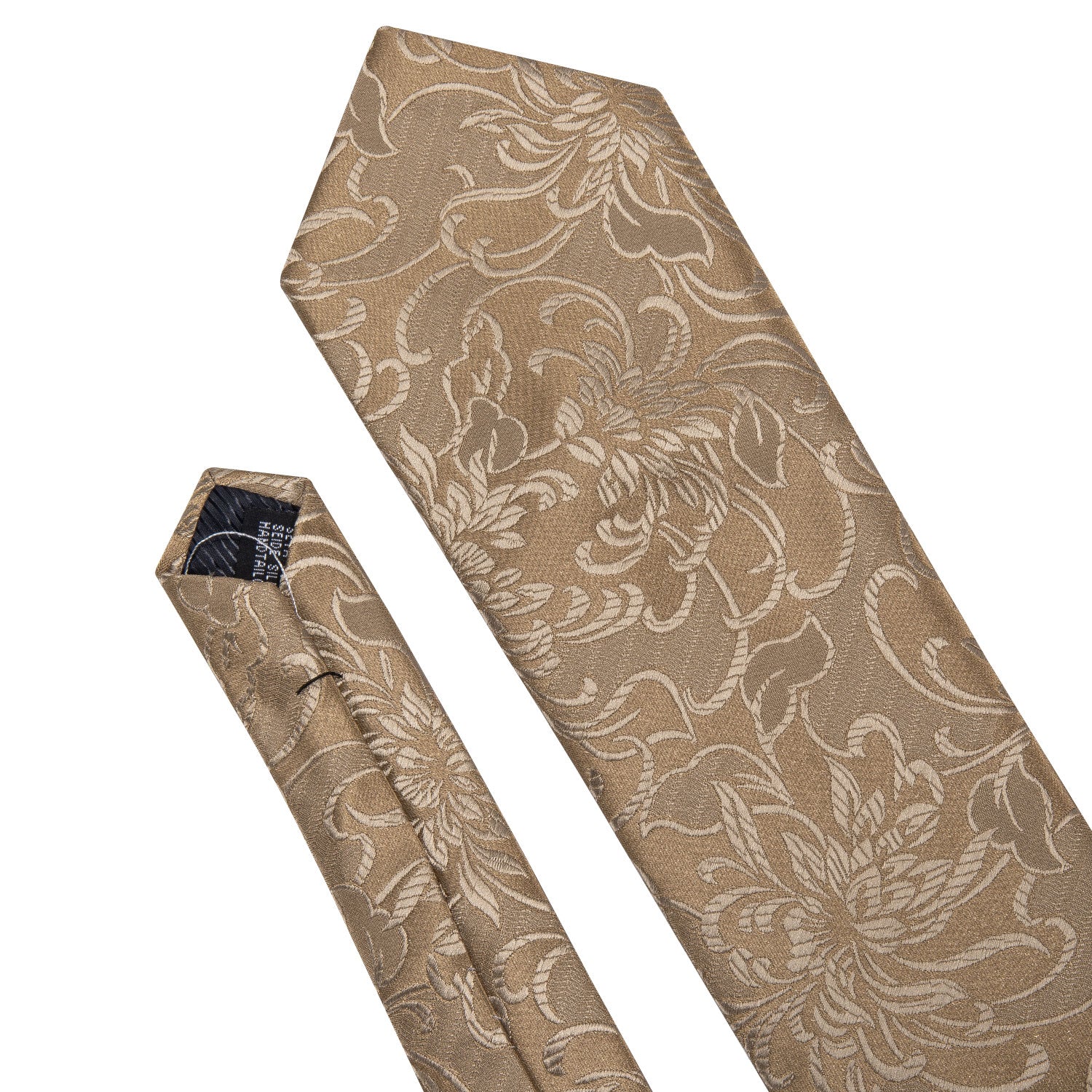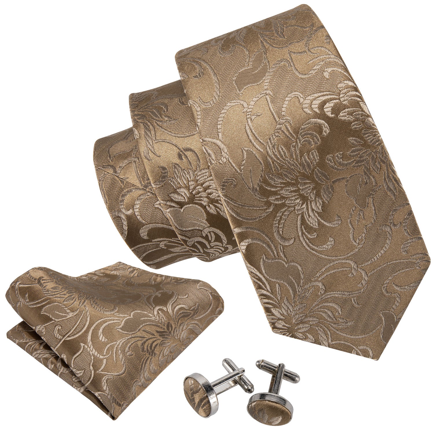 Hi-Tie Champagne Gold Floral Men's Necktie Pocket Square Cufflinks Set
