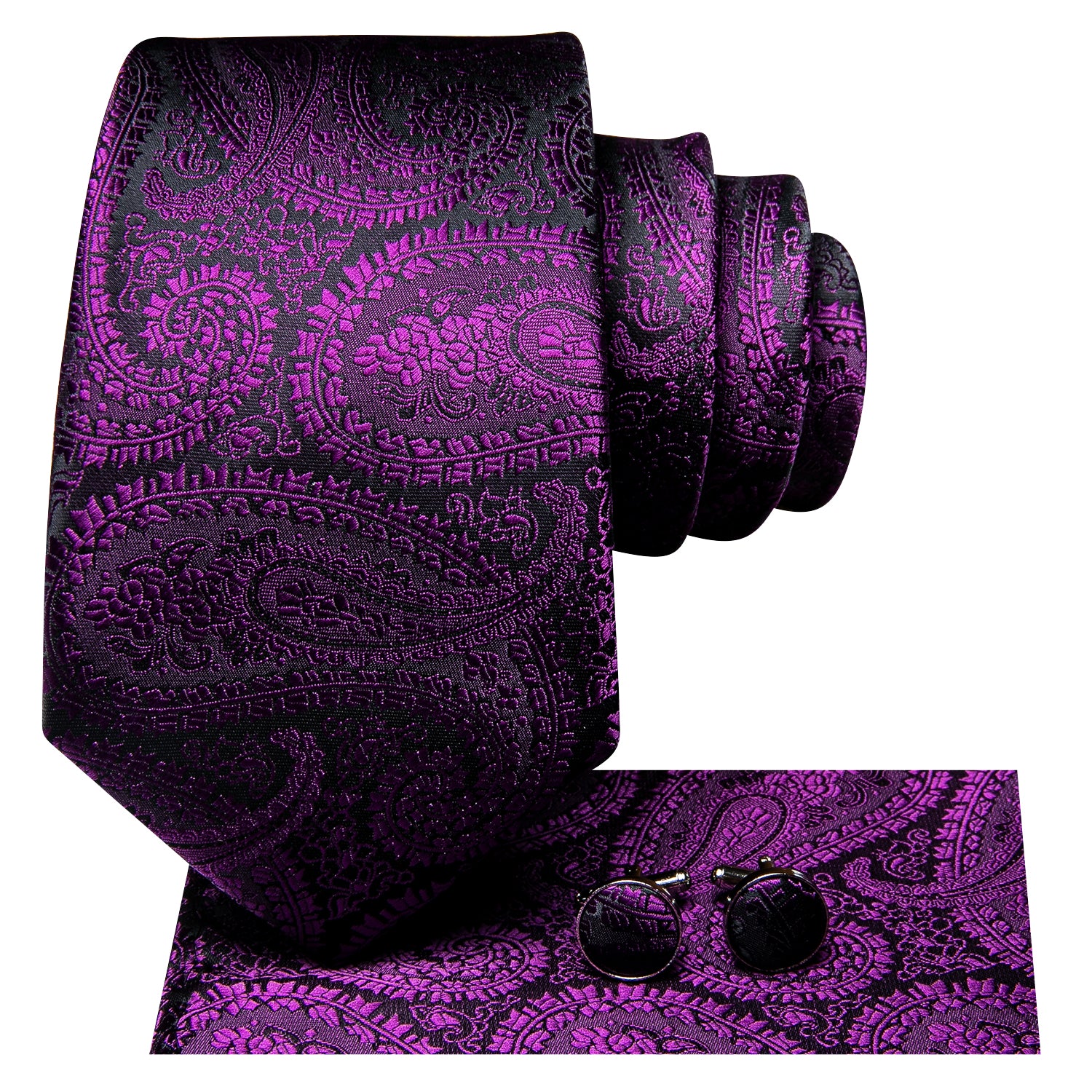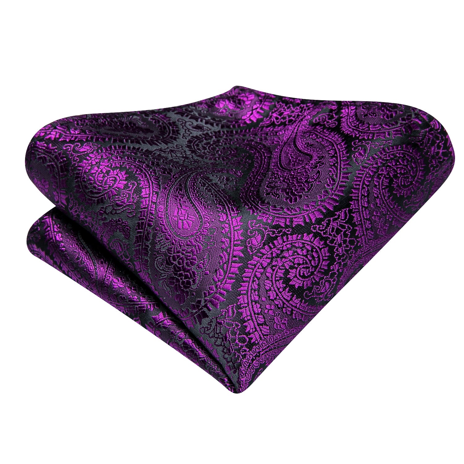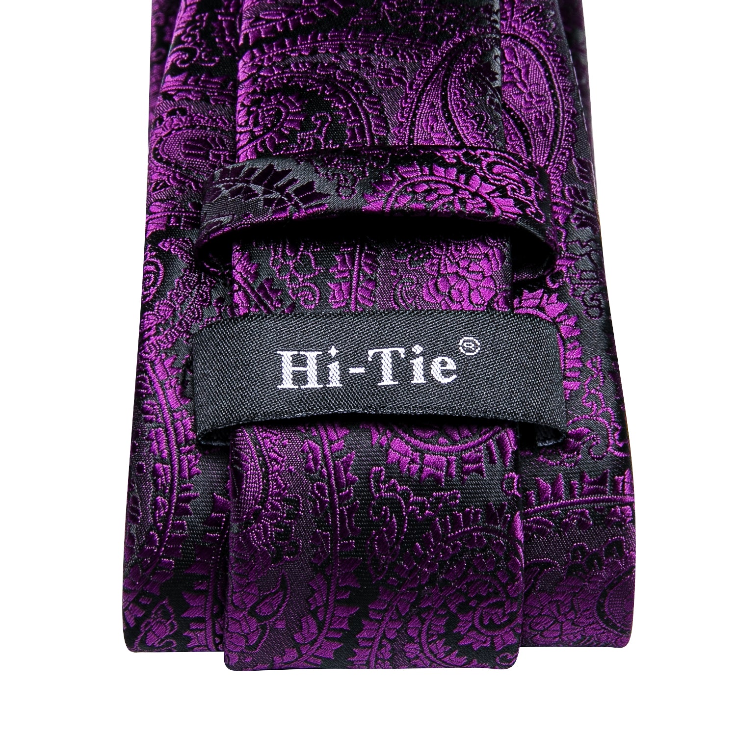 Hi-Tie Necktie Deep Purple Paisley Silk Tie Pocket Square Cufflink Set