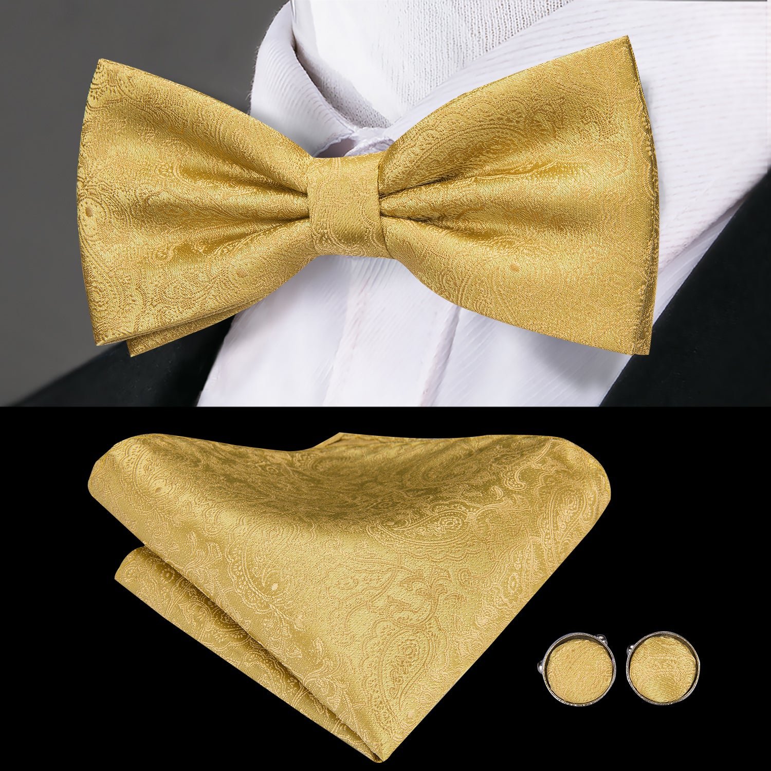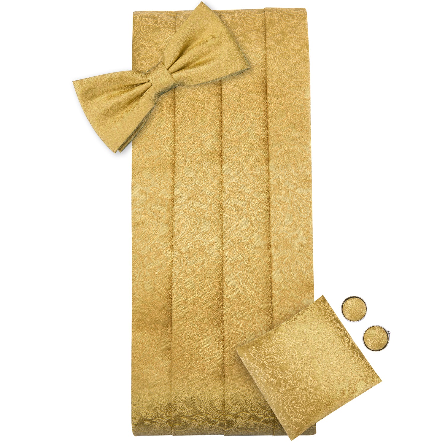 Hi-Tie Gold Floral Cummerbund Silk Bow Tie Hanky Cufflinks Set for Men