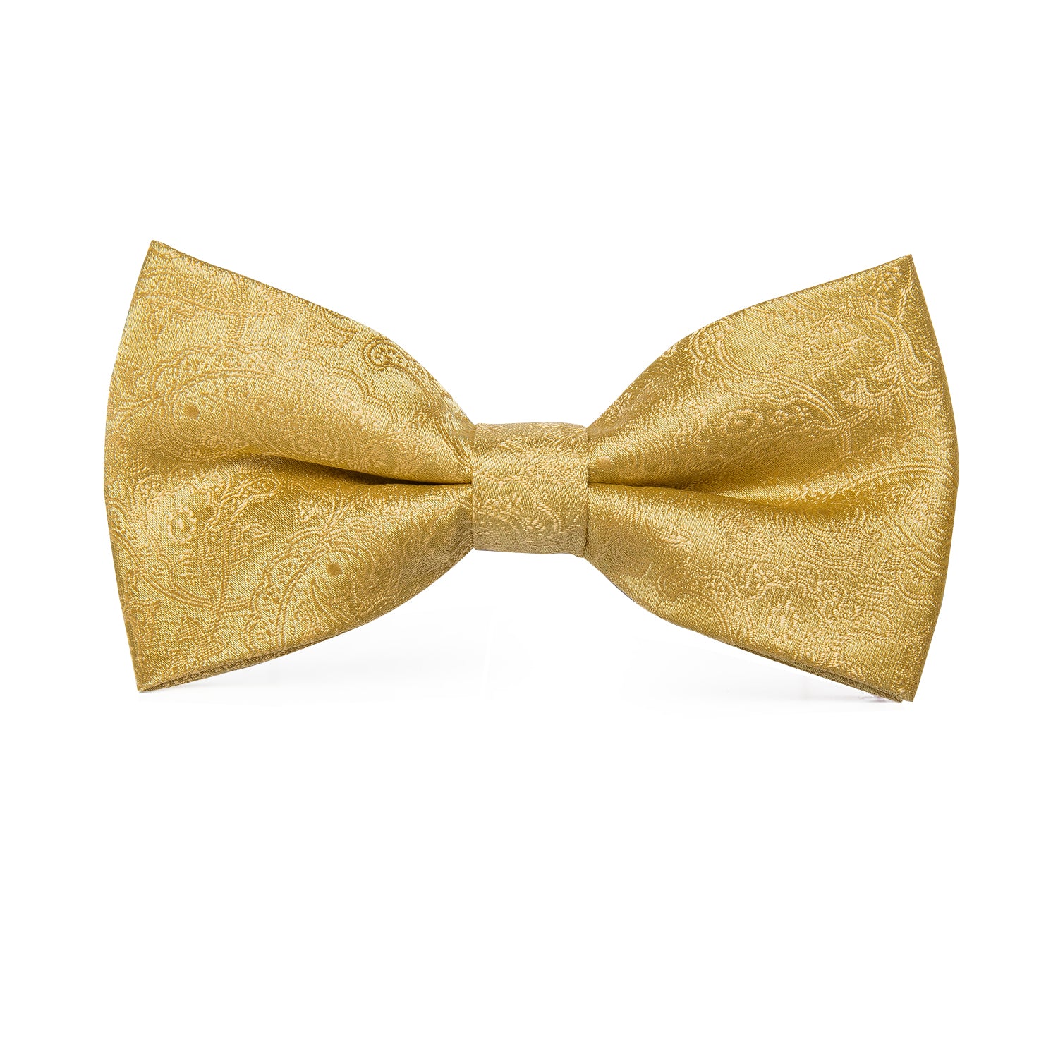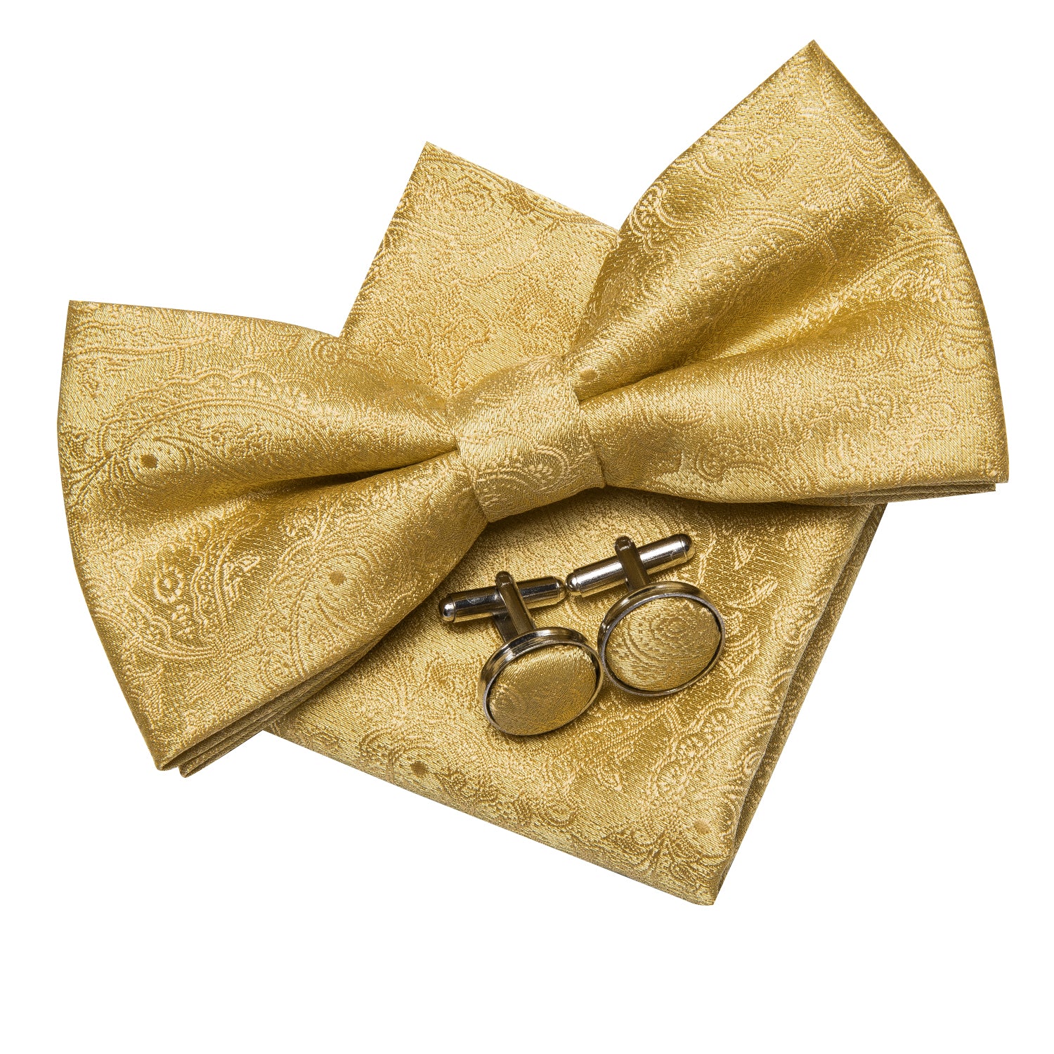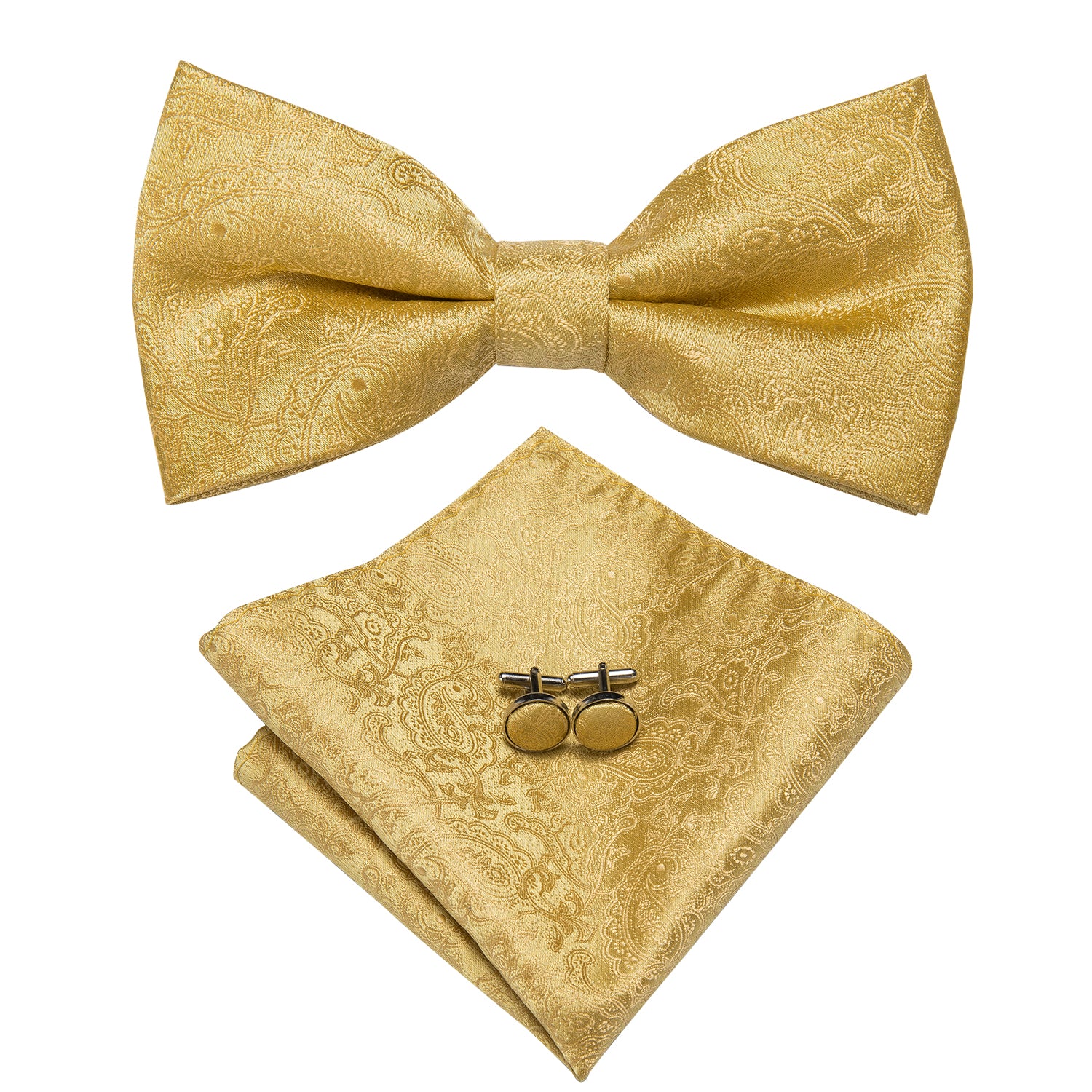 Gold Paisley Pre-tied Bow Tie Hanky Cufflinks Pin Set