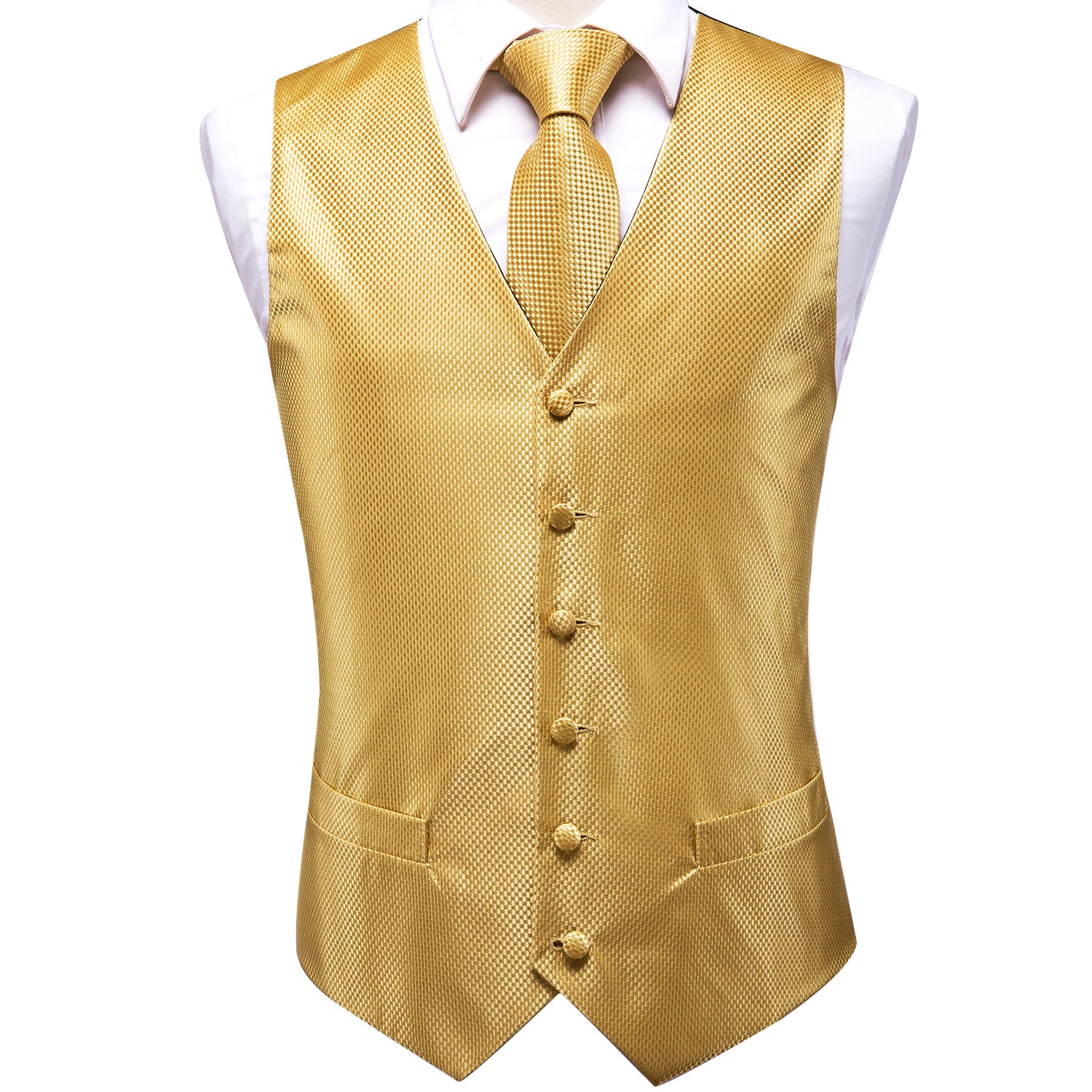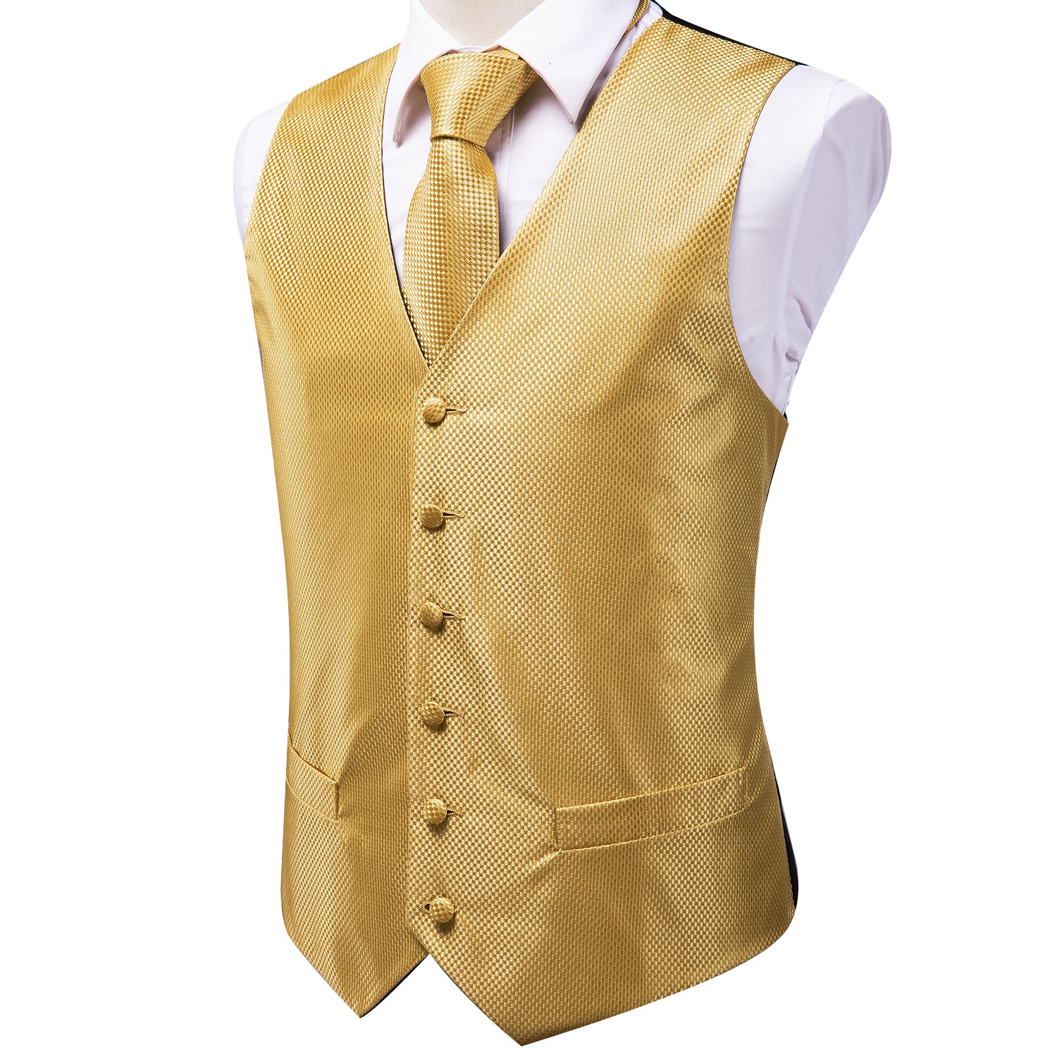 Golden Plaid Silk Men's Vest Hanky Cufflinks Tie Set Waistcoat Suit Set