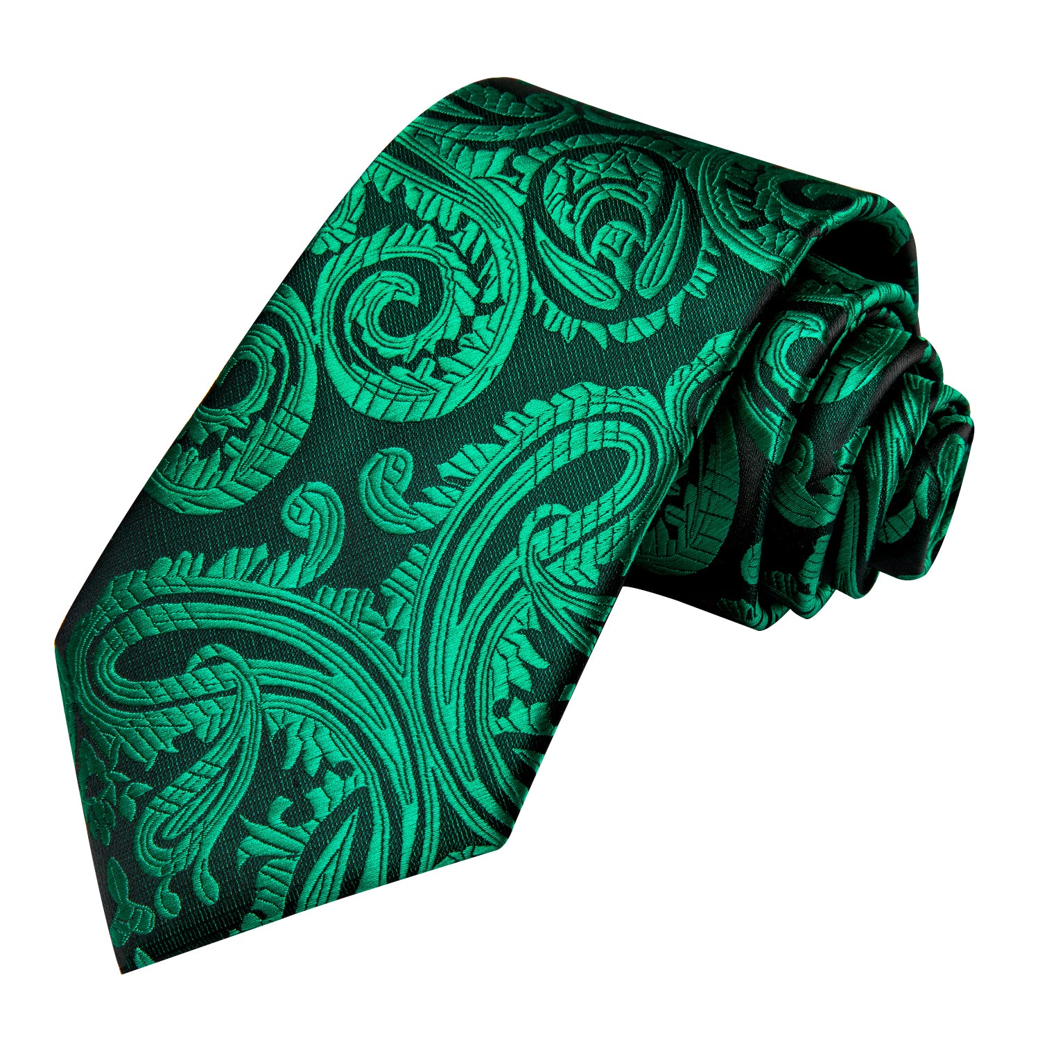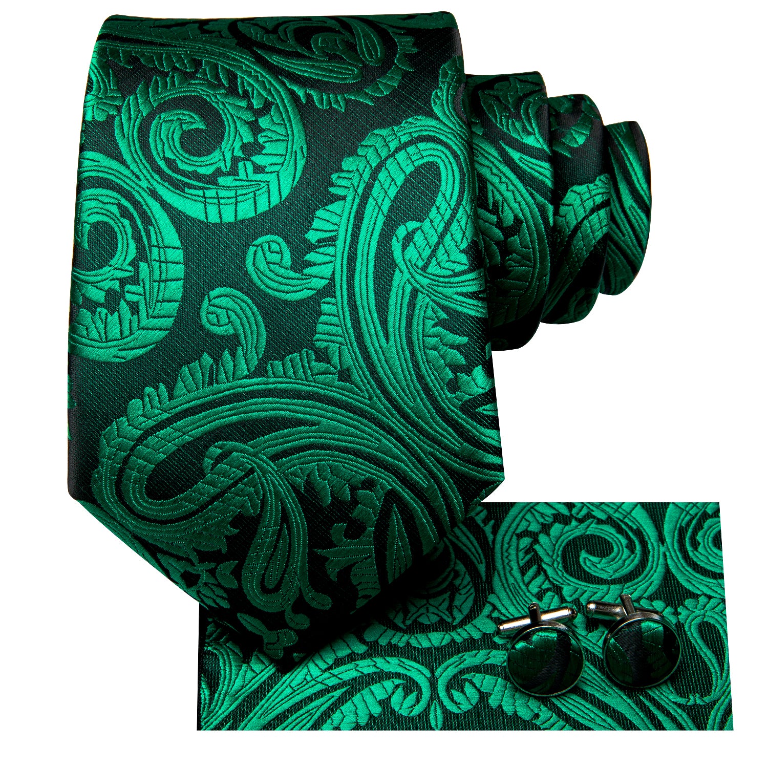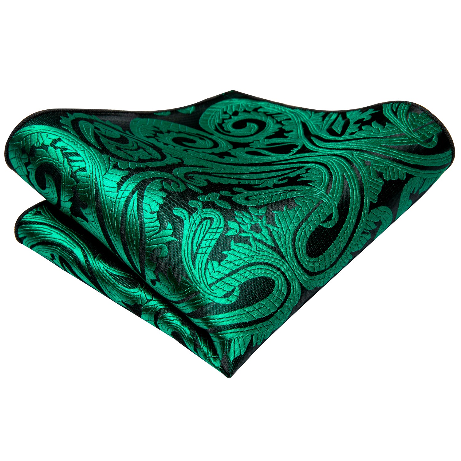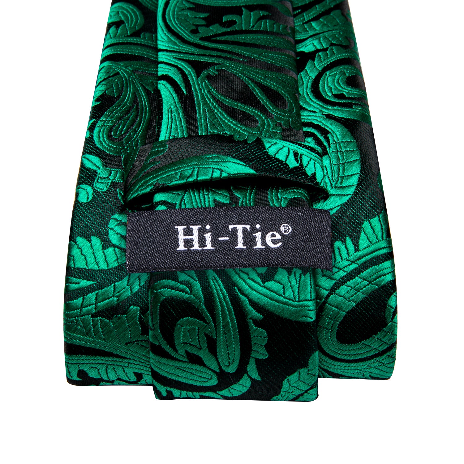 Hi-Tie Dark Green Men's Black Paisley Tie Pocket Square Cufflinks Set
