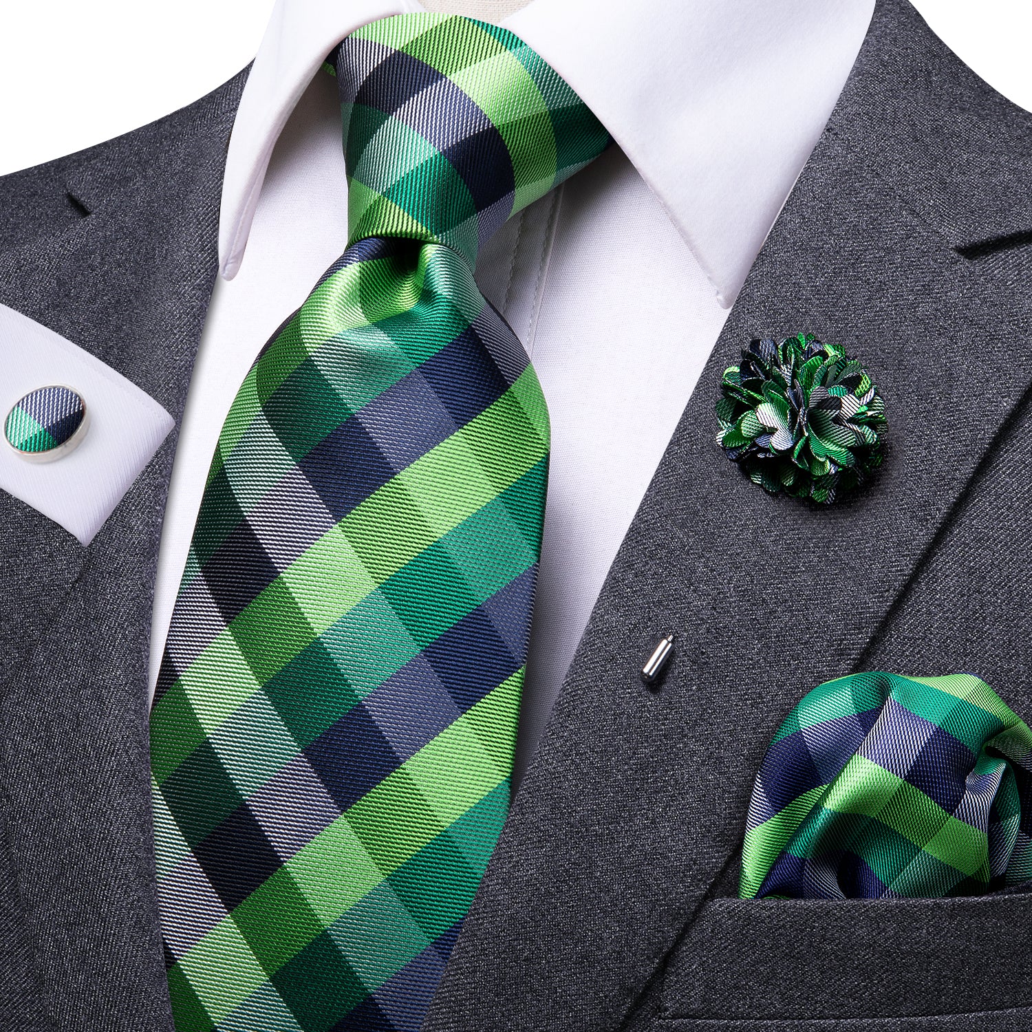 Green Plaid Silk Men's Tie Pocket Square Cufflinks Set with Brooch