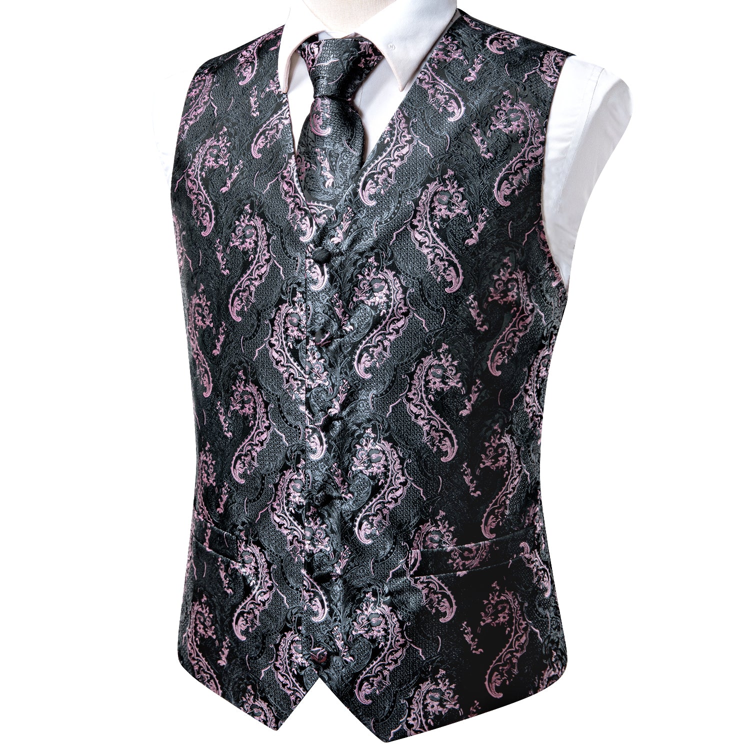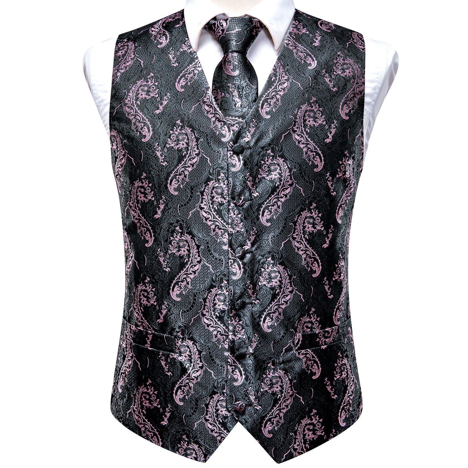 Grey Pink Paisley Silk Men's Vest Hanky Cufflinks Tie Set Waistcoat Suit Set