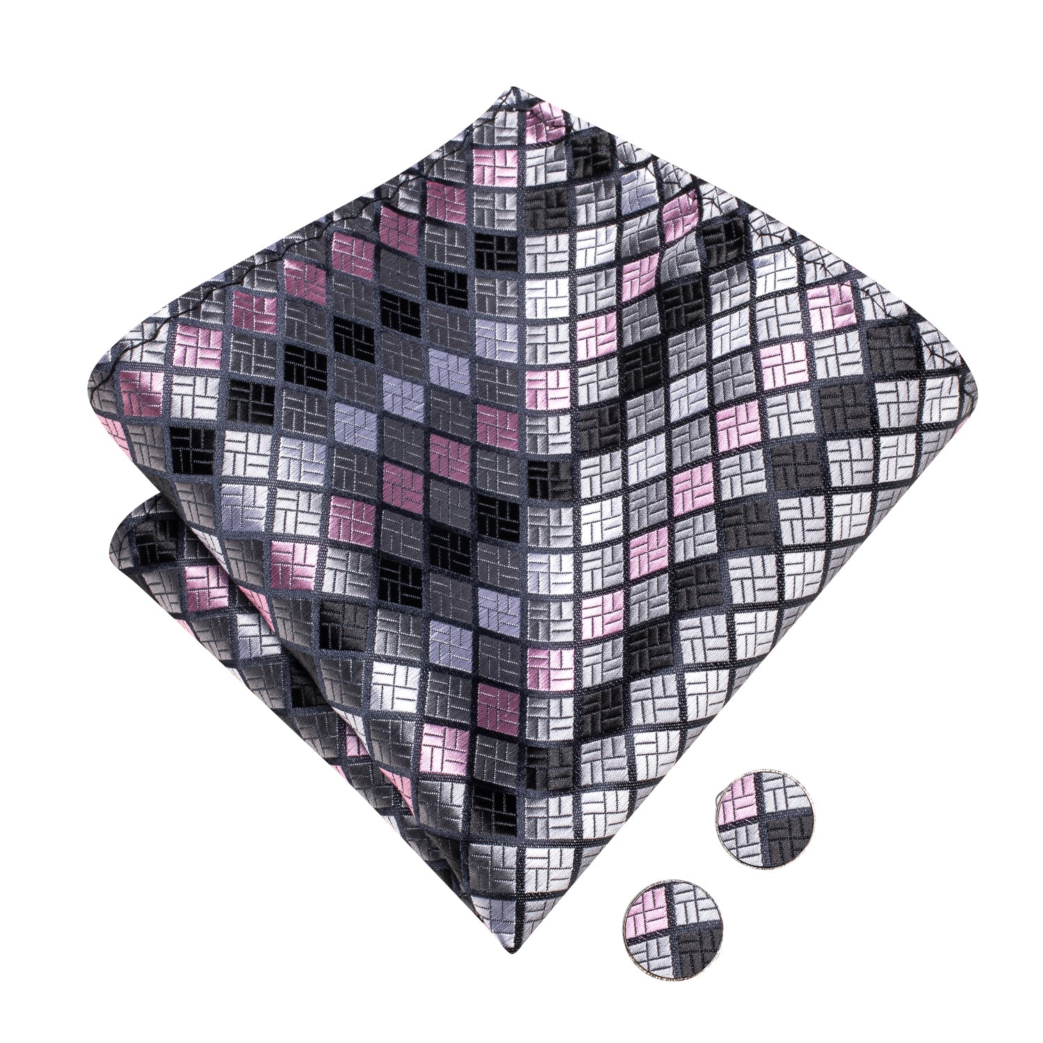 Grey Pink Plaid Silk Pre-tied Bow Tie Hanky Cufflinks Set