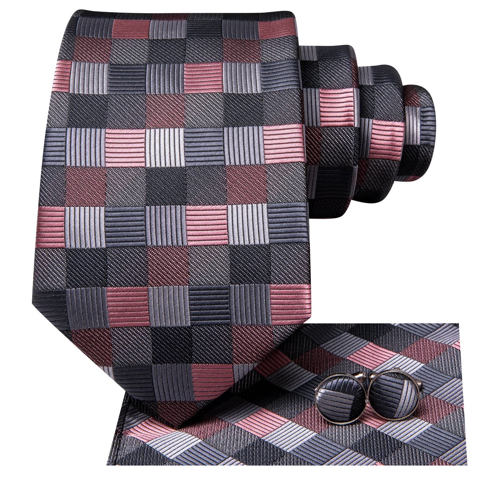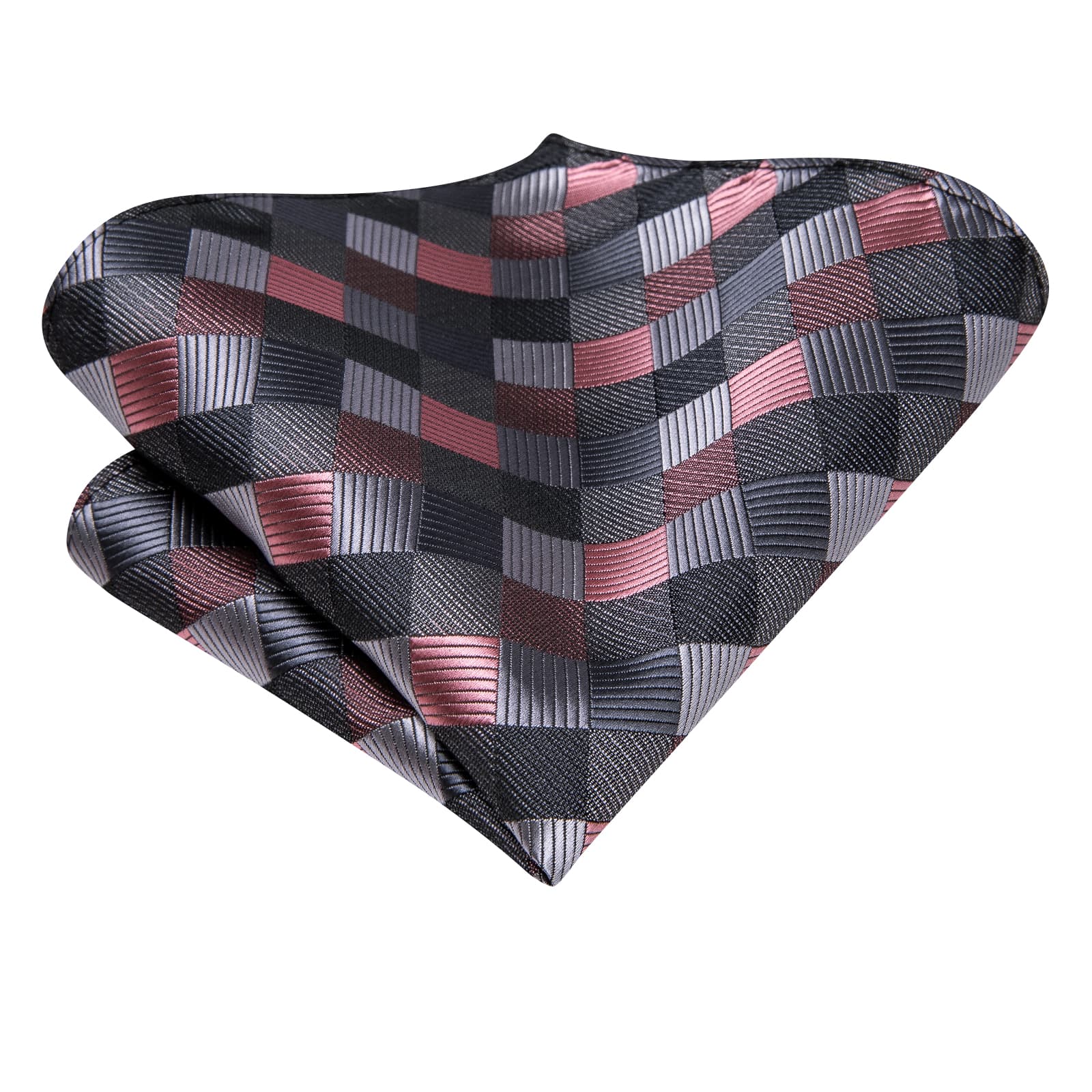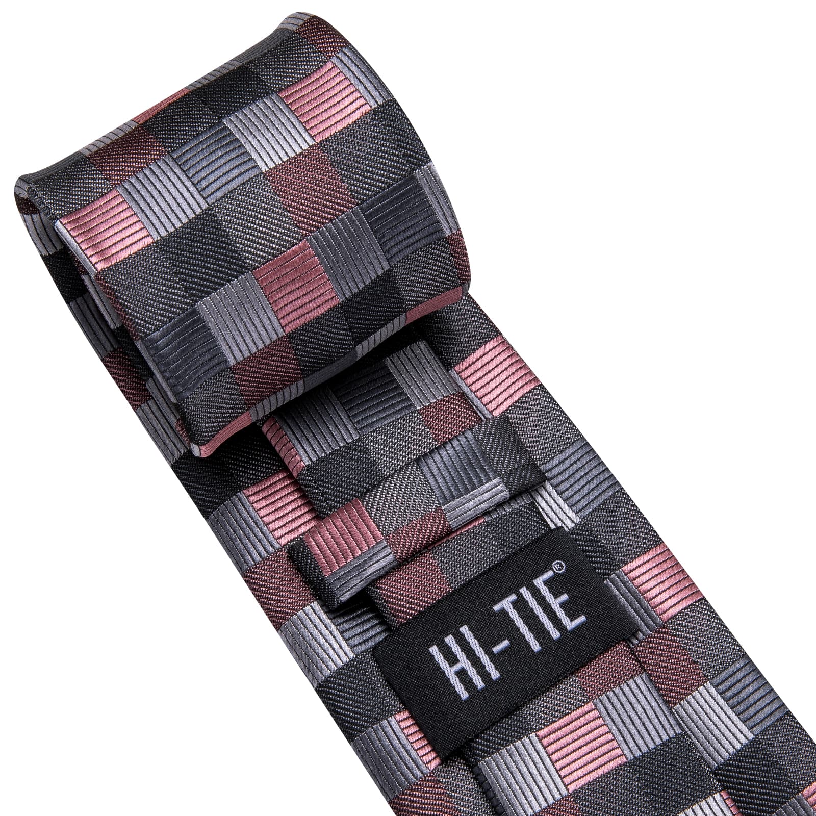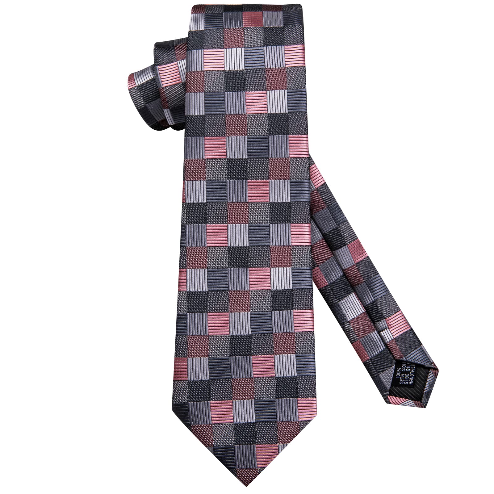 Hi-Tie Black Grey Coral Red Plaid Jacquard Geometric Men's Necktie Set