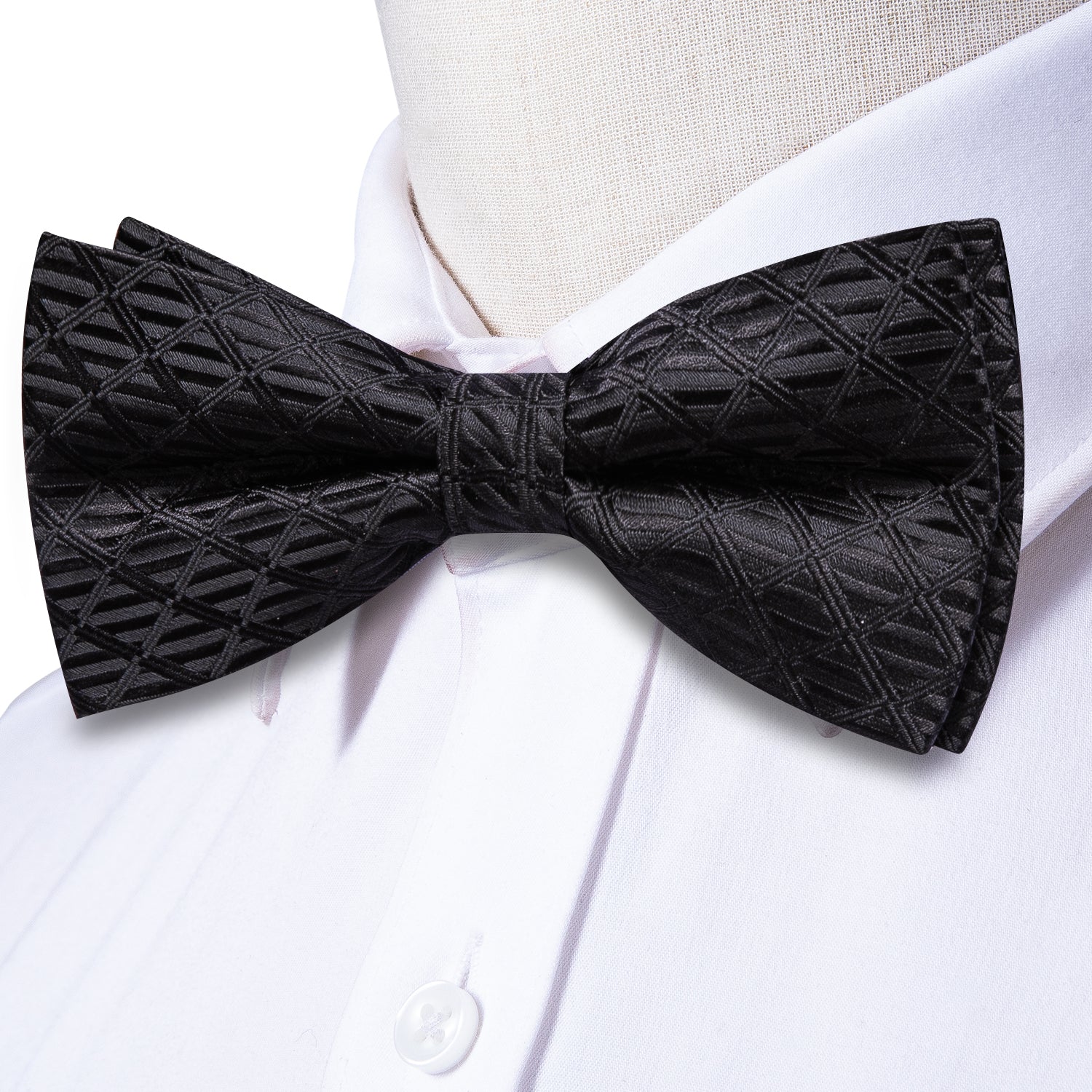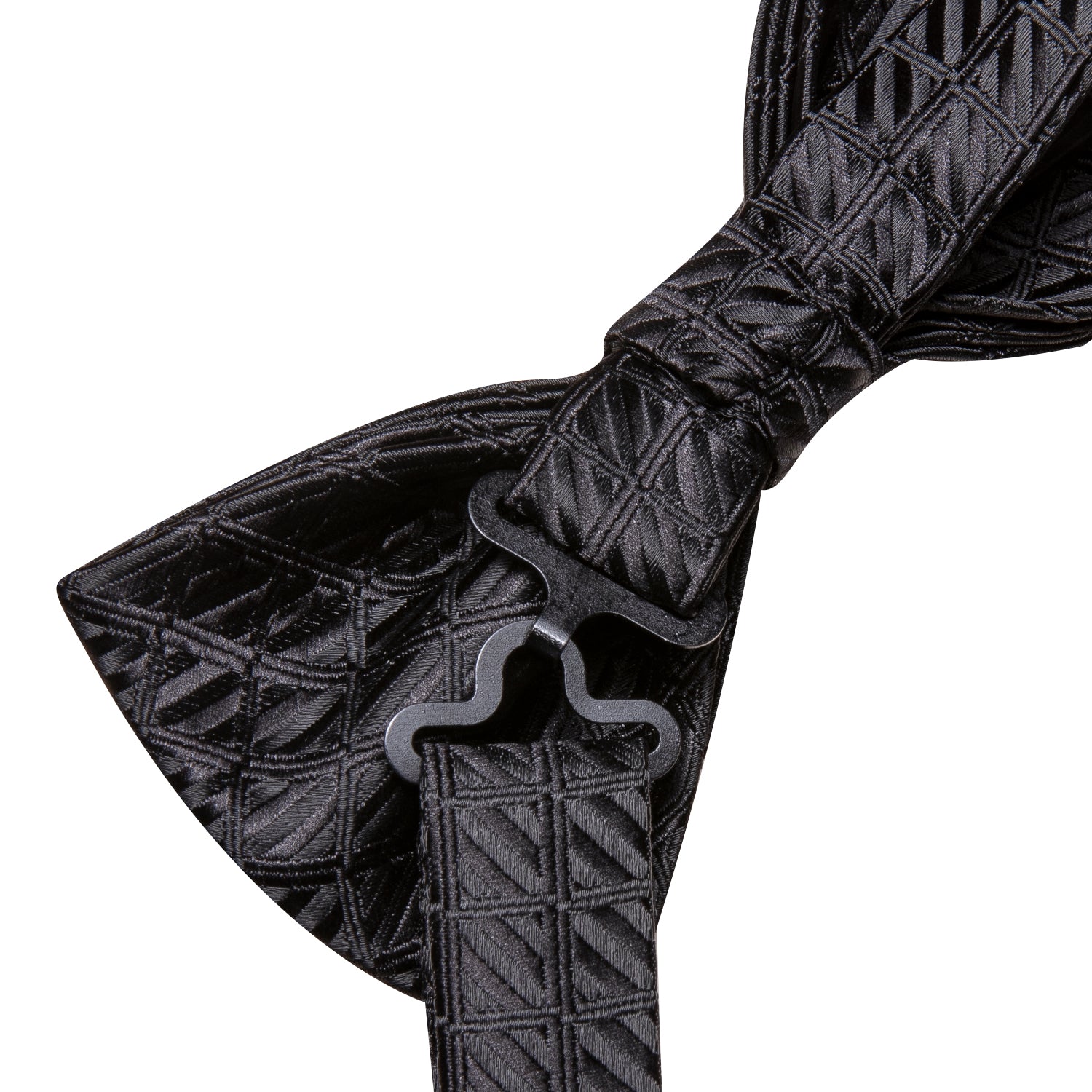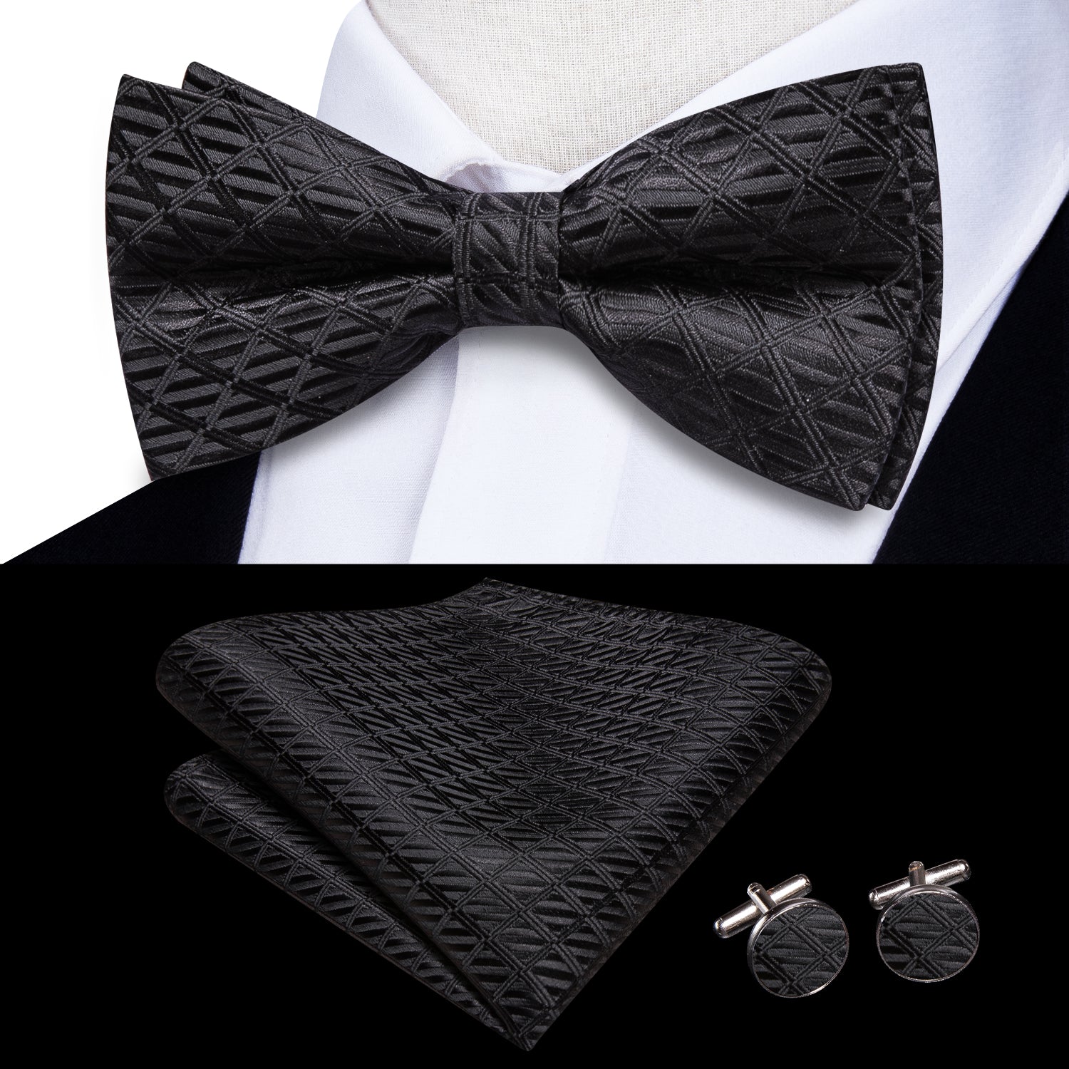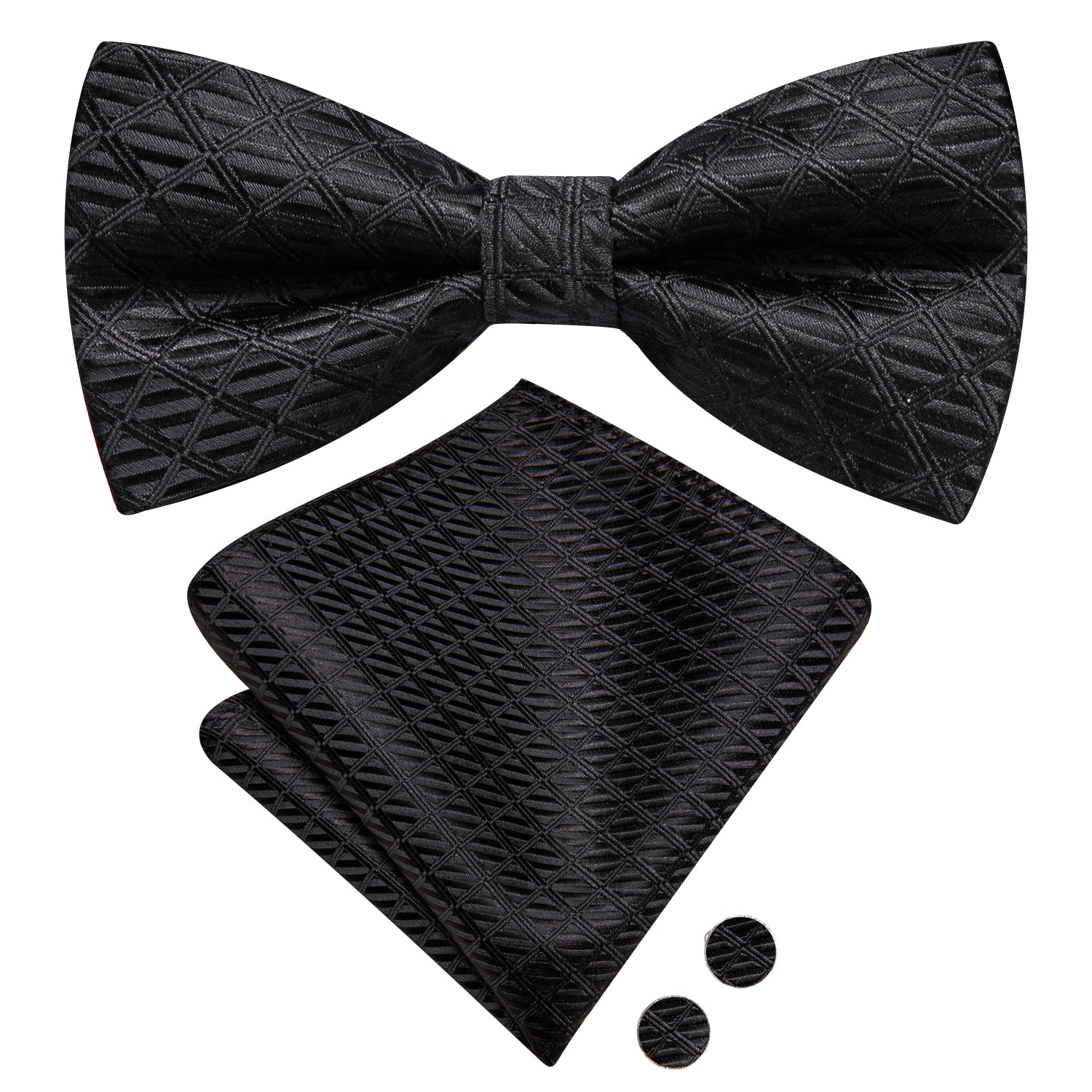 Hi-Tie Black Novelty Pre-tied Bow Tie Hanky Cufflinks Set