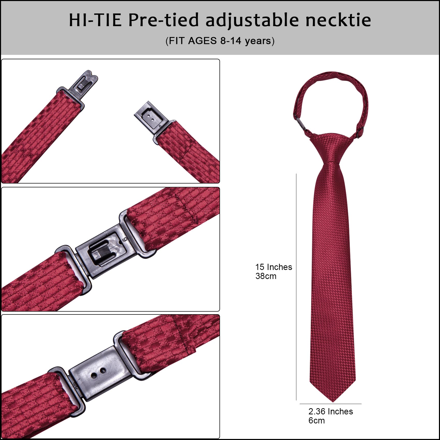 Hi-Tie Burgundy Plaid Boys Pre-tied Adjustable Tie Pocket Square
