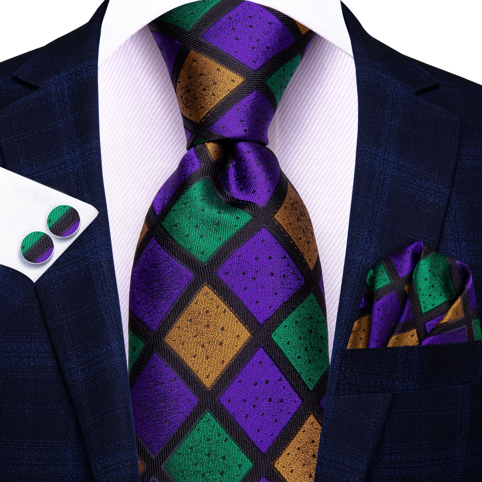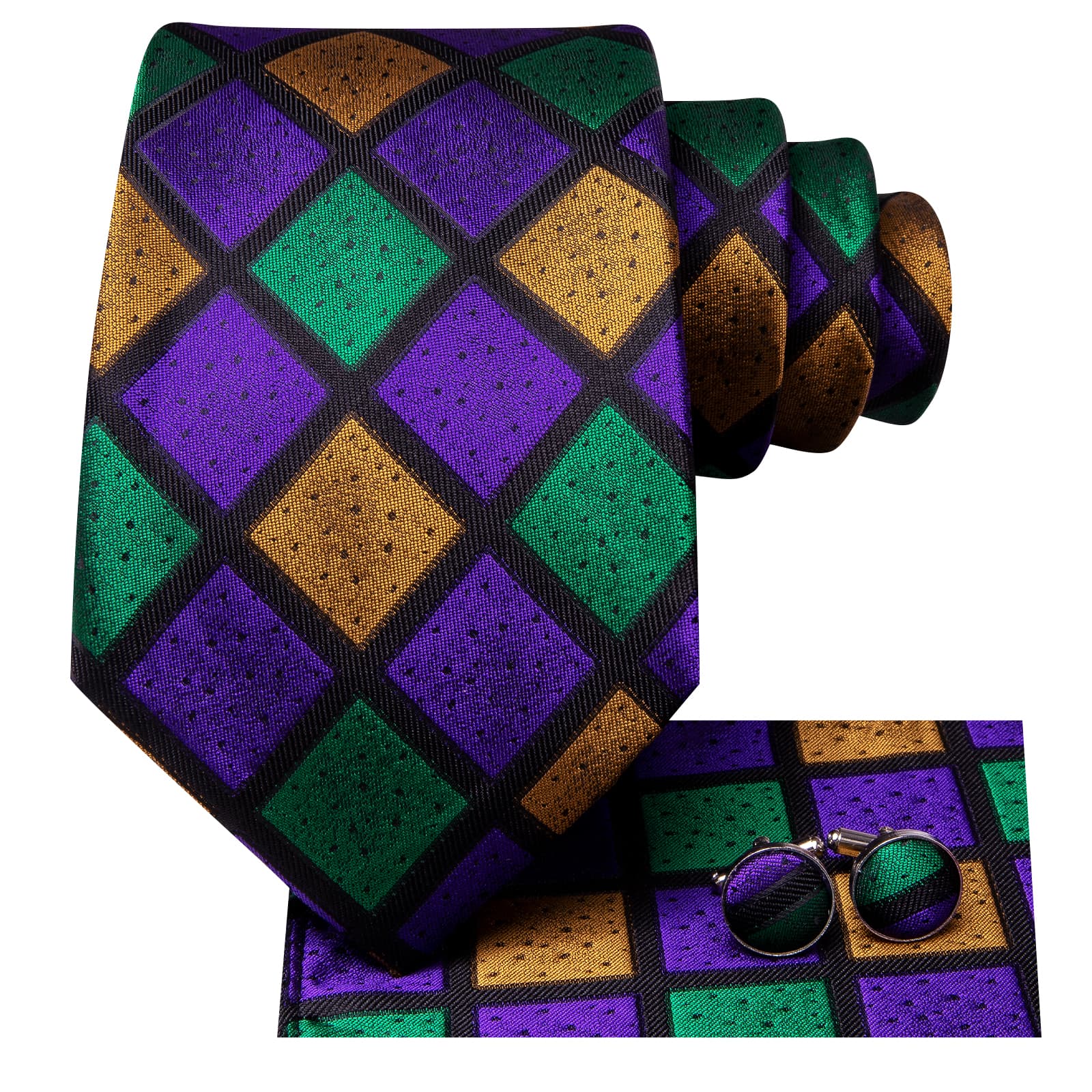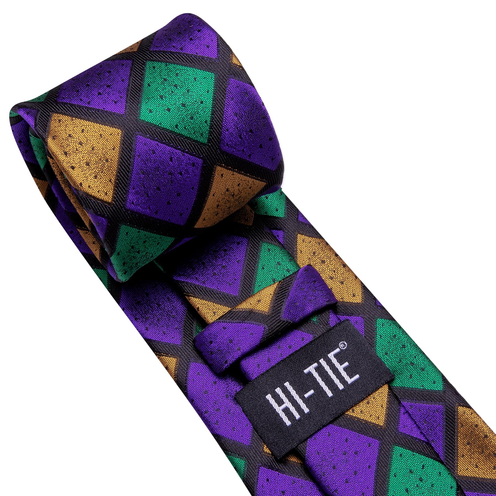 Hi-Tie Checkered Green Purple Gold Necktie Handkerchief Cufflinks Set
