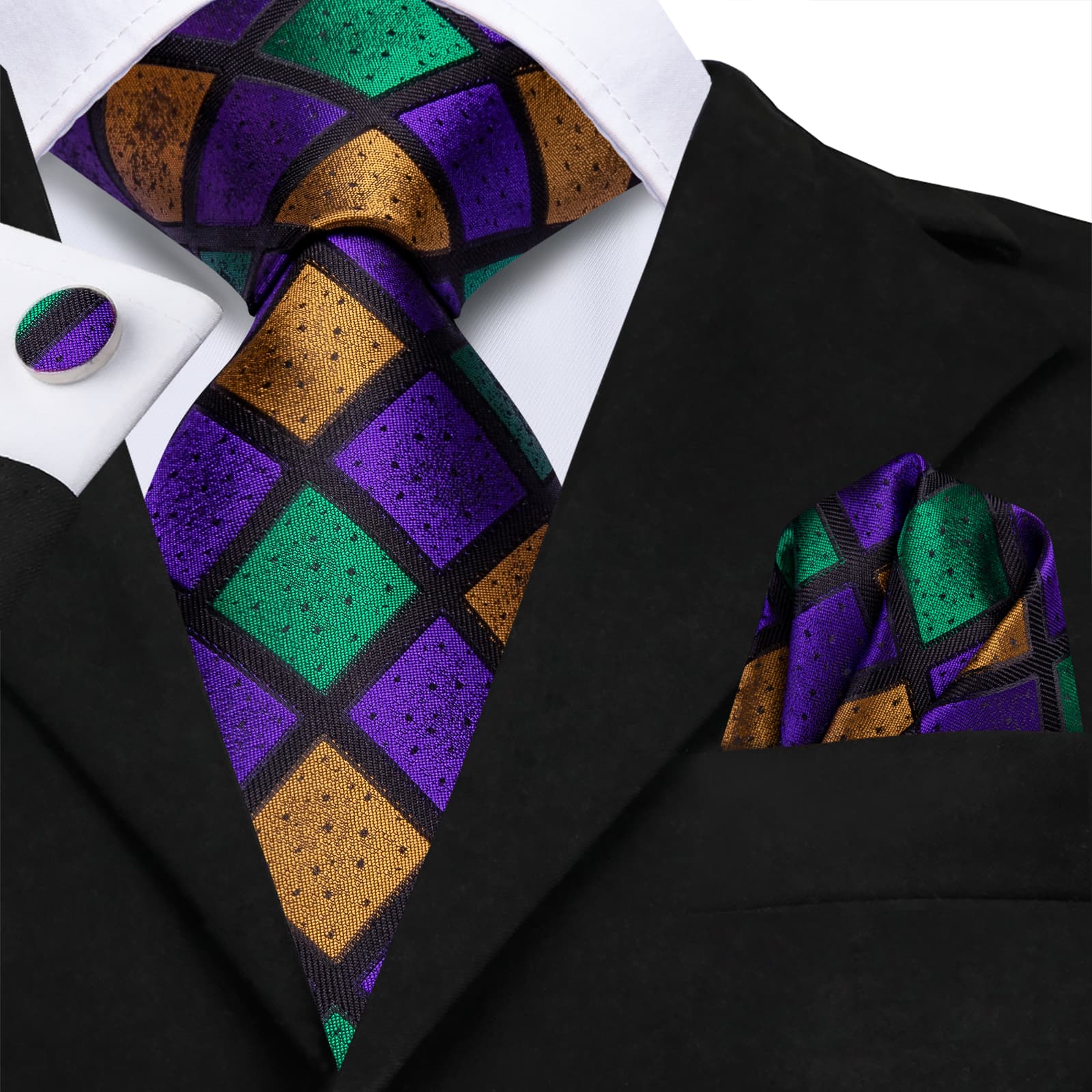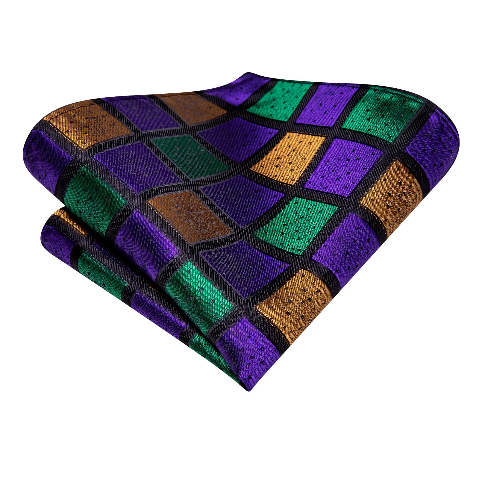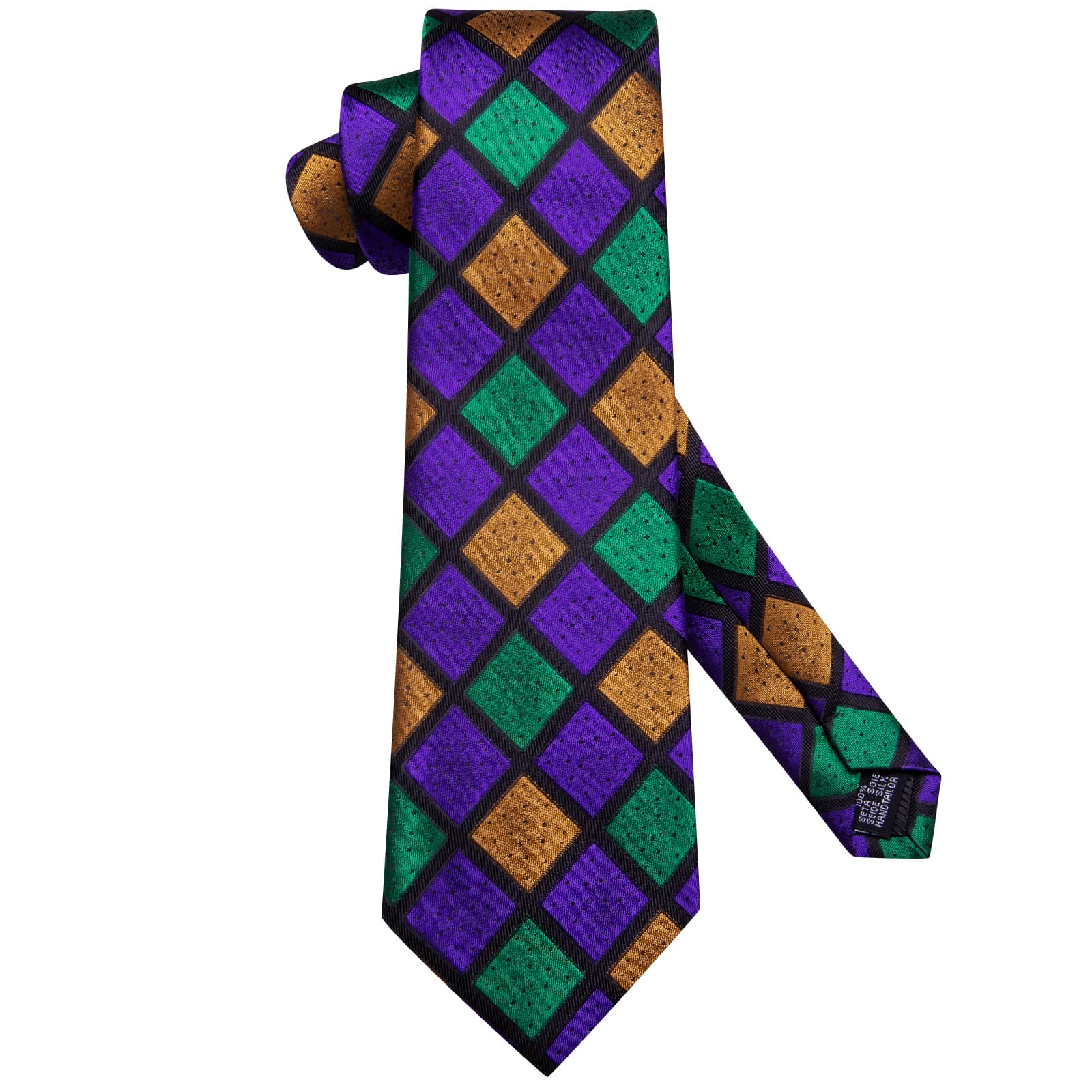 Hi-Tie Checkered Green Purple Gold Necktie Handkerchief Cufflinks Set