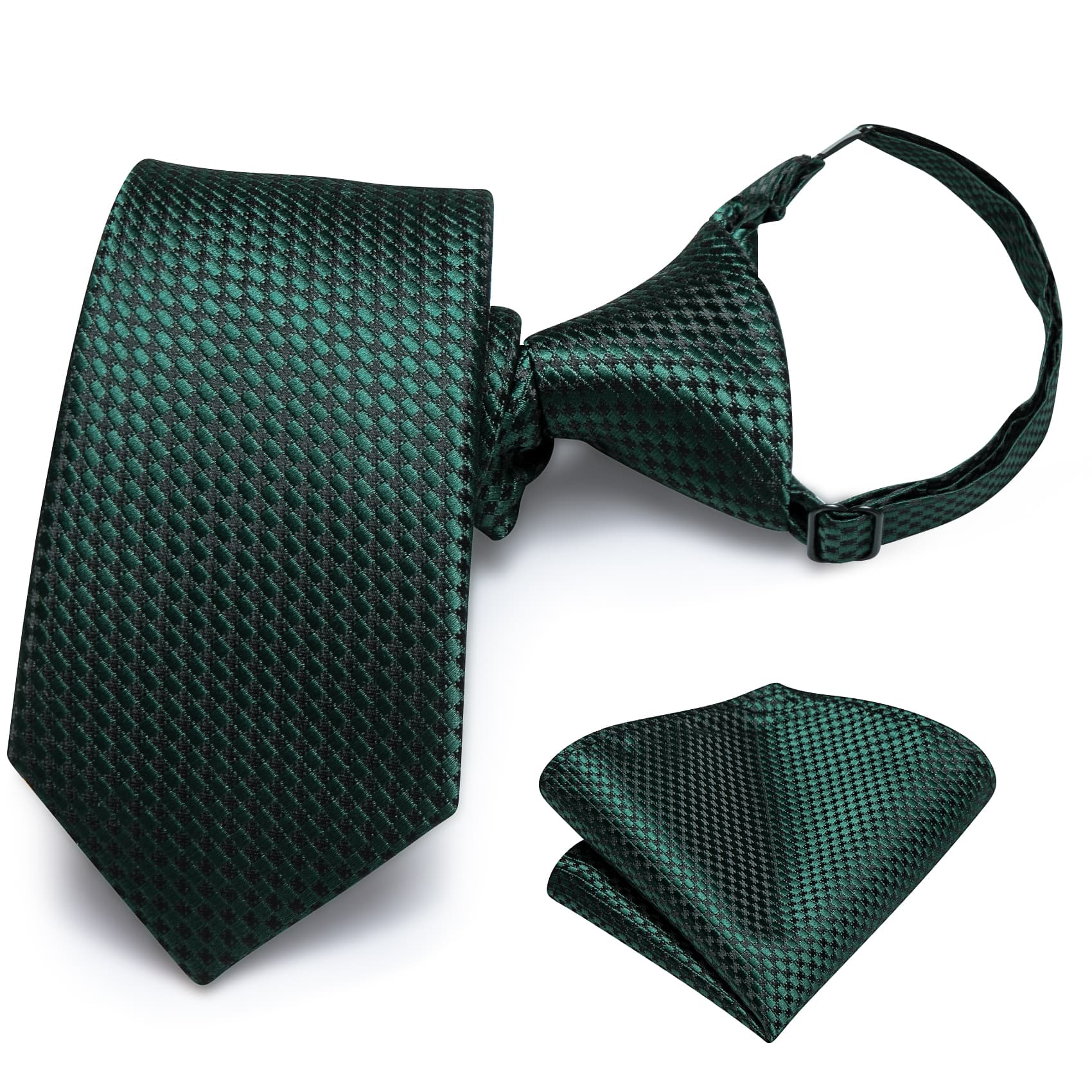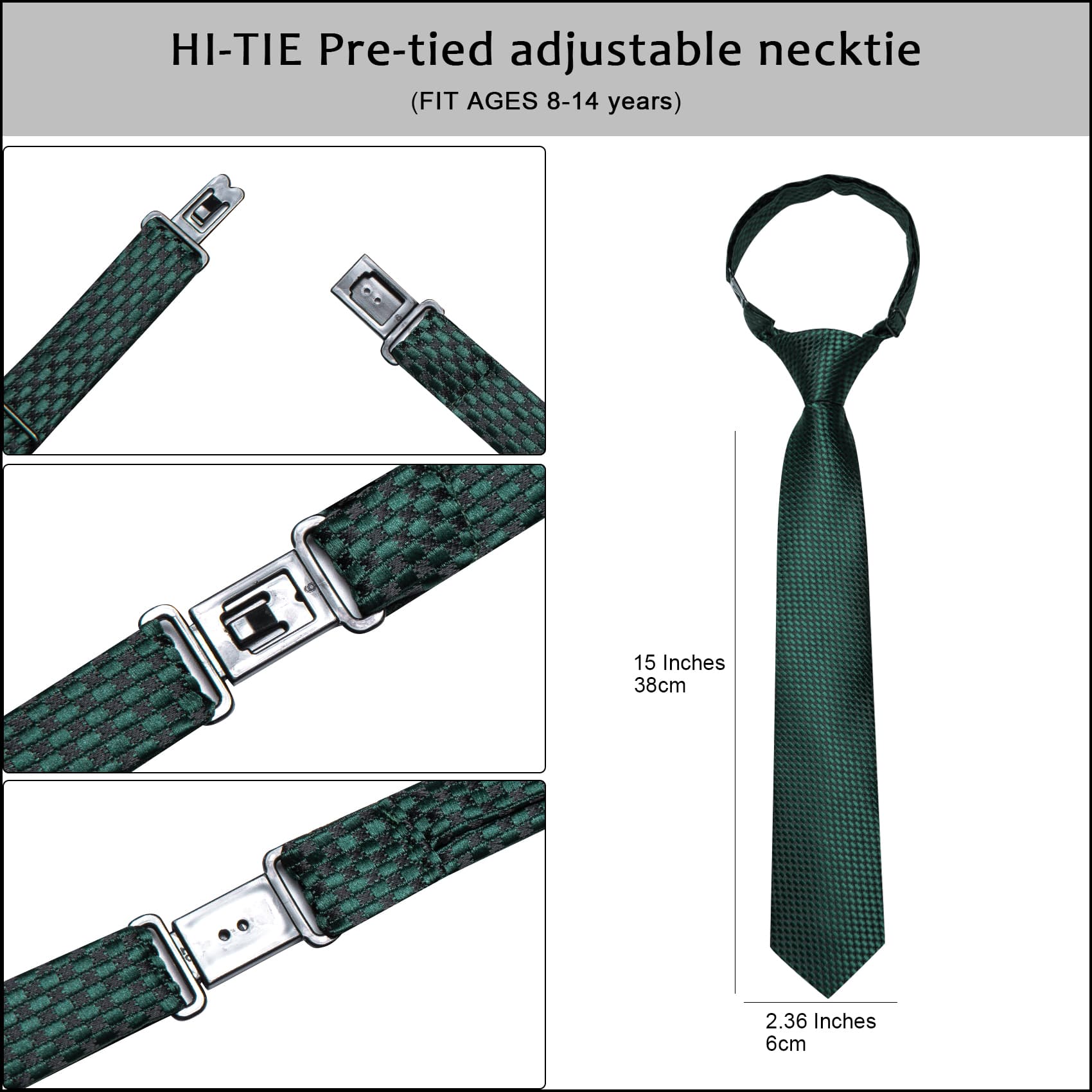 Hi-Tie Dark Green Plaid Boys Pre-tied Adjustable Tie Pocket Square