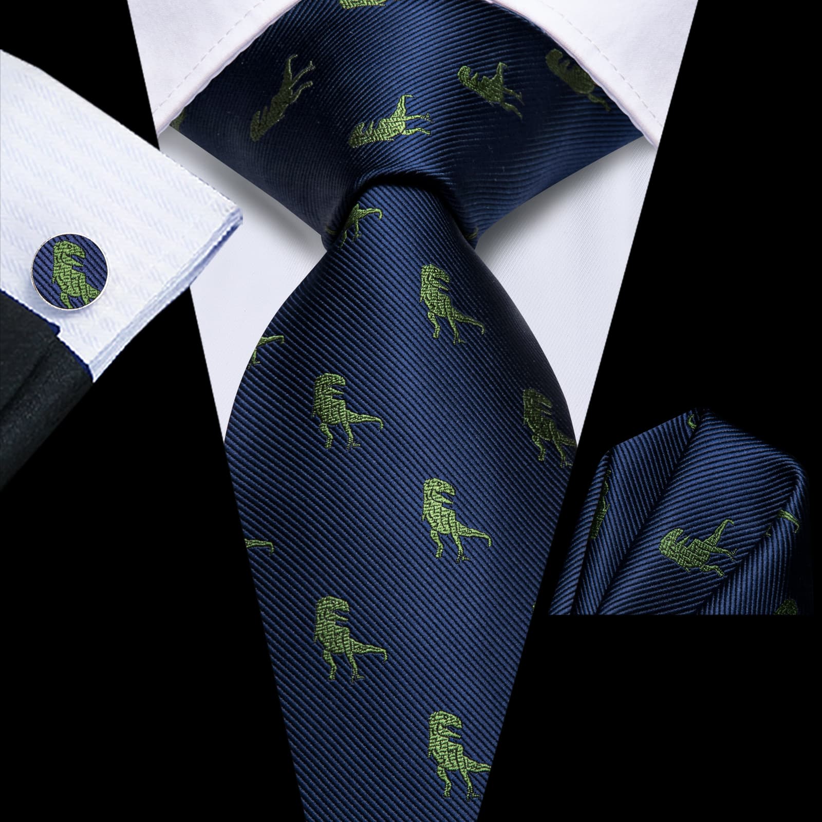 Hi-Tie Deep Blue Green Dinosaur Novelty Silk Mens Tie Pocket Square Cufflinks Set