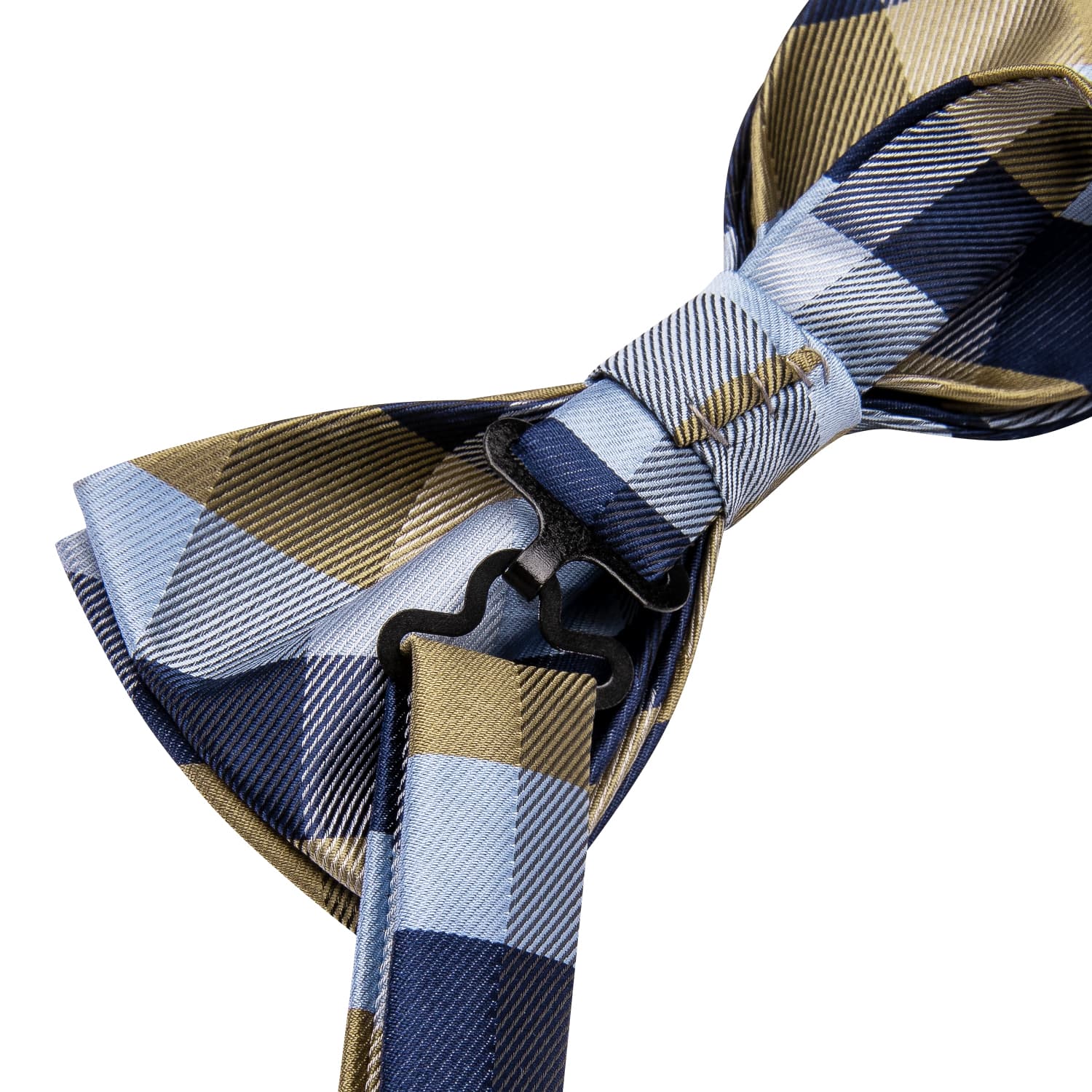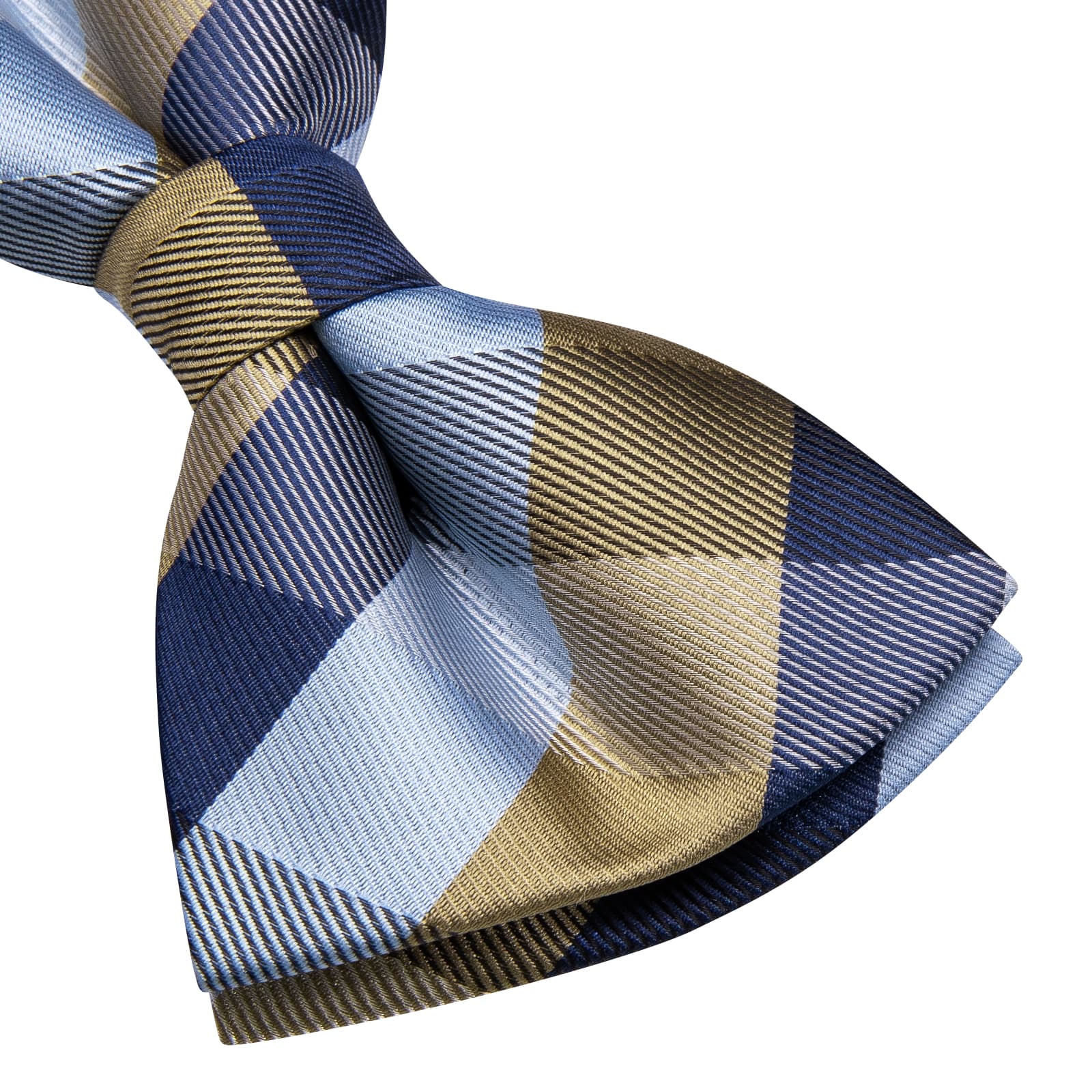 Hi-Tie Deep Blue Sky Blue Brown Checkered Bow Tie Hanky Cufflinks Set