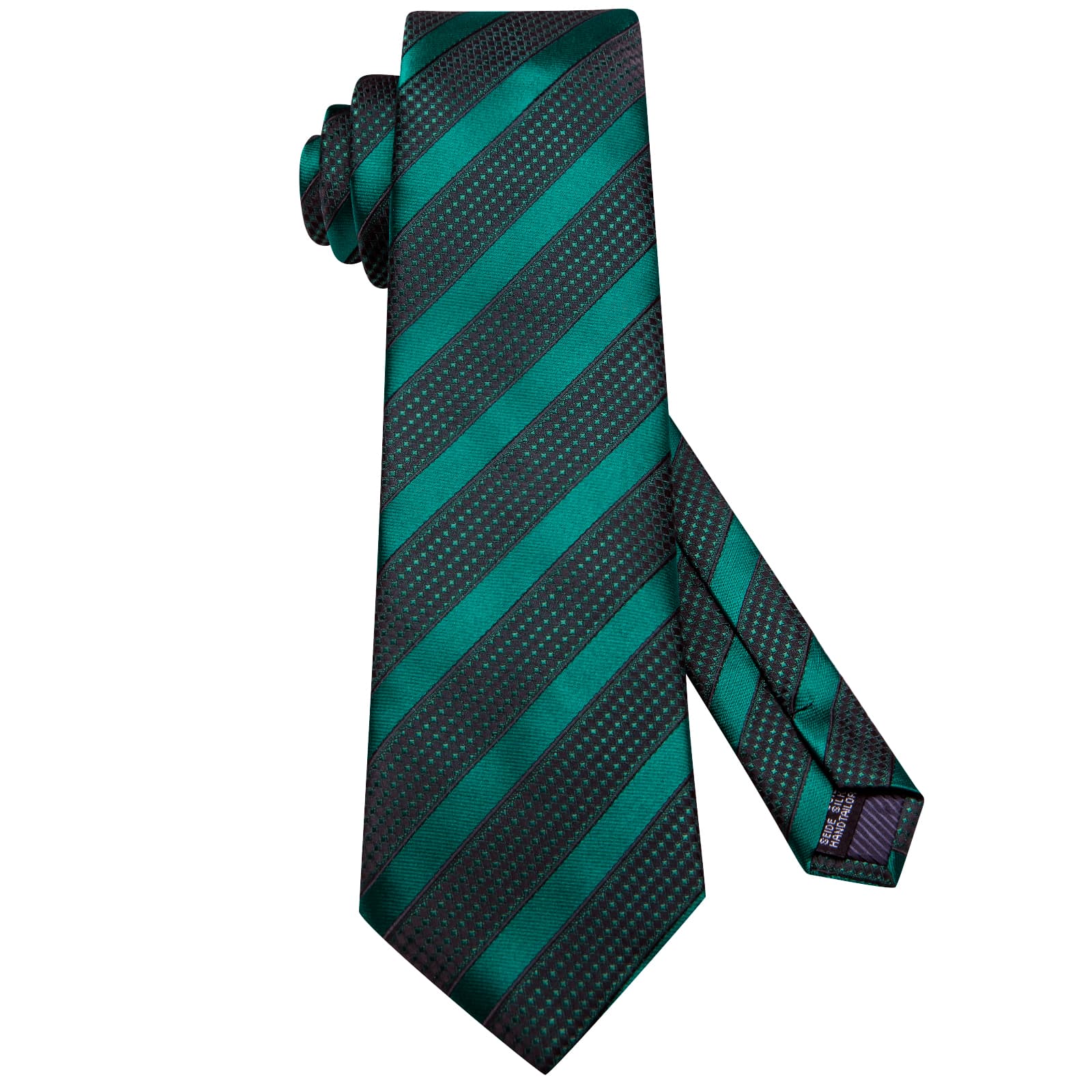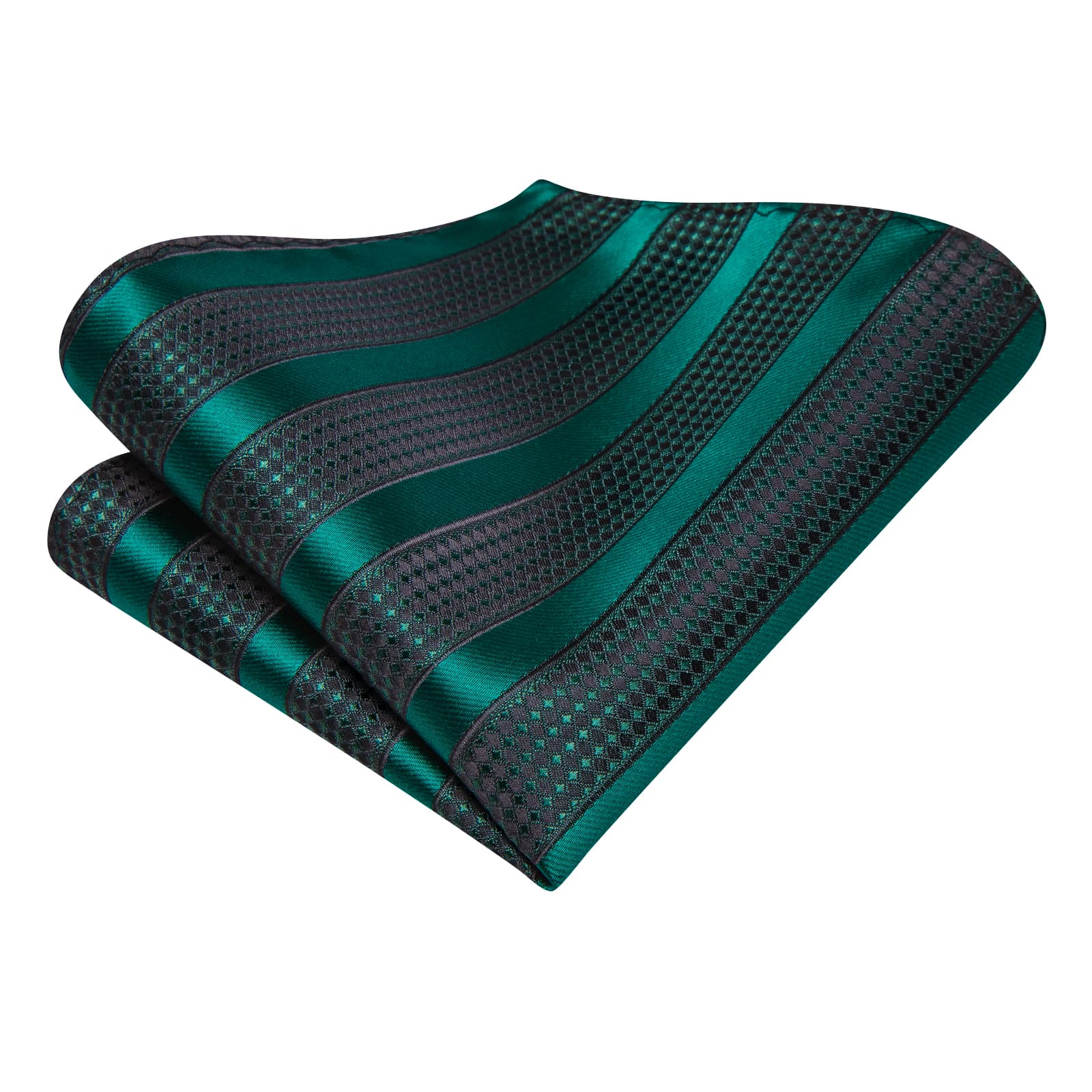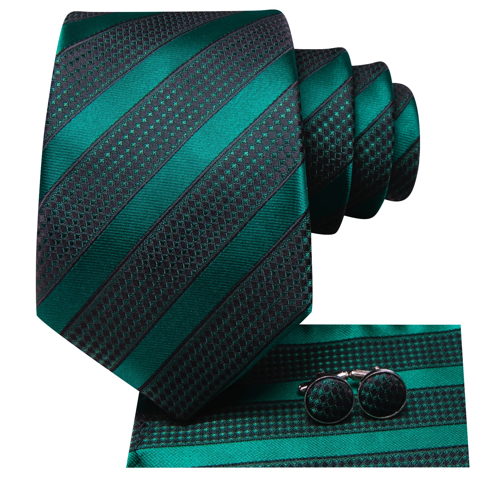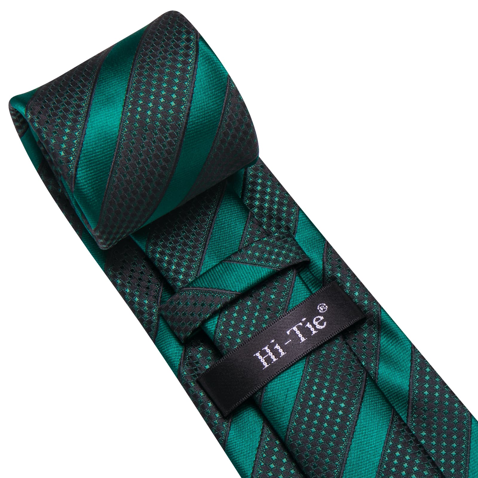 Hi-Tie Deep Green Black Striped Silk Men's Necktie Pocket Square Cufflinks Set