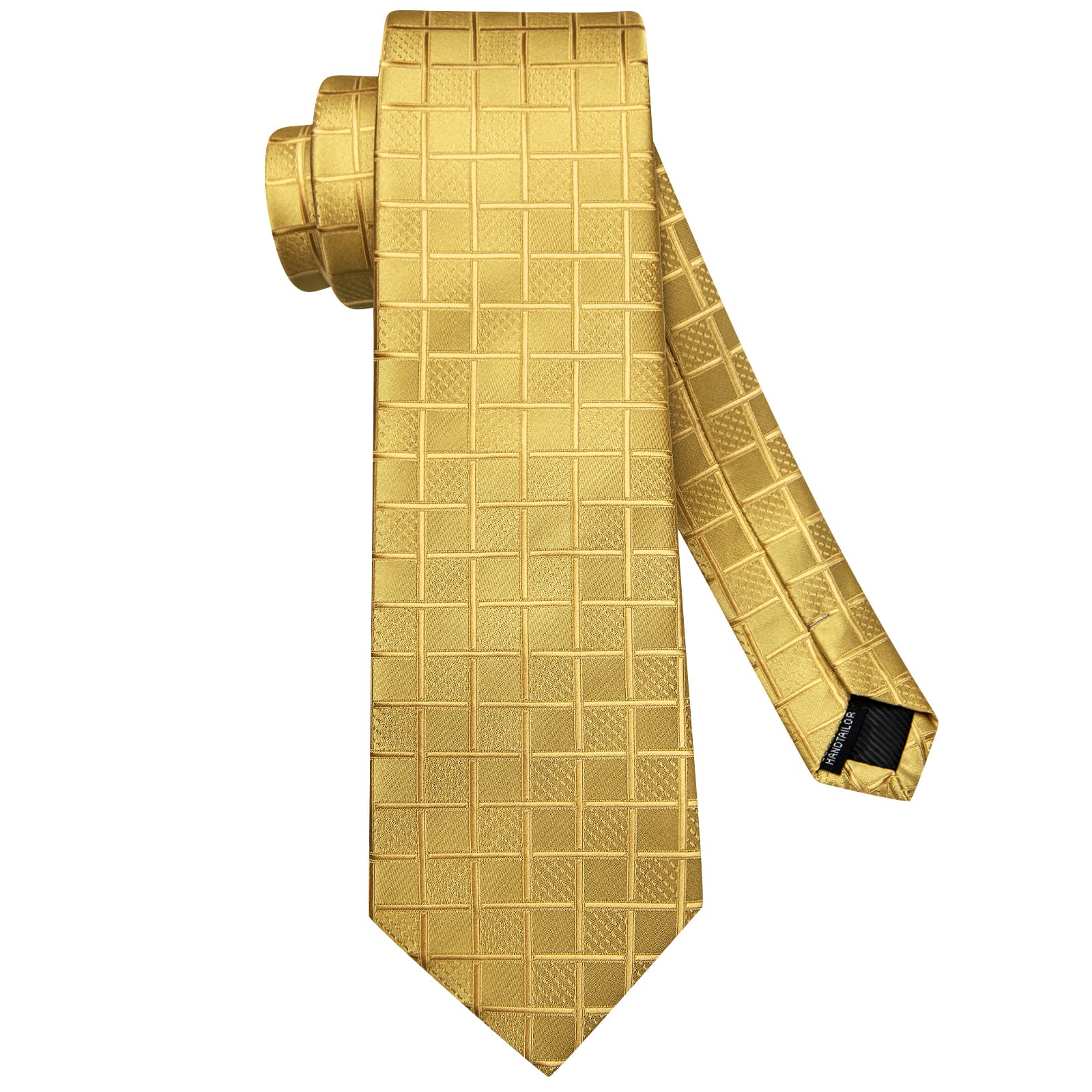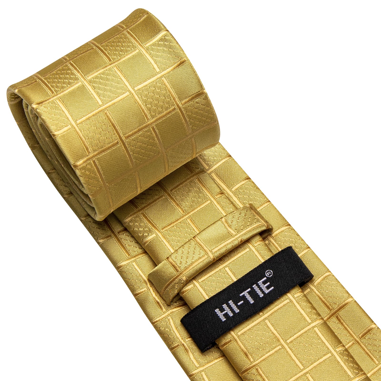 Hi-Tie Gold Yellow Checkered Mens Necktie Handkerchief Cufflinks Set