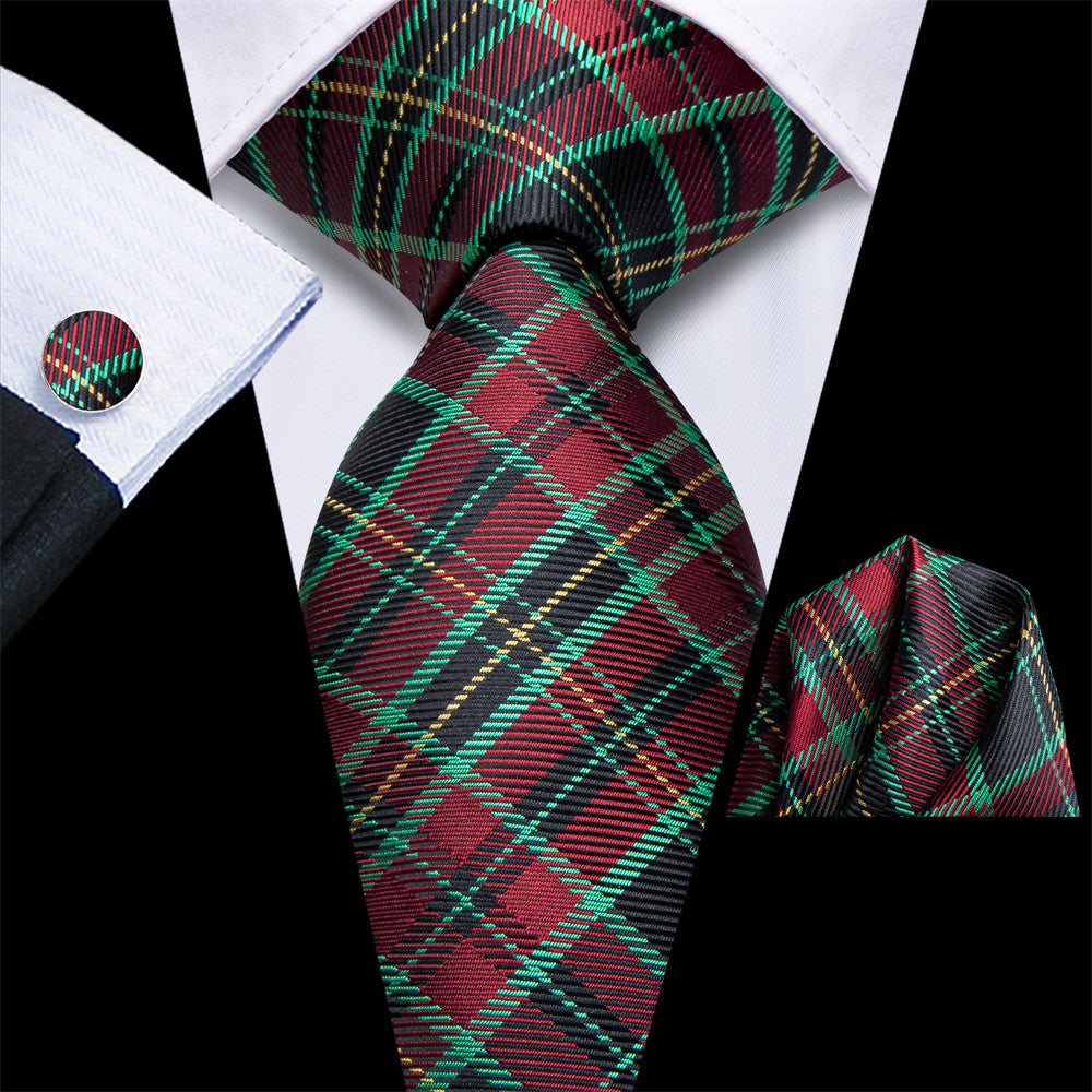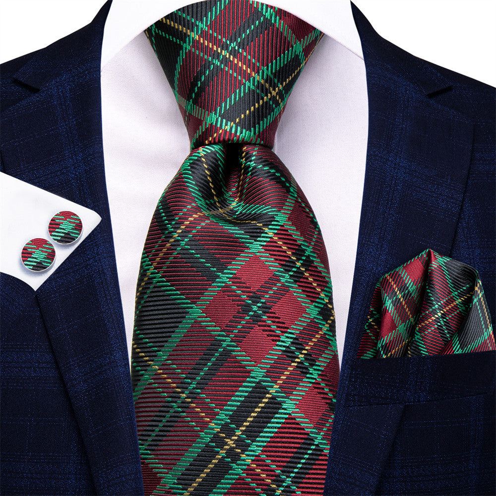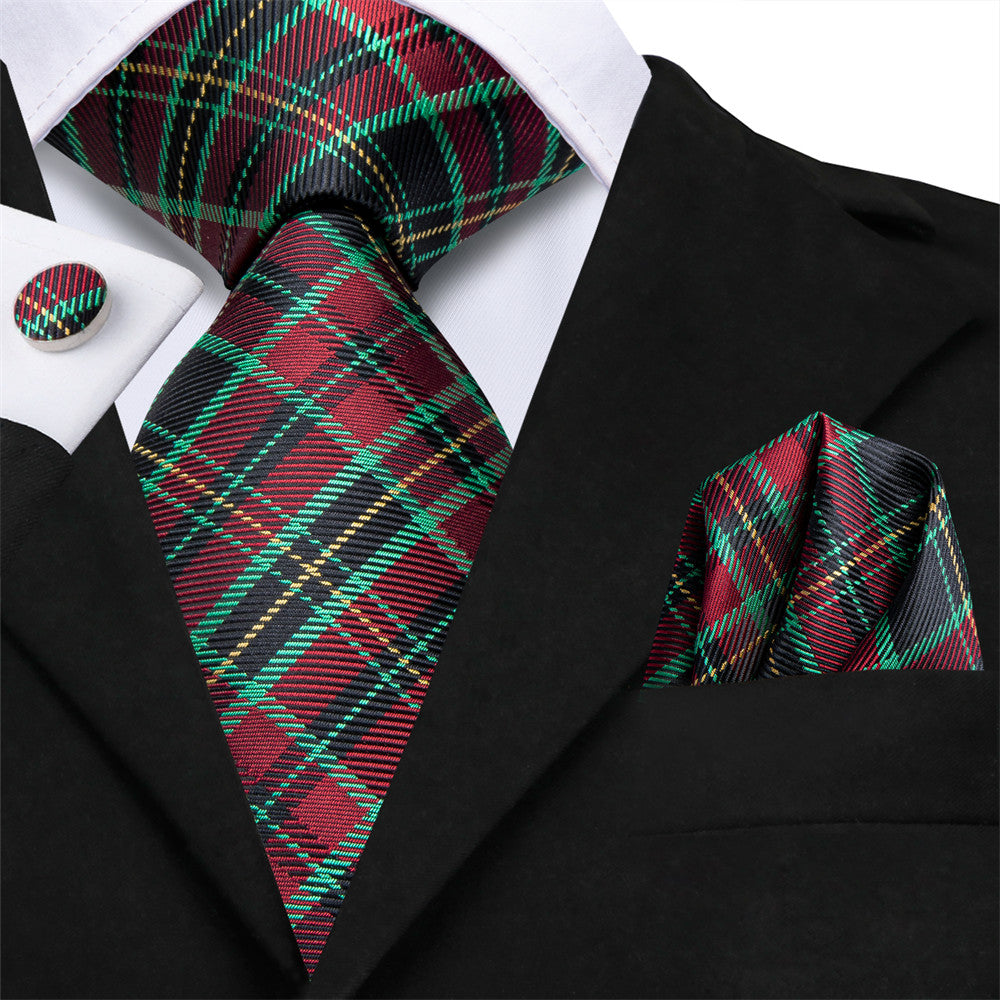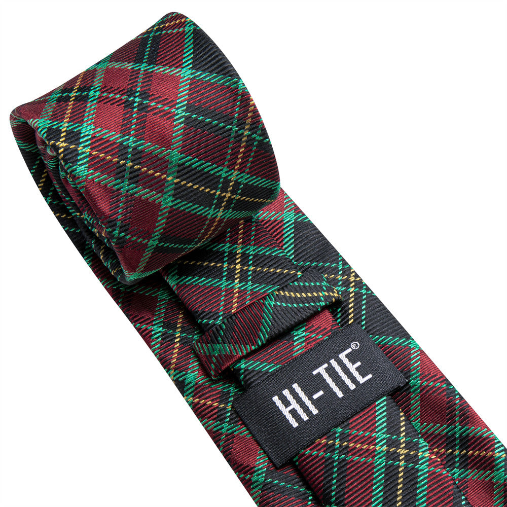Hi-Tie Green Red Plaid Silk Mens Dress Tie Hanky Cufflinks Set