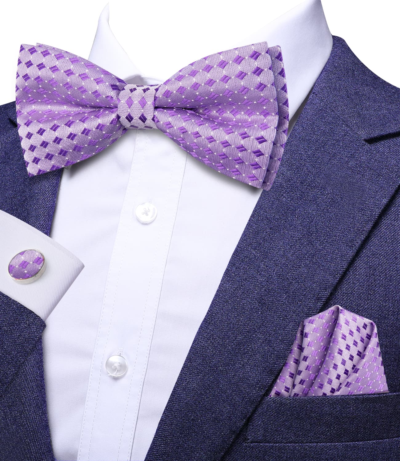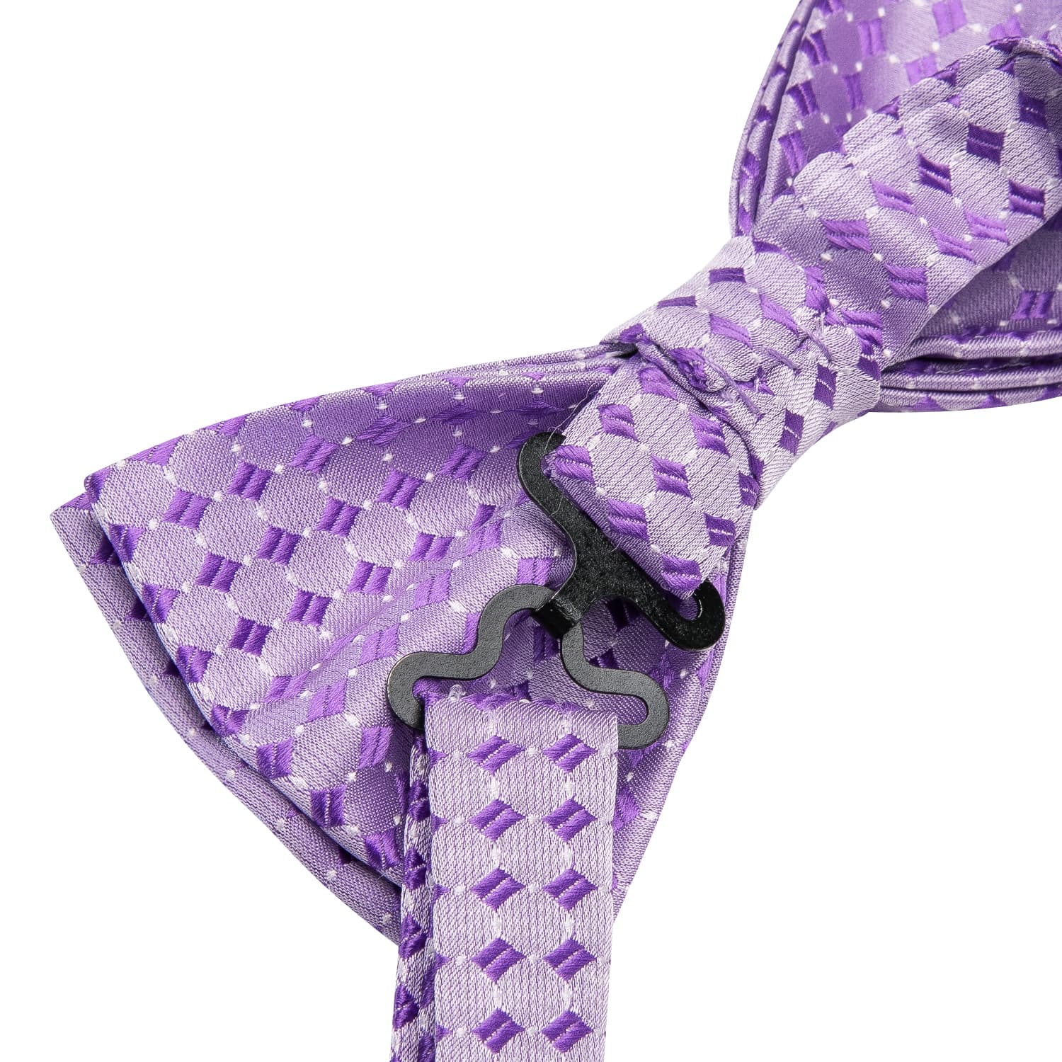 Hi-Tie Lavender Purple Bow Tie Men's Geometric Tie Hanky Cufflinks Set