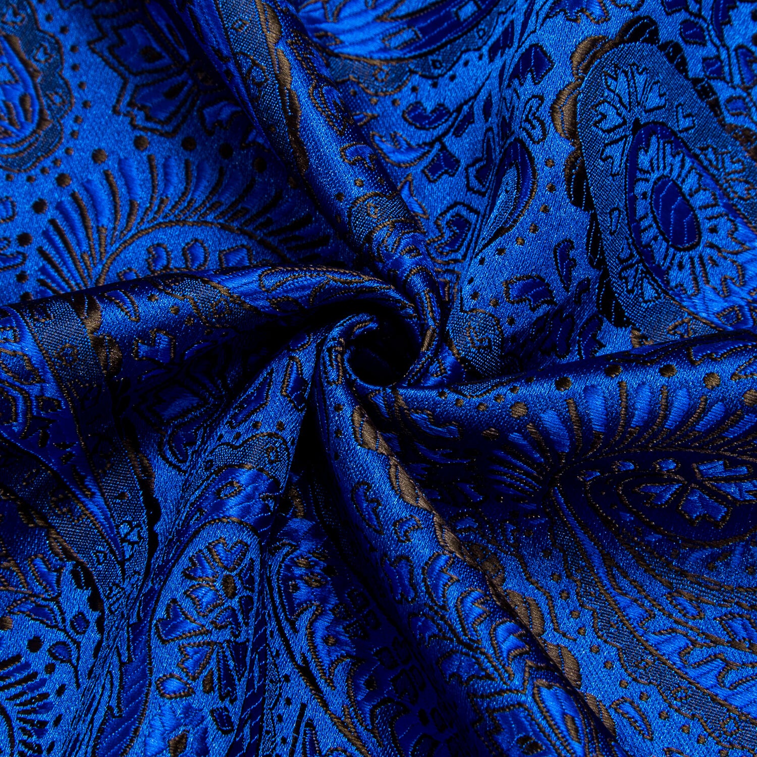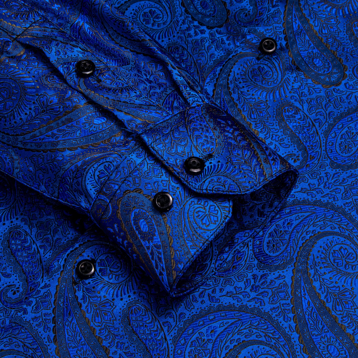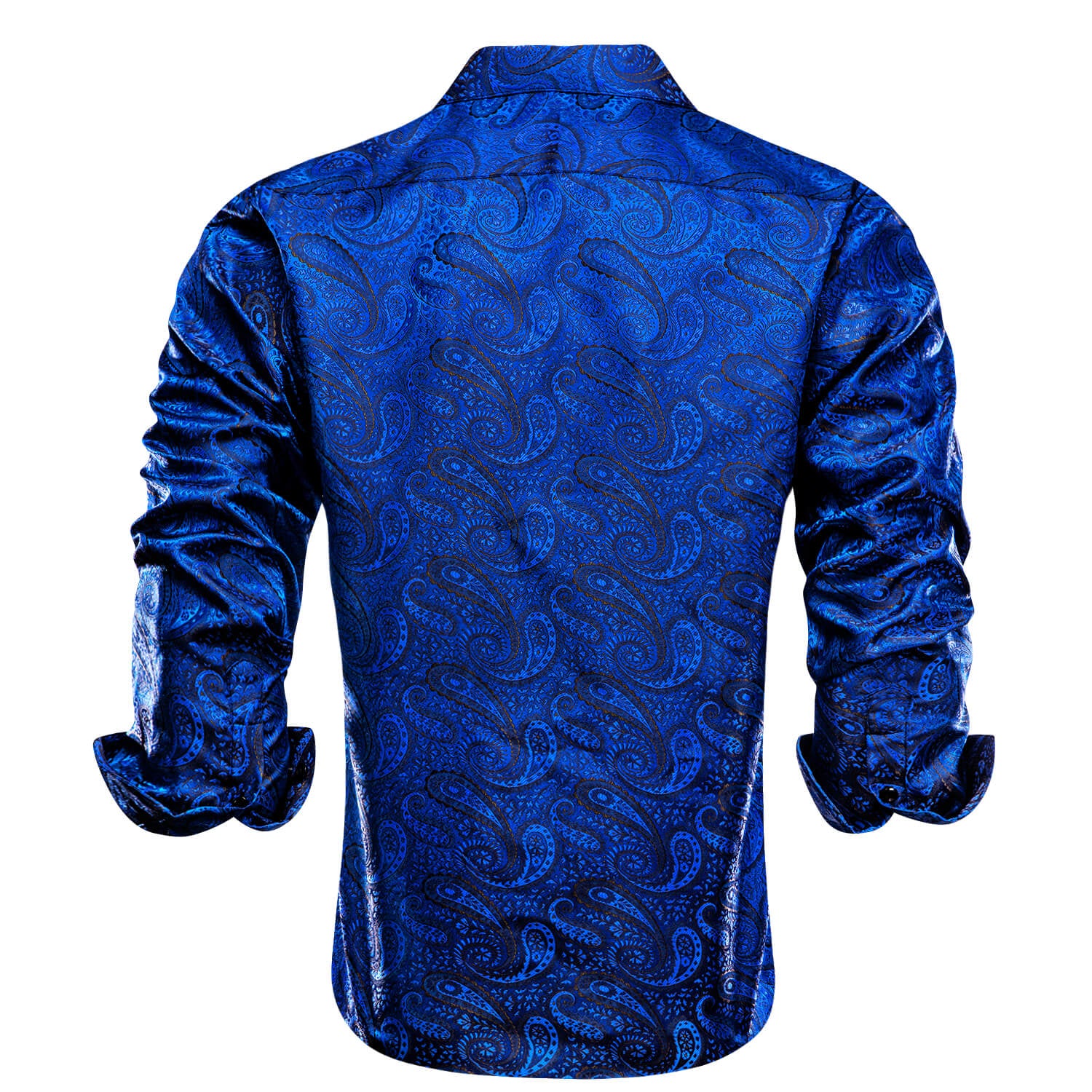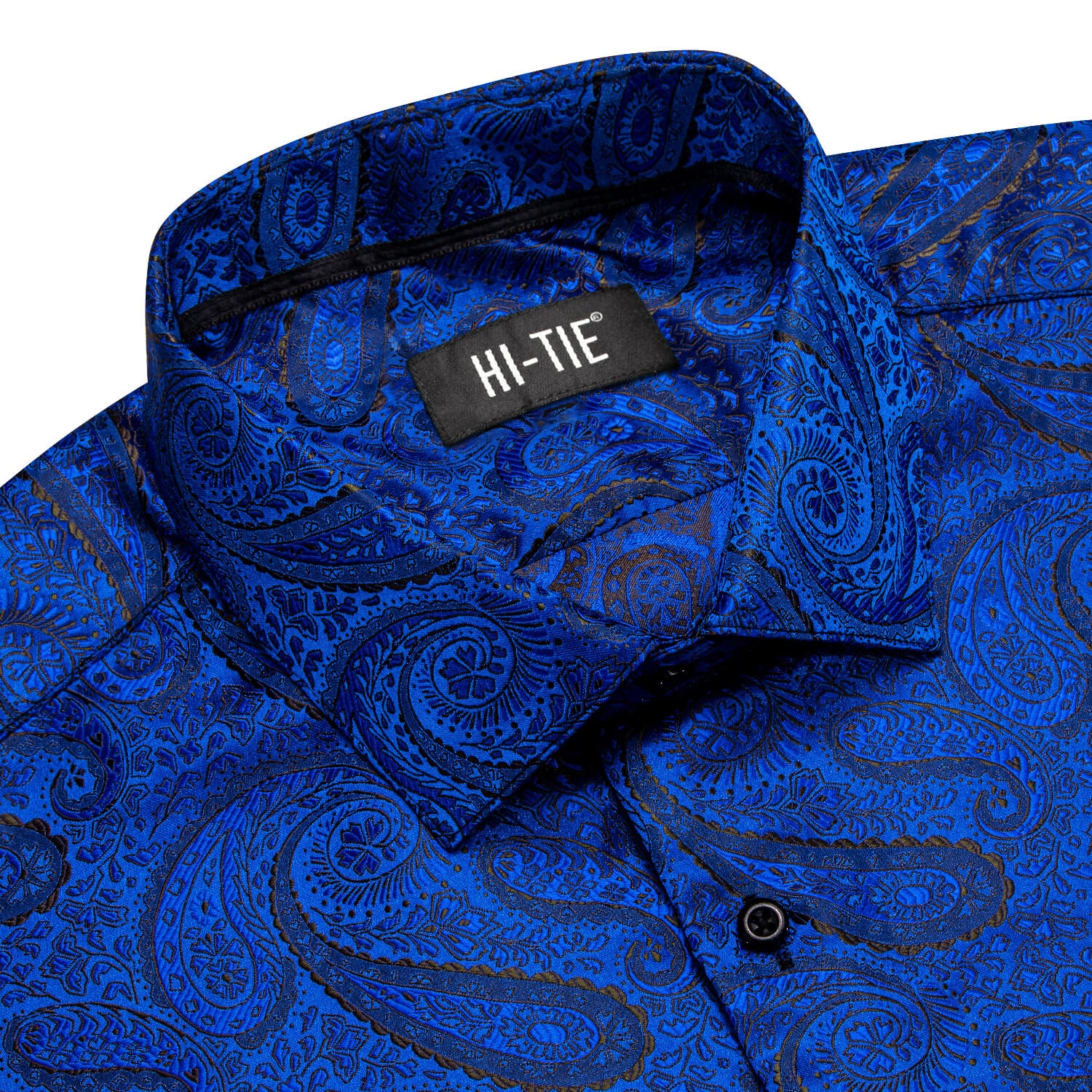 Hi-Tie Long Sleeve Shirt Cobalt Blue Woven Paisley Silk Shirt for Men