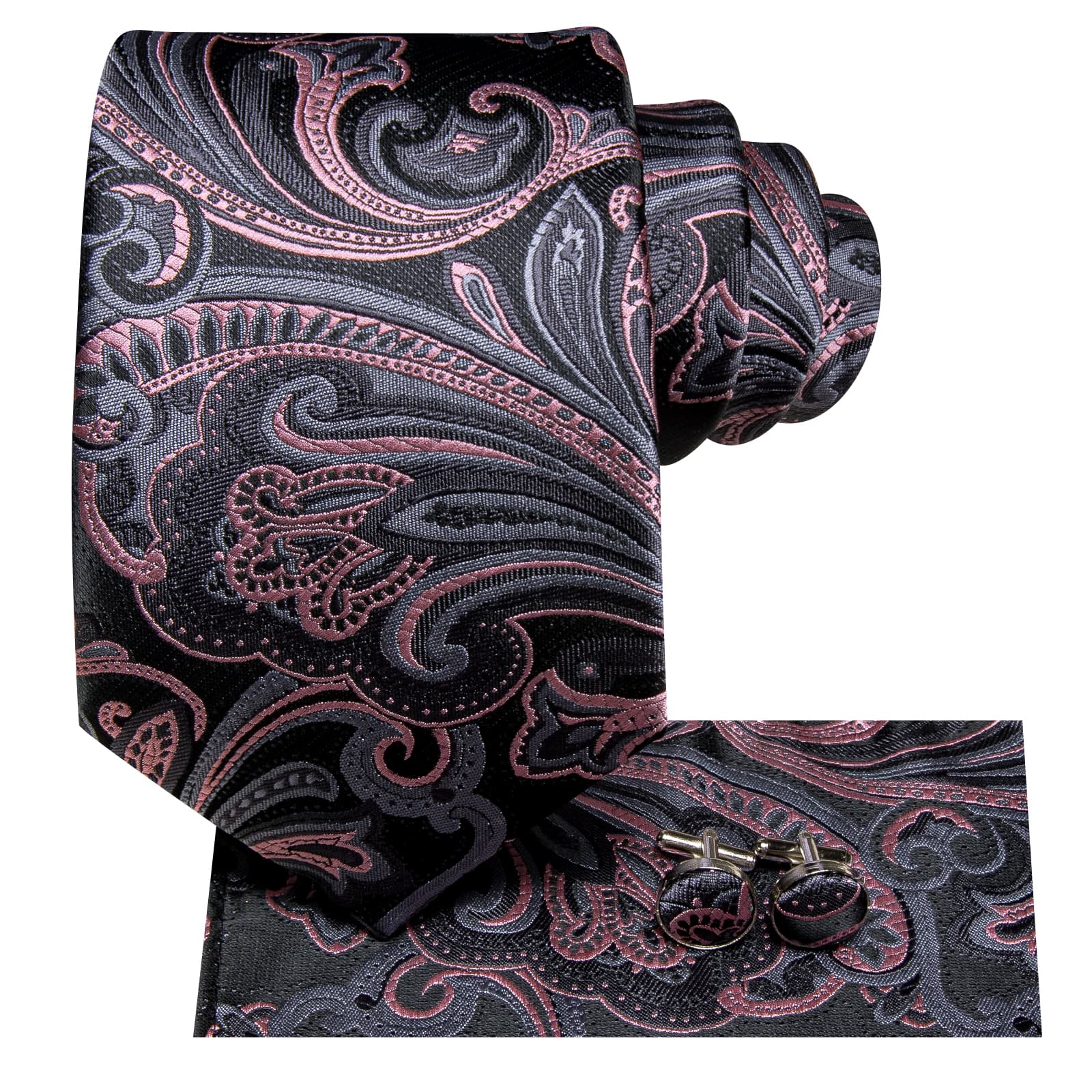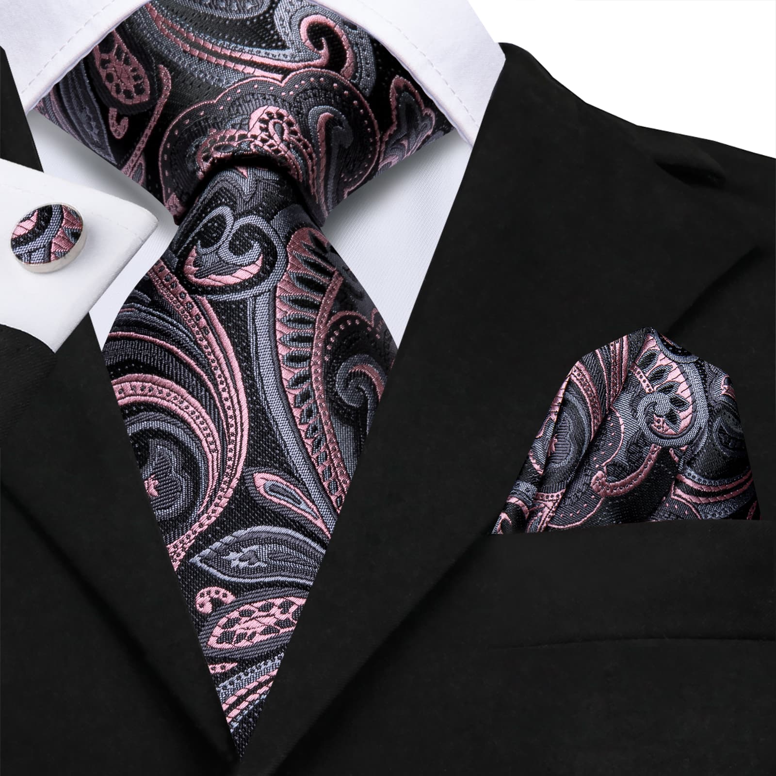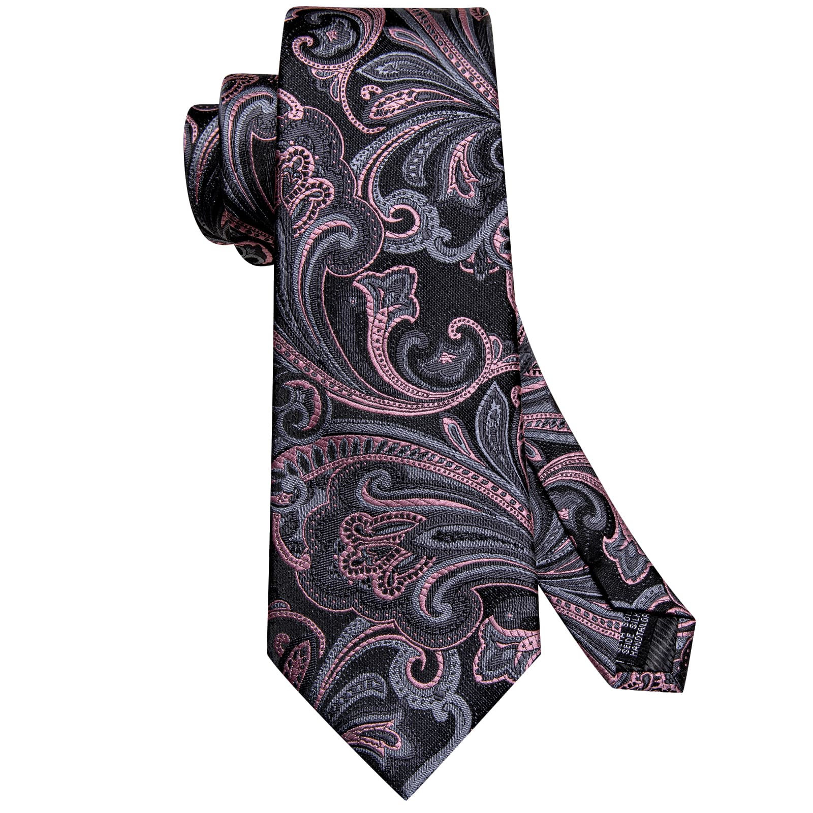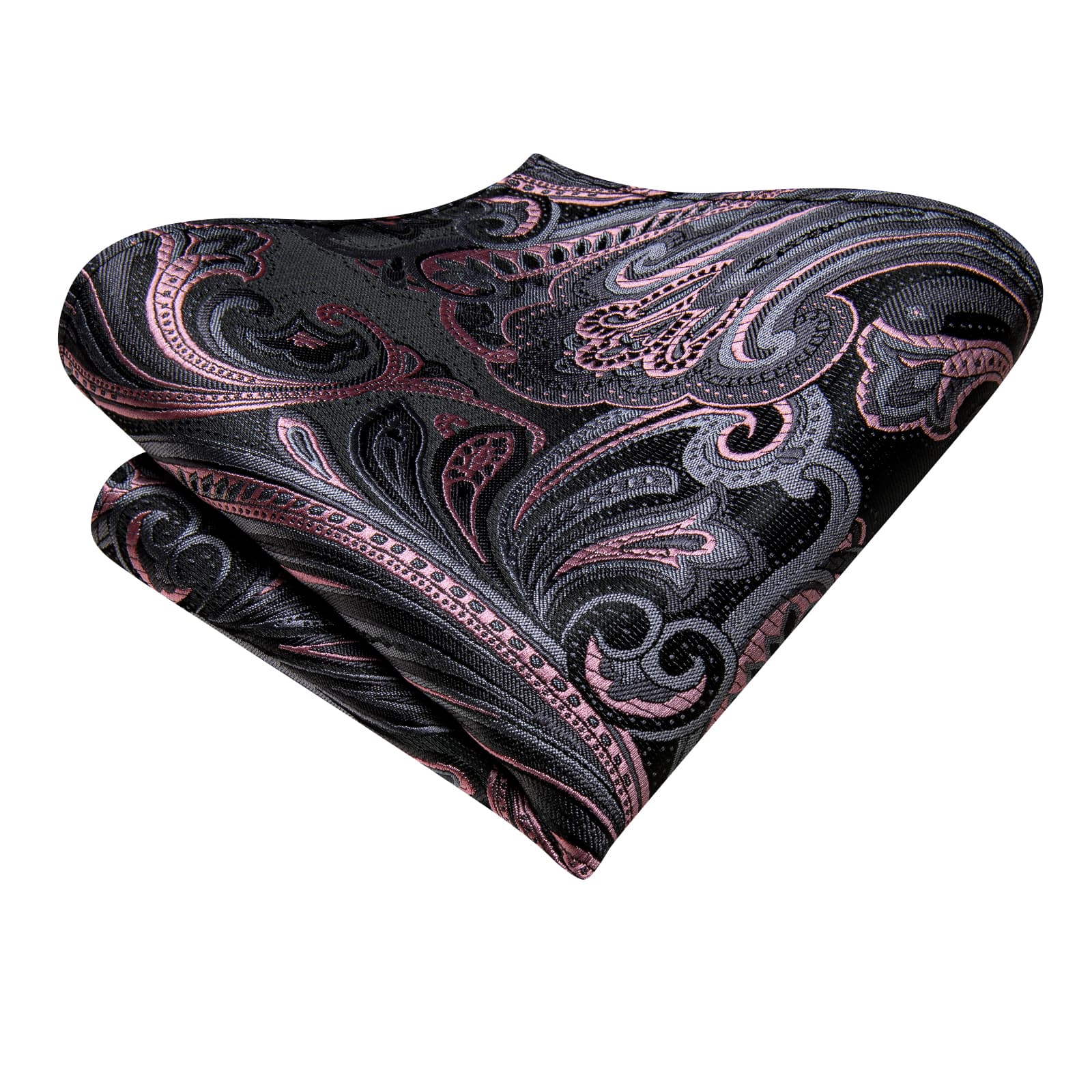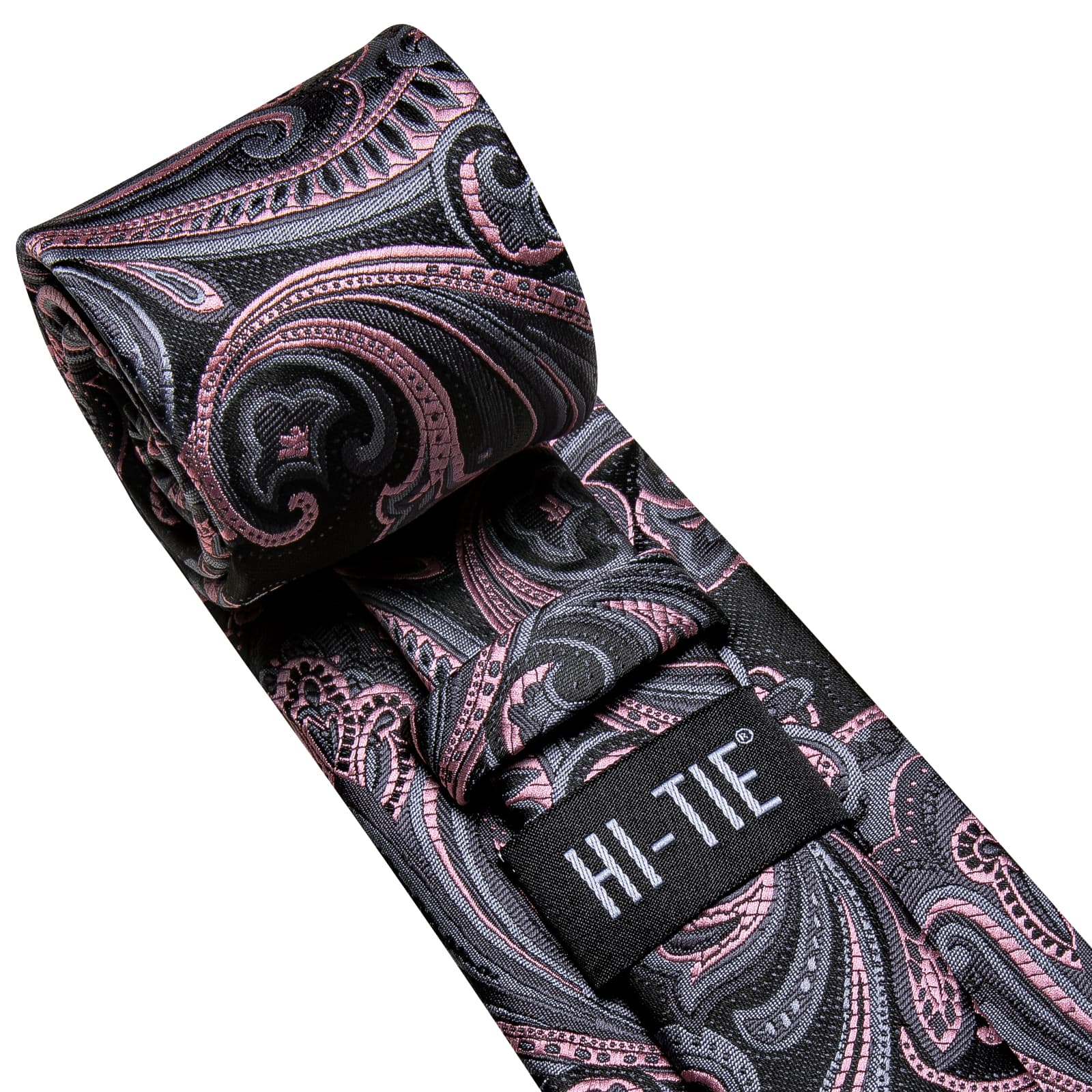 Hi-Tie Men's Necktie Black Pink Grey Paisley Tie Hanky Cufflinks Set