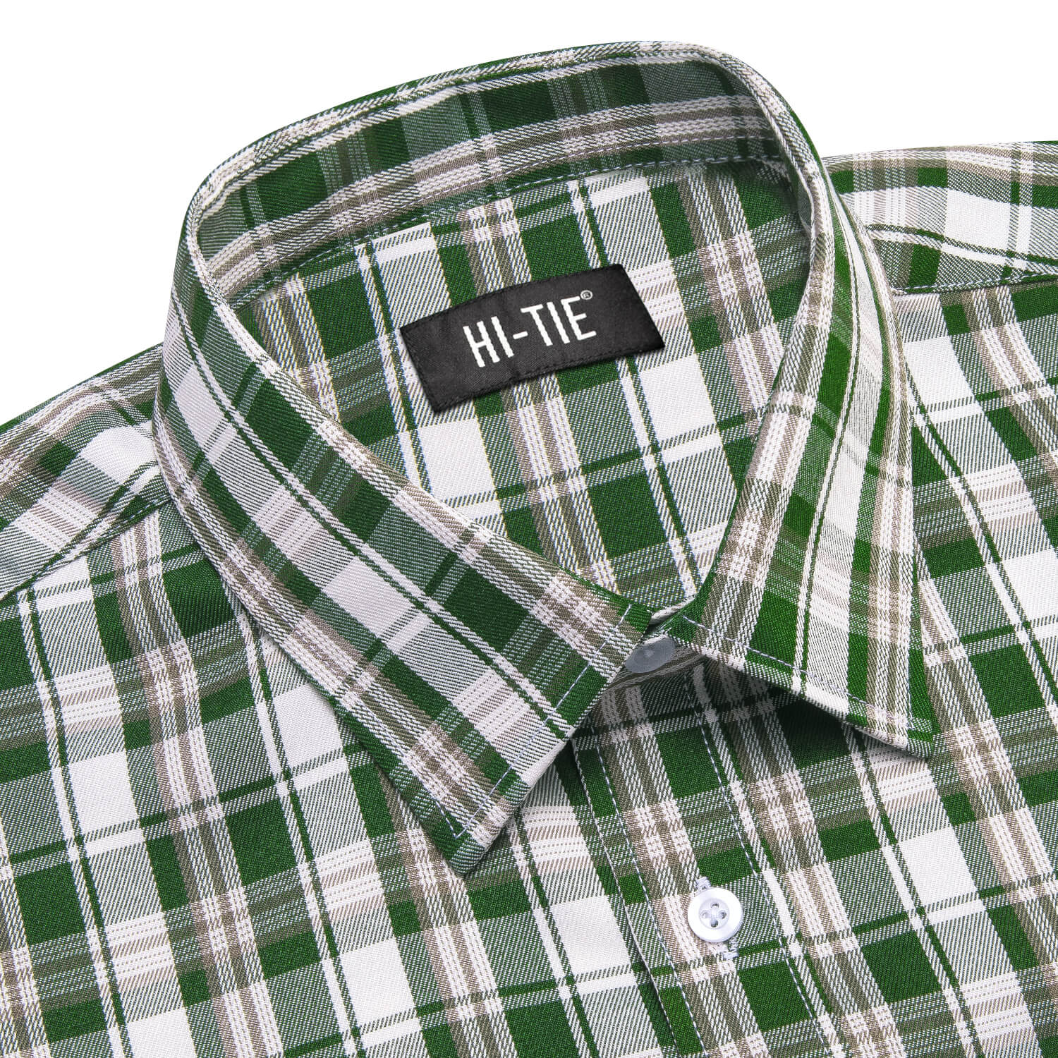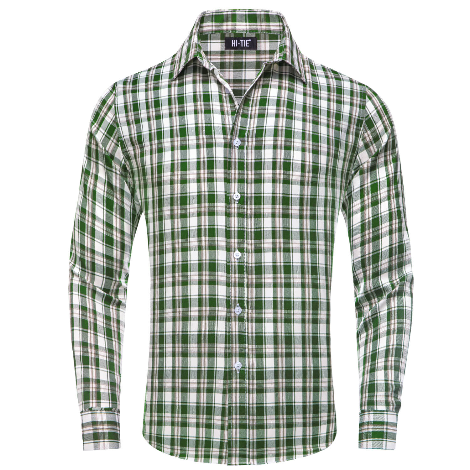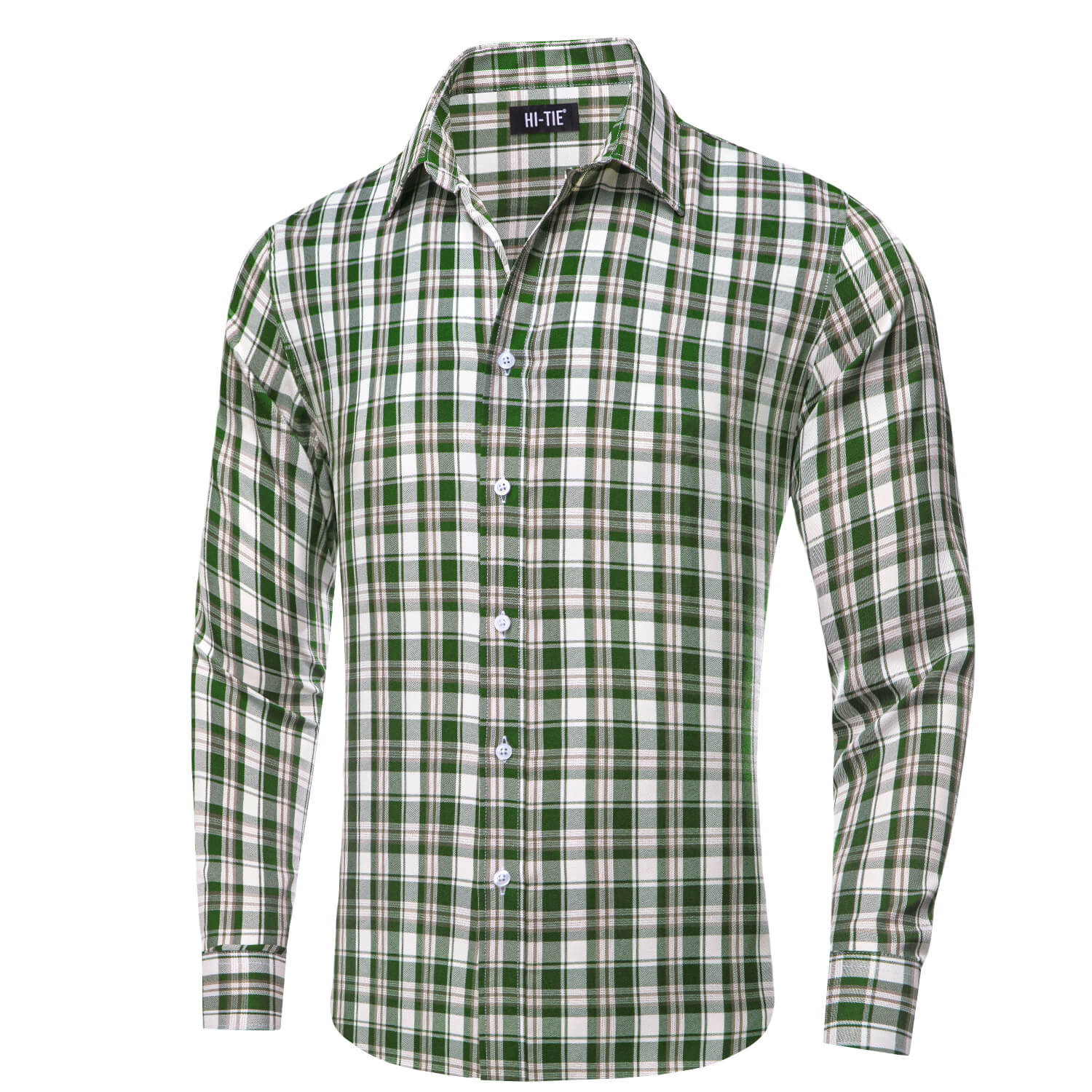 Hi-Tie Men's Shirt Green White Brown Plaid Silk Long Sleeve Shirt