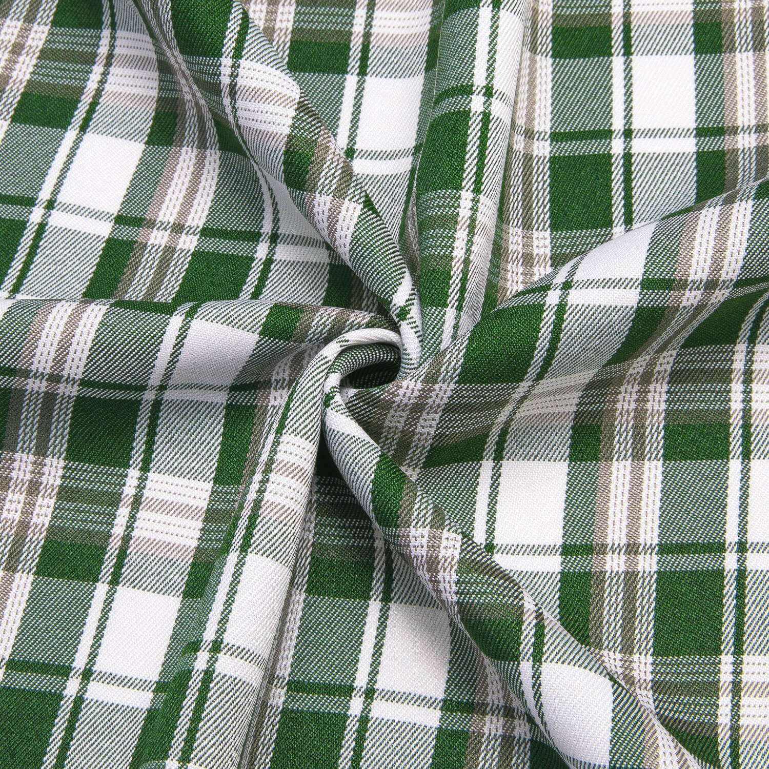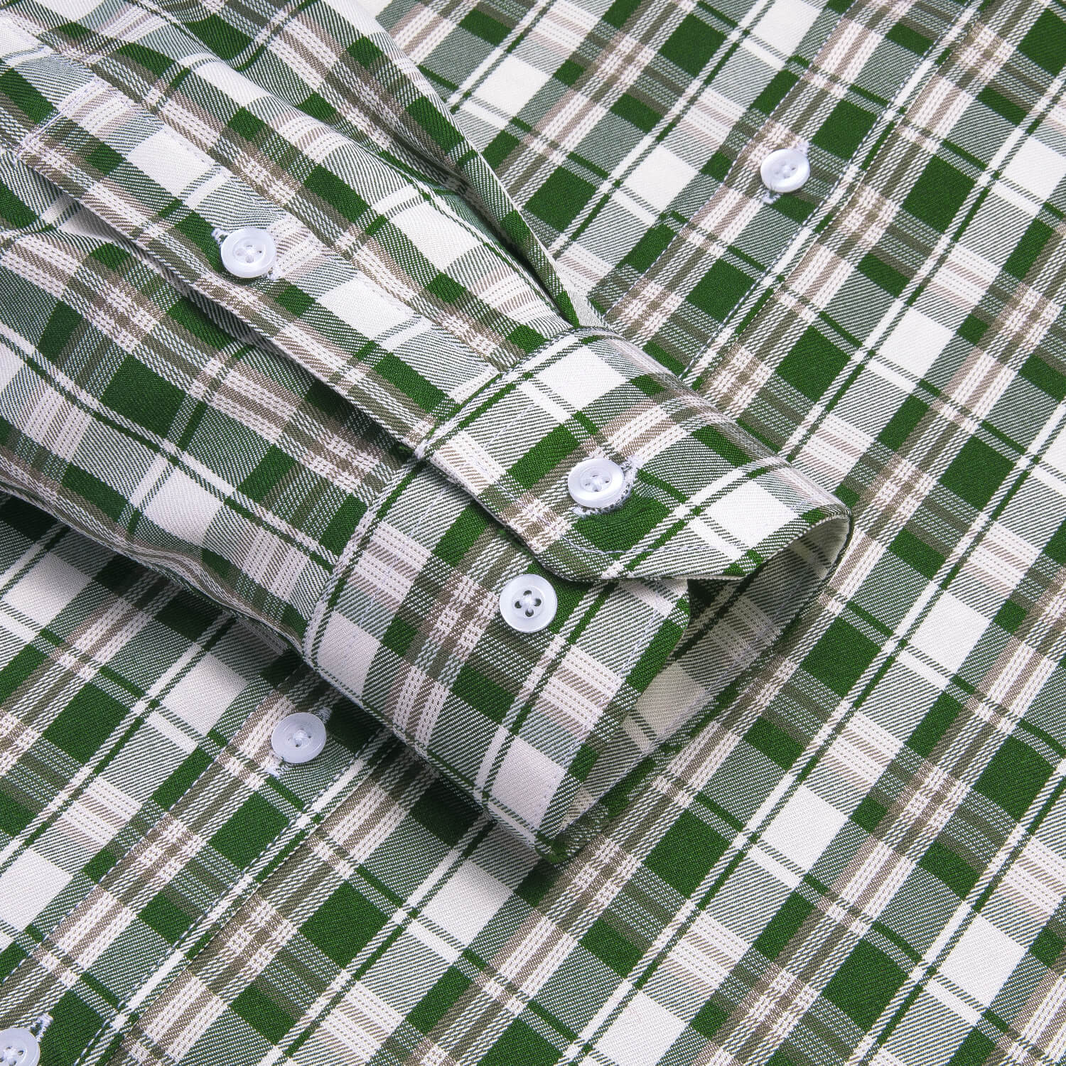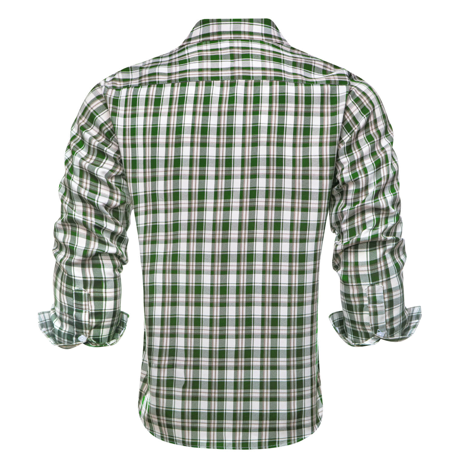 Hi-Tie Men's Shirt Green White Brown Plaid Silk Long Sleeve Shirt