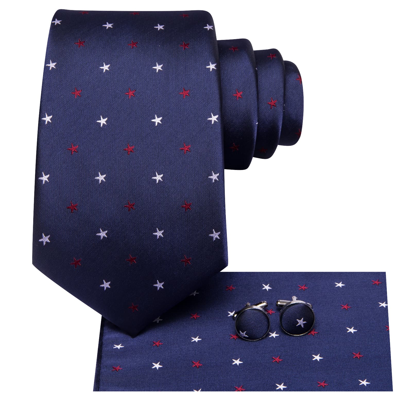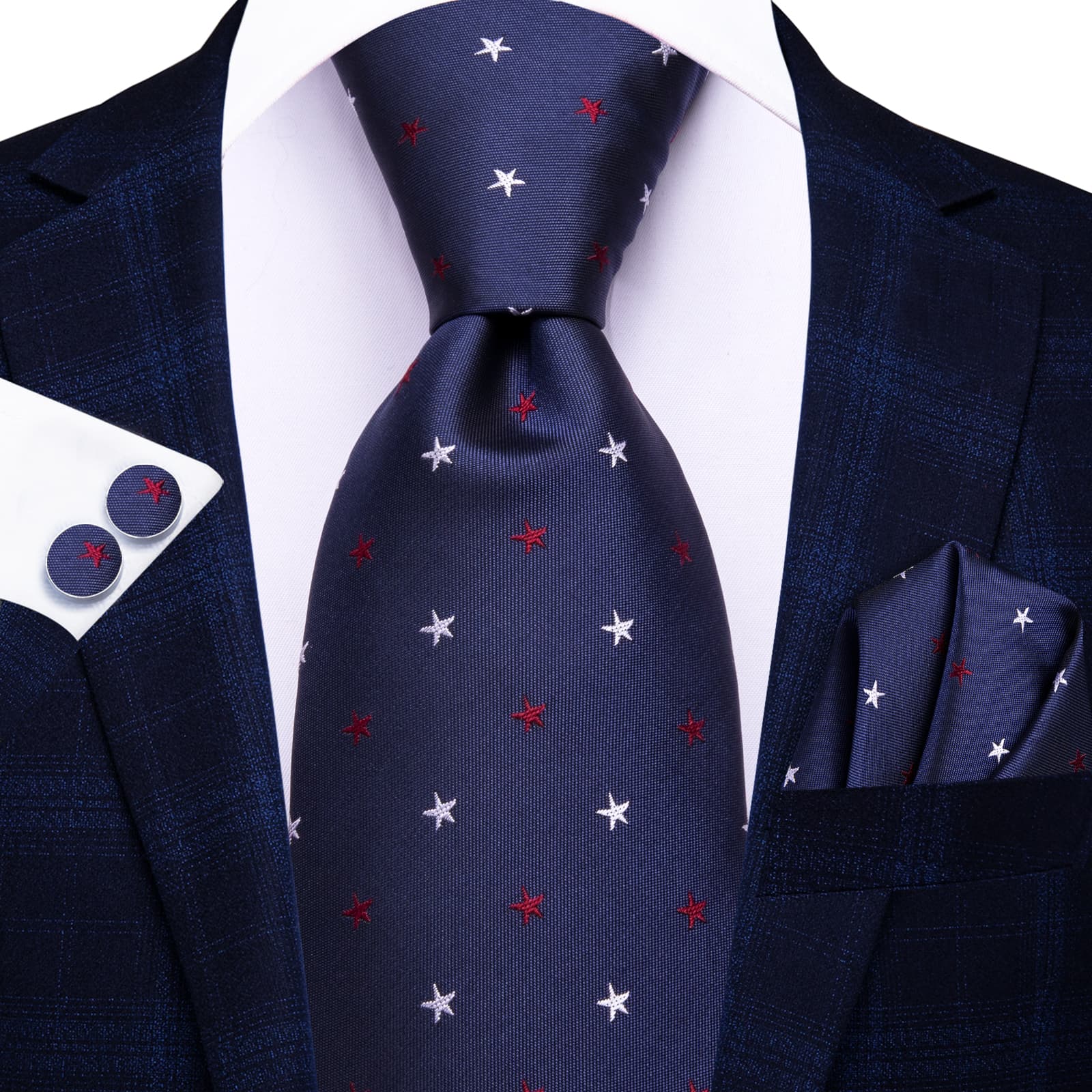 Hi-Tie Navy Blue Tie Jacquard Red White Stars Novelty Mens Necktie Set