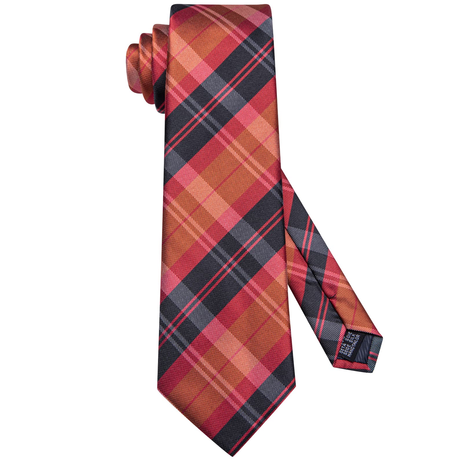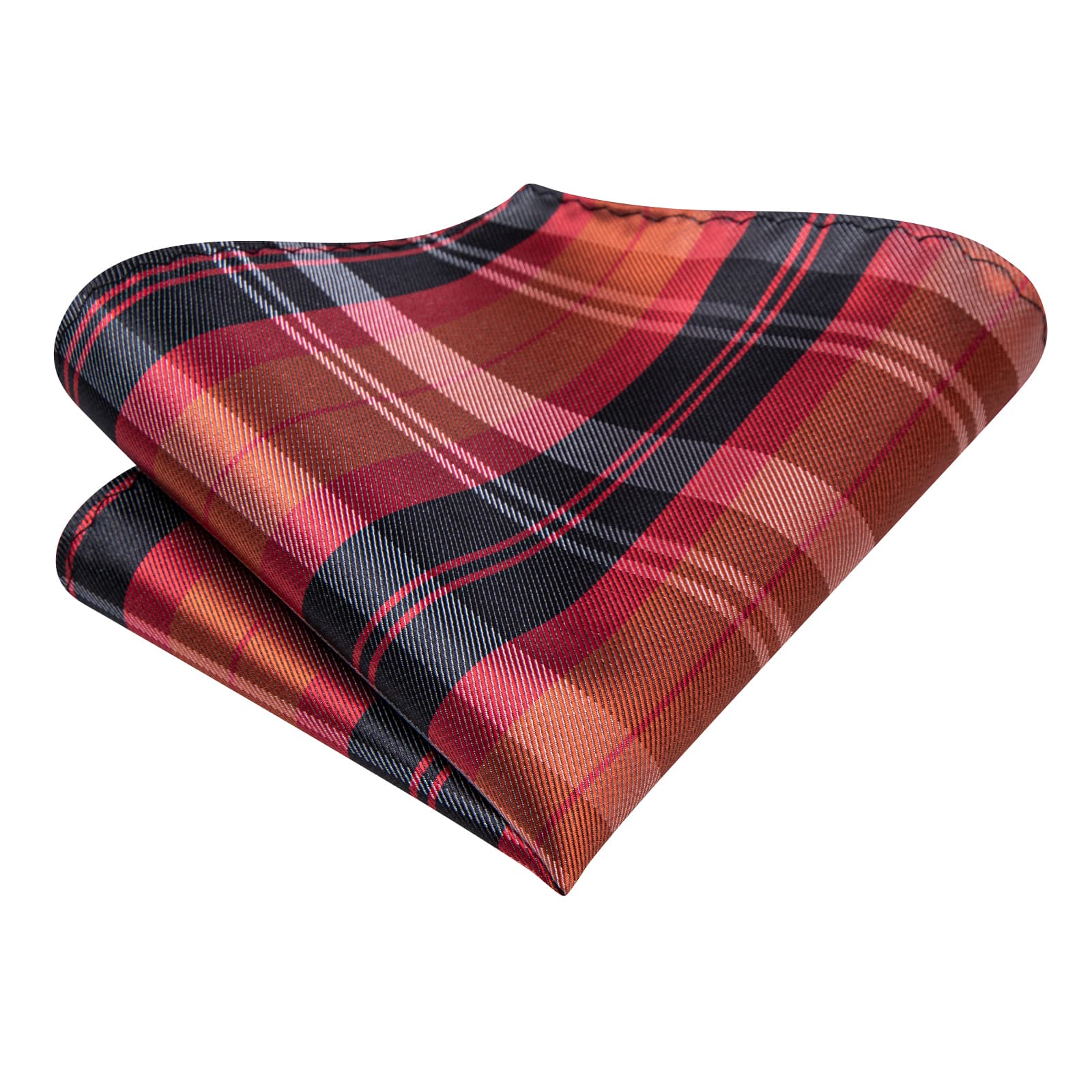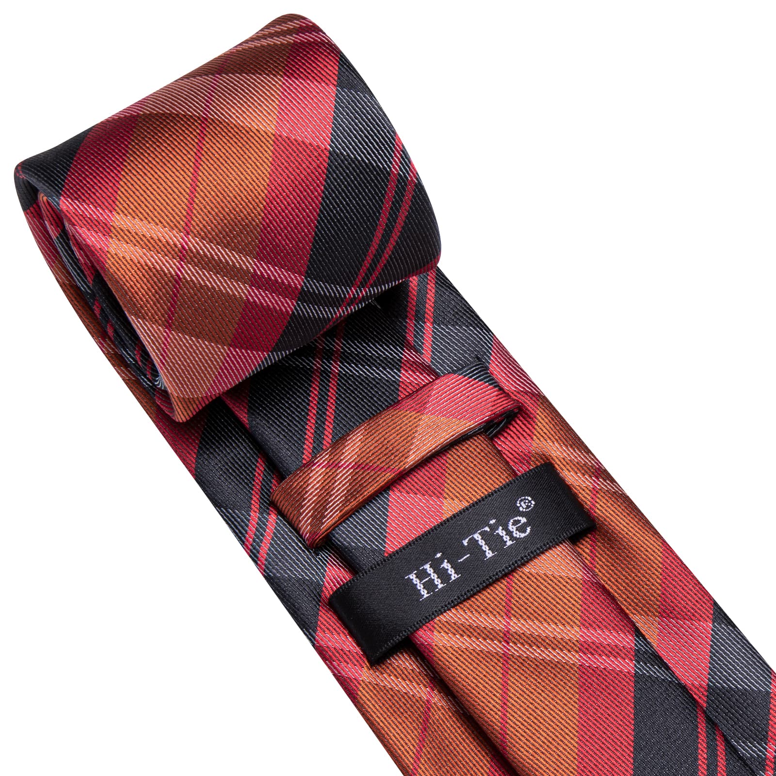 Hi-Tie Orange Red Black Plaid Silk Mens Tie Handkerchief Cufflinks Set