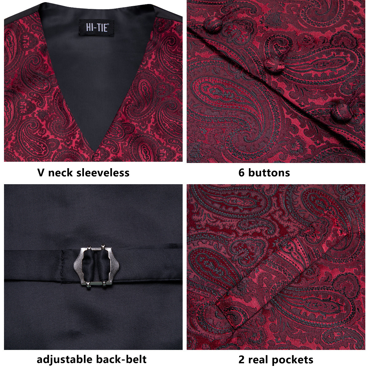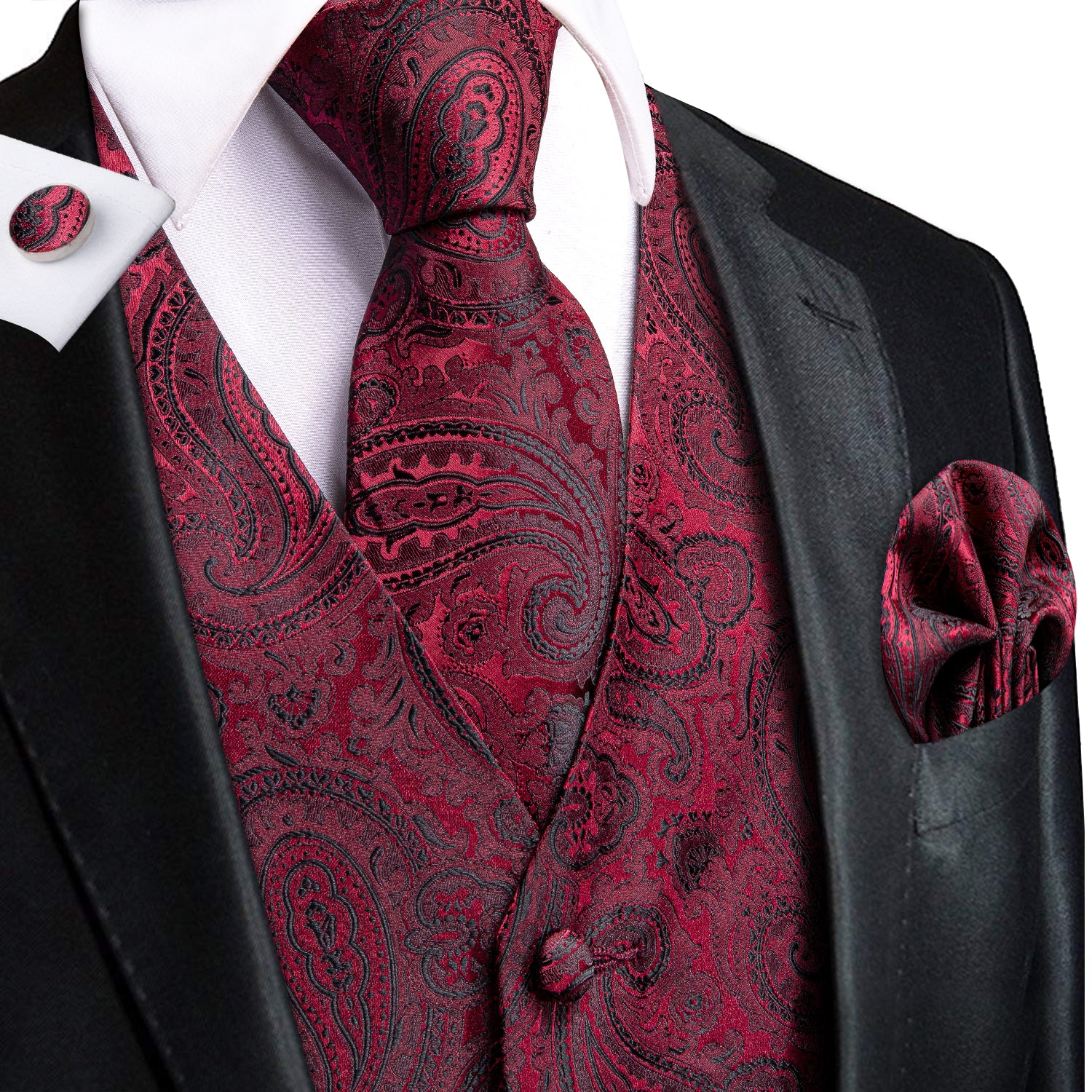 Hi-Tie Red Paisley Men's Vest Hanky Cufflinks Tie Set