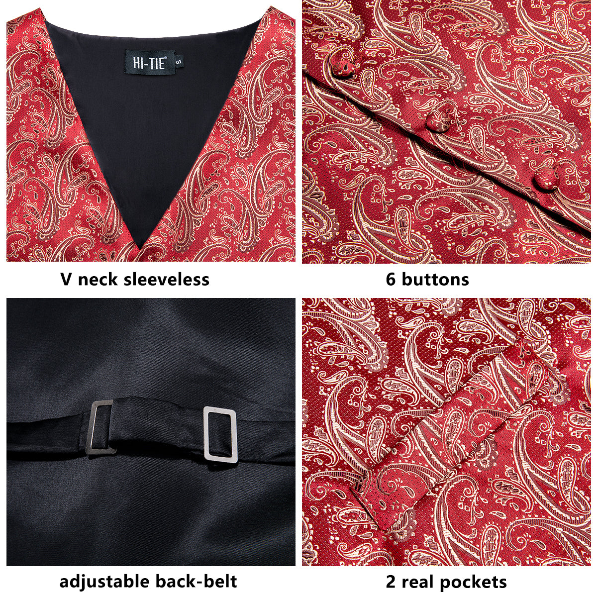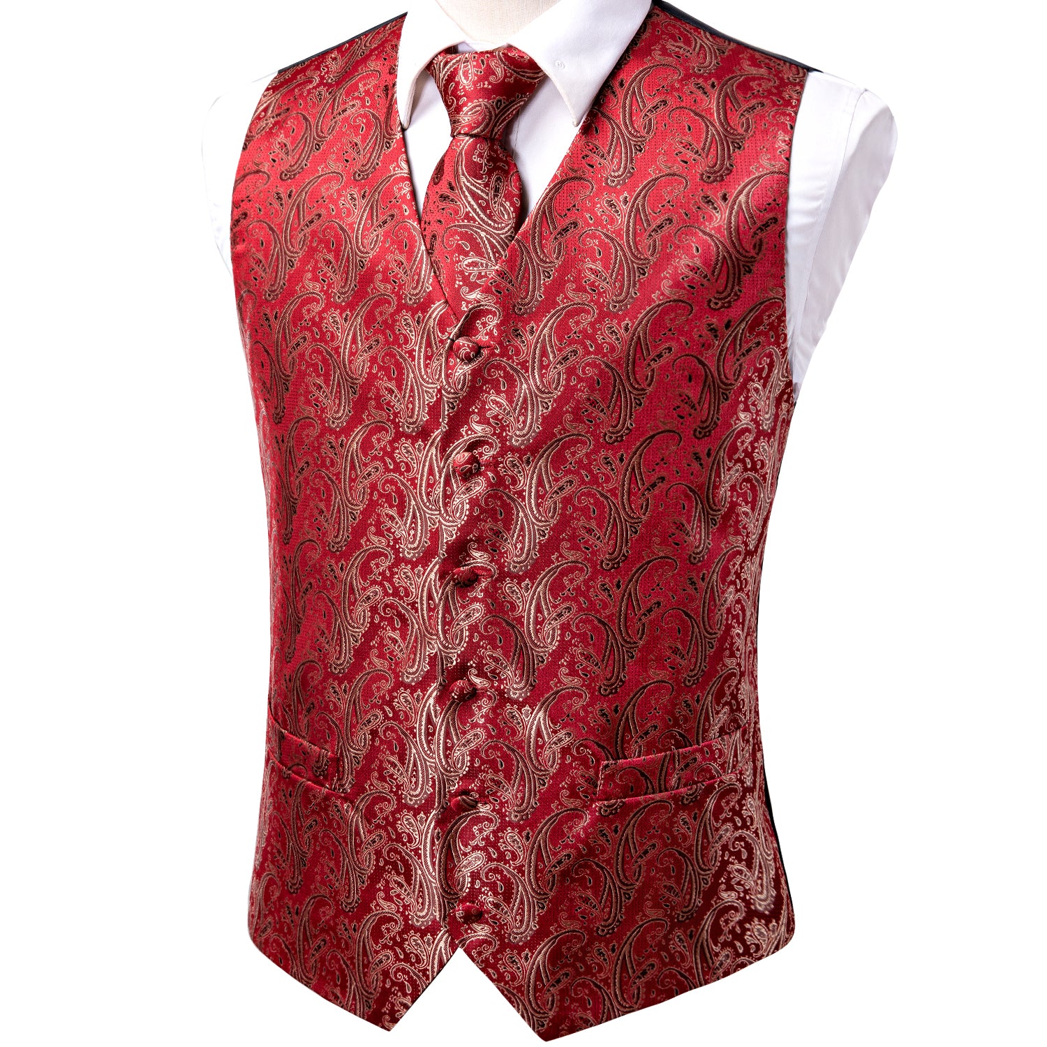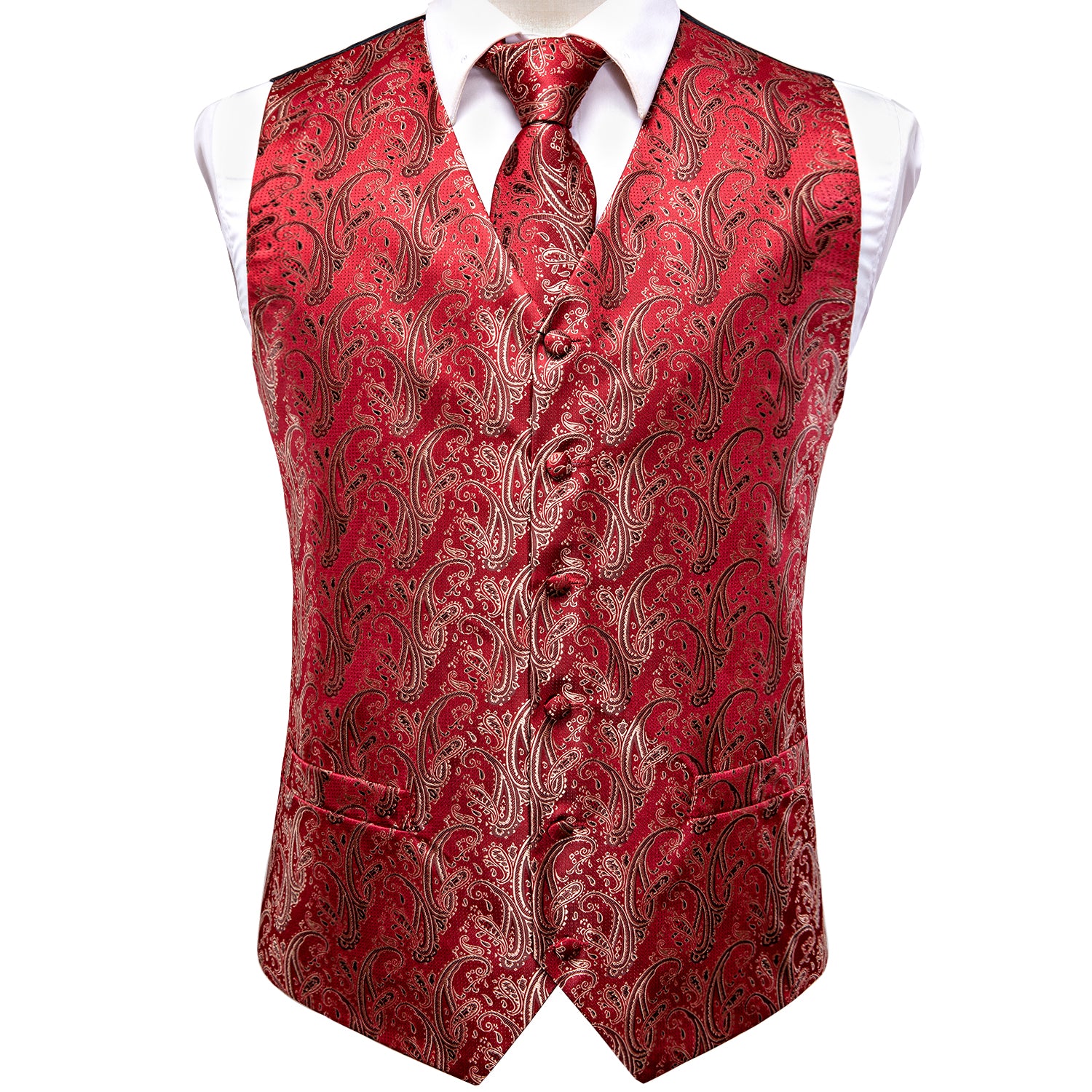 Light Red Paisley Silk Men's Vest Hanky Cufflinks Tie Set Waistcoat Suit Set