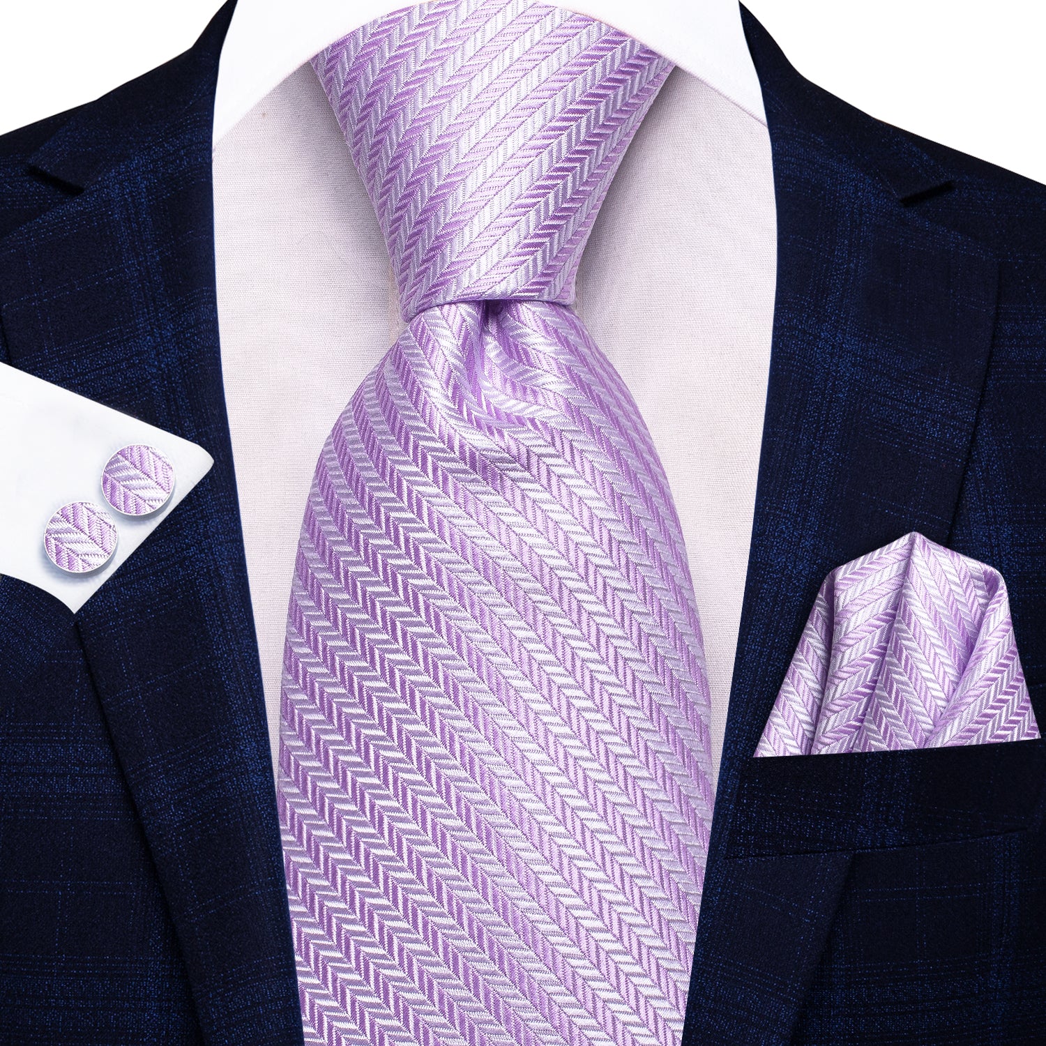 Hi-Tie Lilac Purple Striped 67 Inch Extra Long Tie Hanky Cufflinks Set