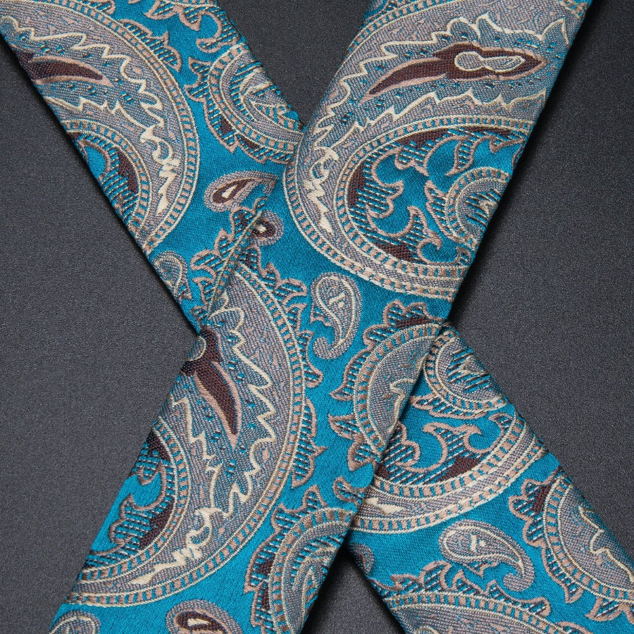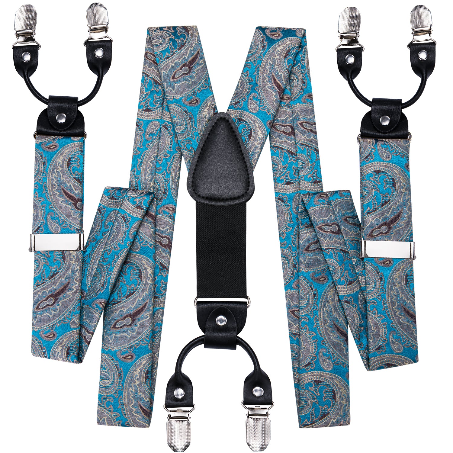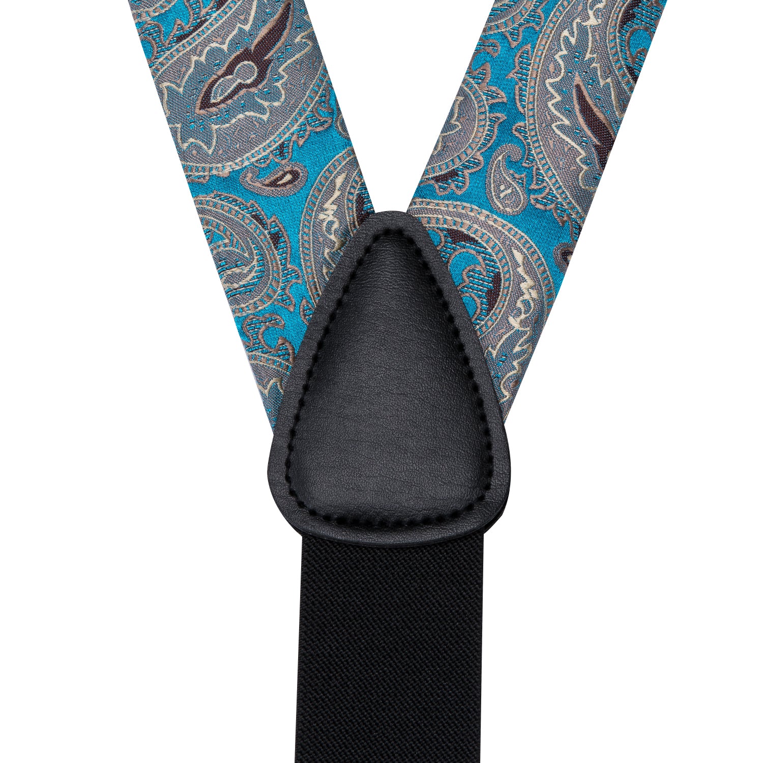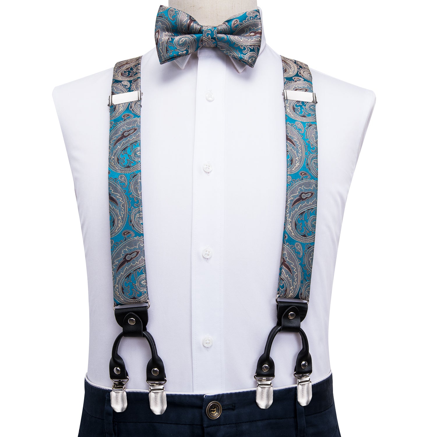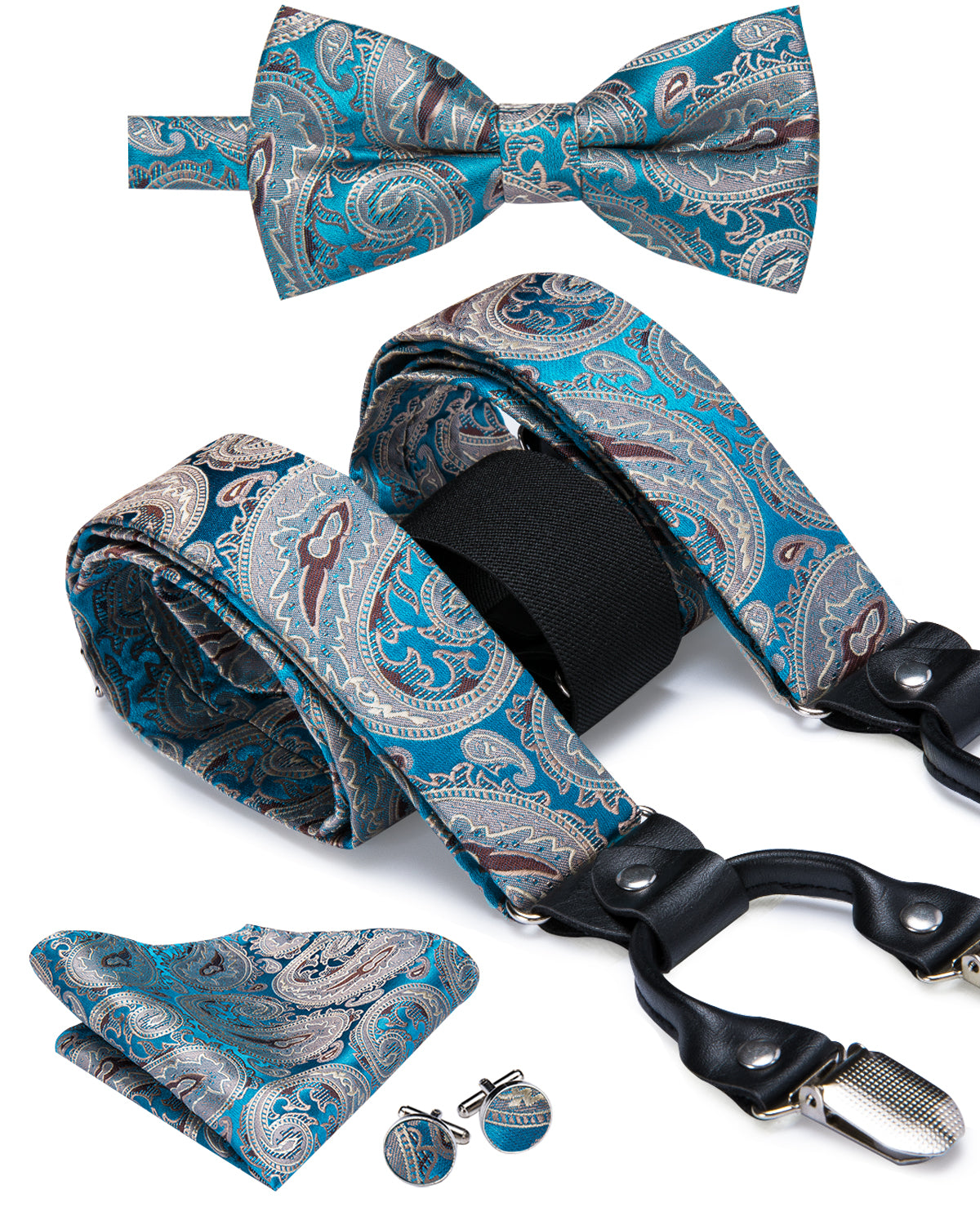 Hi-Tie Luxury Blue Paisley Suspender Bowtie Pocket Square Cufflinks Set