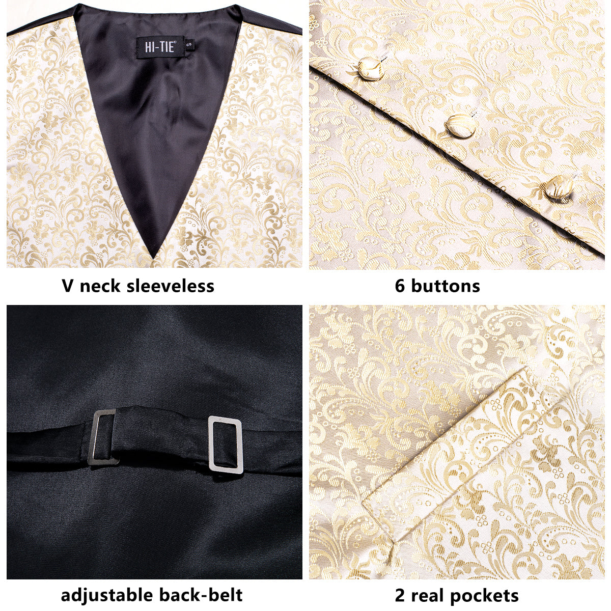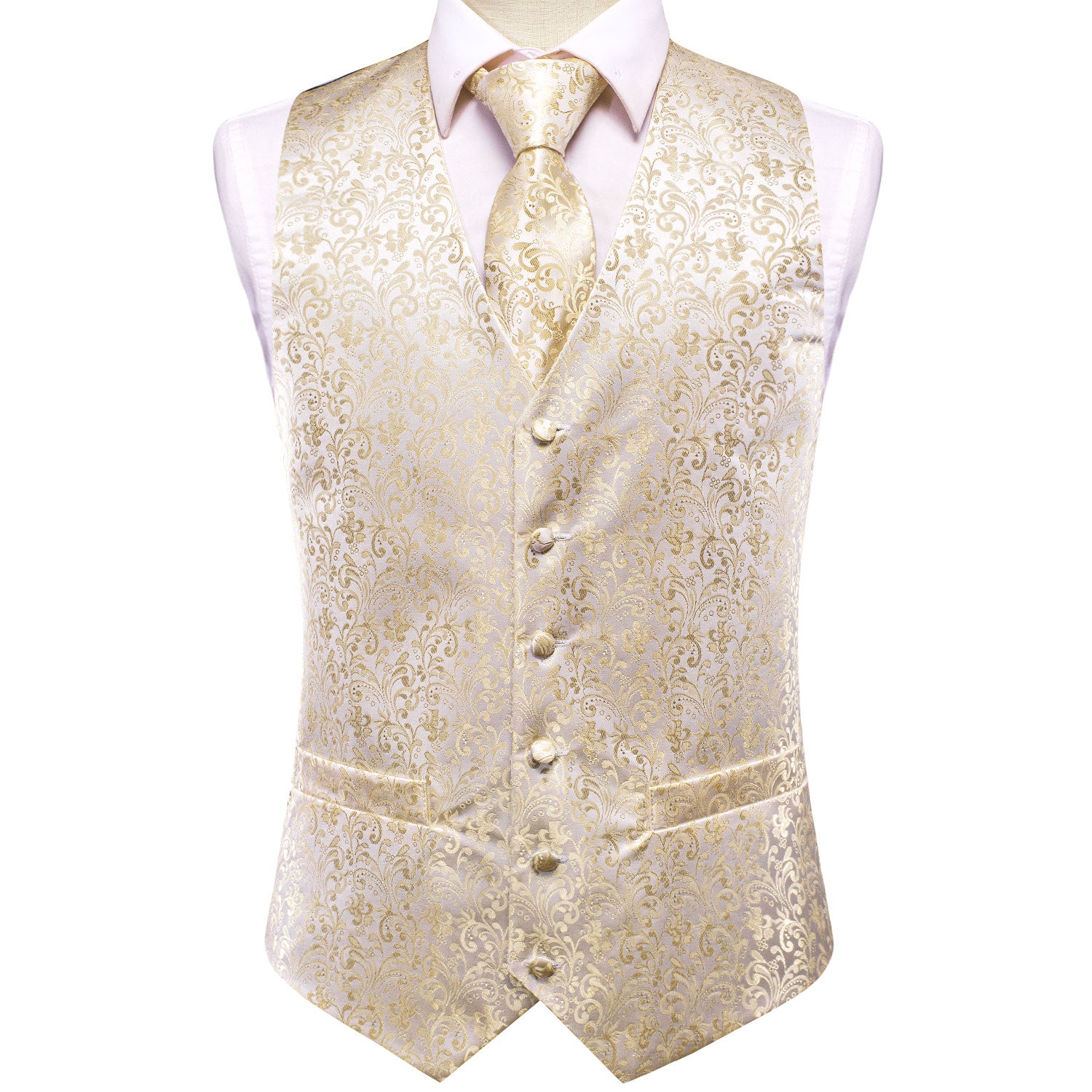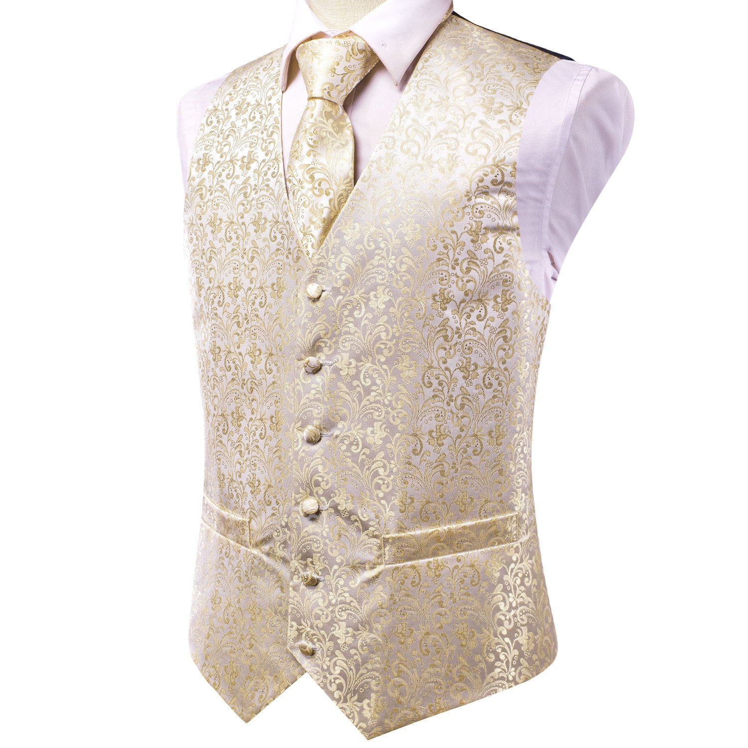 Luxury Champagne Floral Silk Men's Vest Hanky Cufflinks Tie Set Waistcoat Suit Set