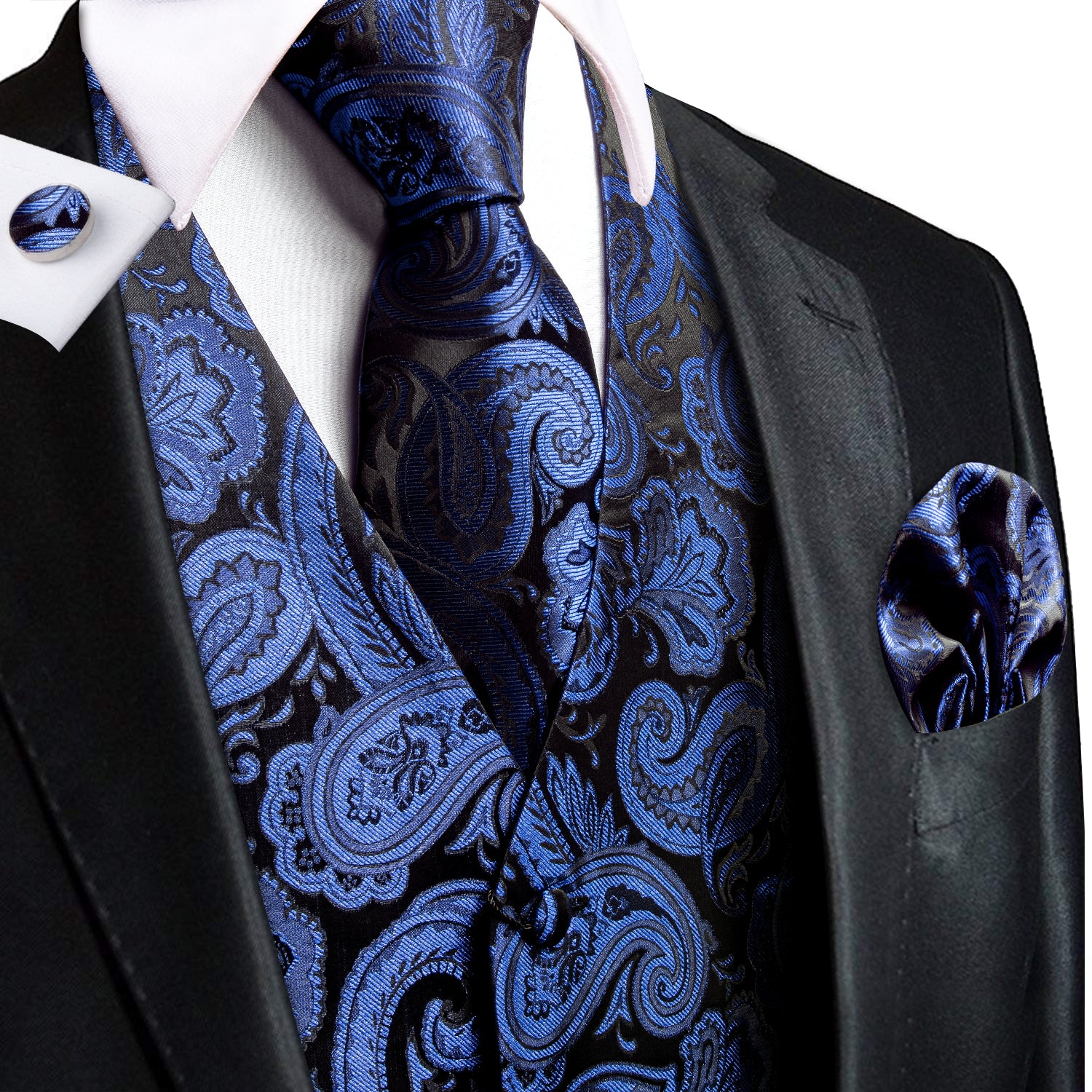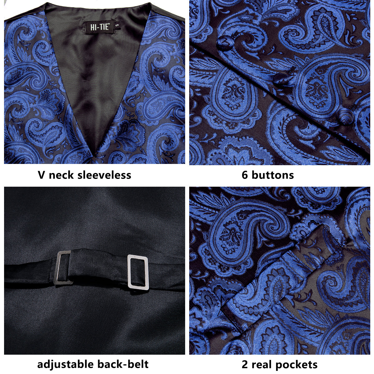 Luxury Deep Blue Black Paisley Silk Men's Vest Hanky Cufflinks Tie Set Waistcoat Suit Set