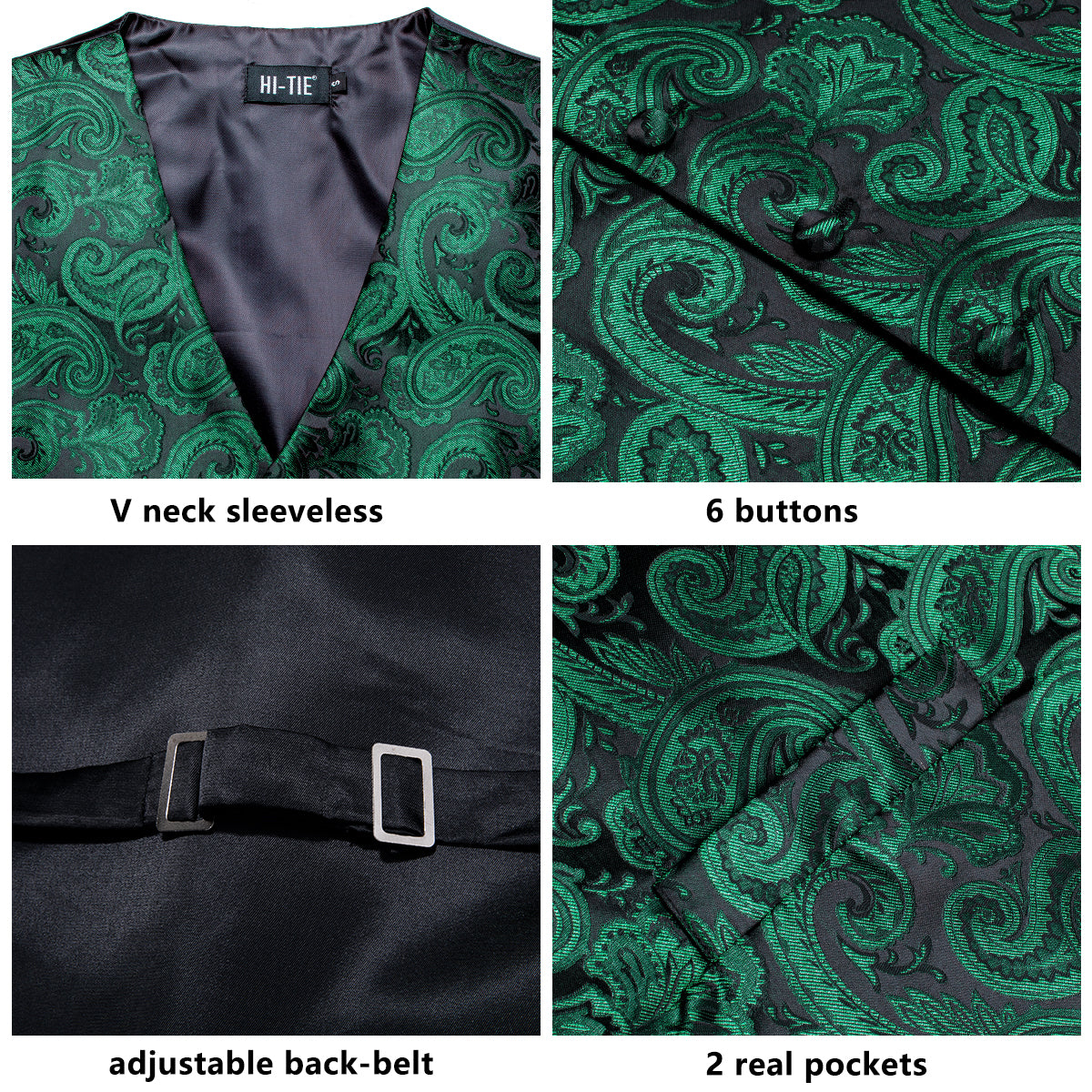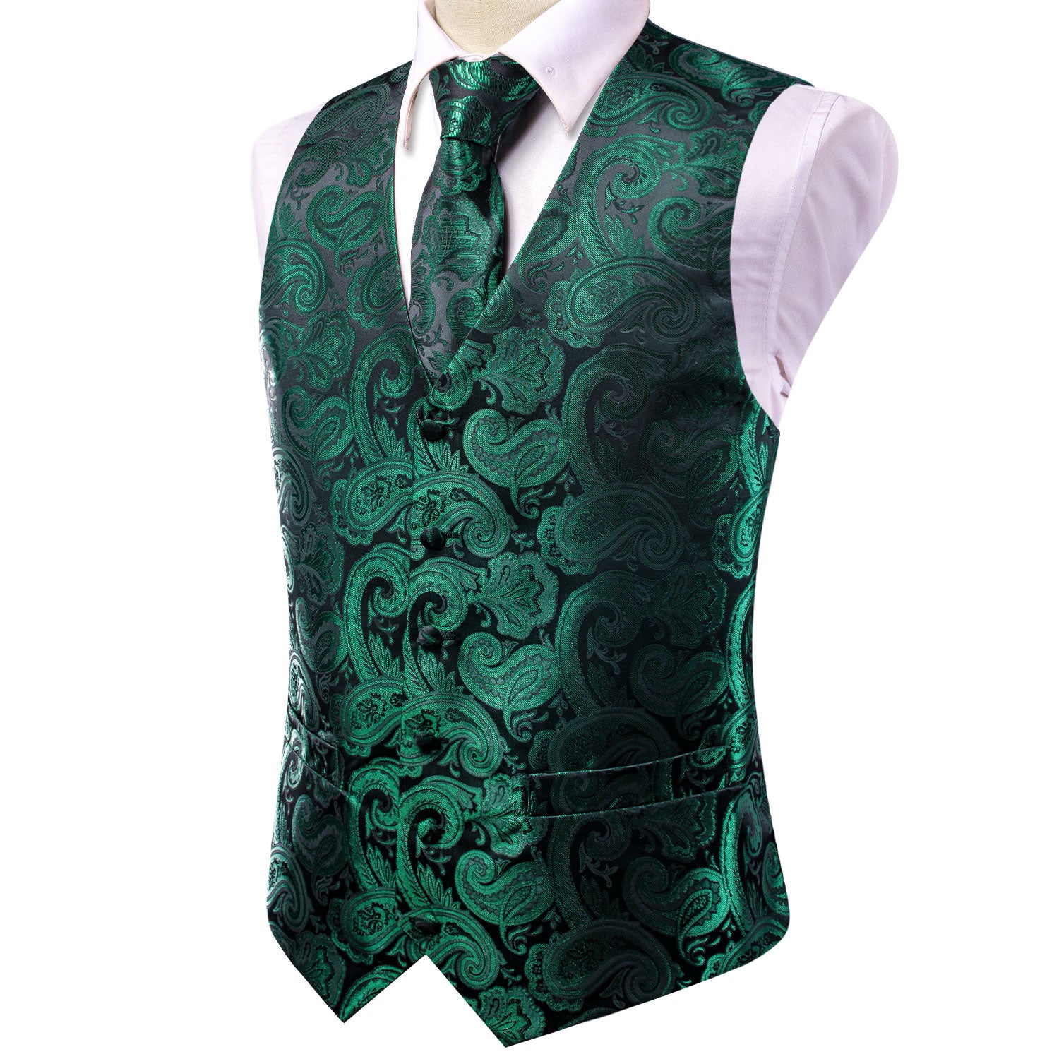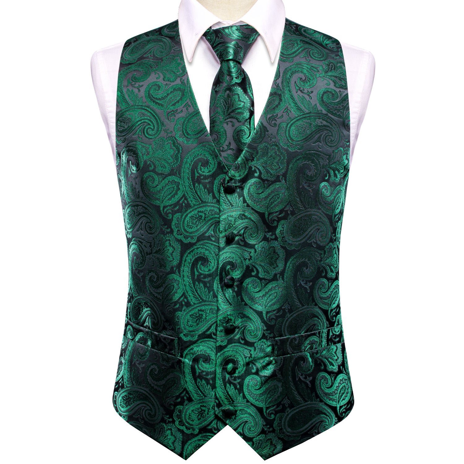 Luxury Emerald Green Paisley Silk Men's Vest Hanky Cufflinks Tie Set Waistcoat Suit Set